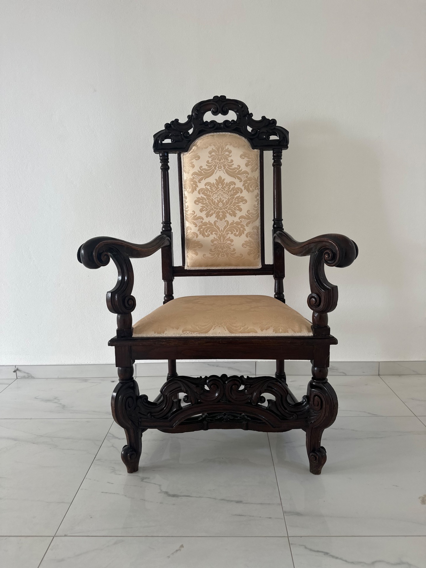 Poltrona in noce Luigi XV di area emiliana bolognese epoca prima metà del’700 con quattro gambe tornite collegate da traversa sagomata con motivo decorativo centrale intagliato , braccioli curvilinei a voluta poggianti su sostegni torniti schienale diritto con due colonnine laterali e cimasa sagomata con motivo intagliato al centro , seduta e parte centrale dello schienale imbottiti e rivestiti di damasco a motivi floreale
