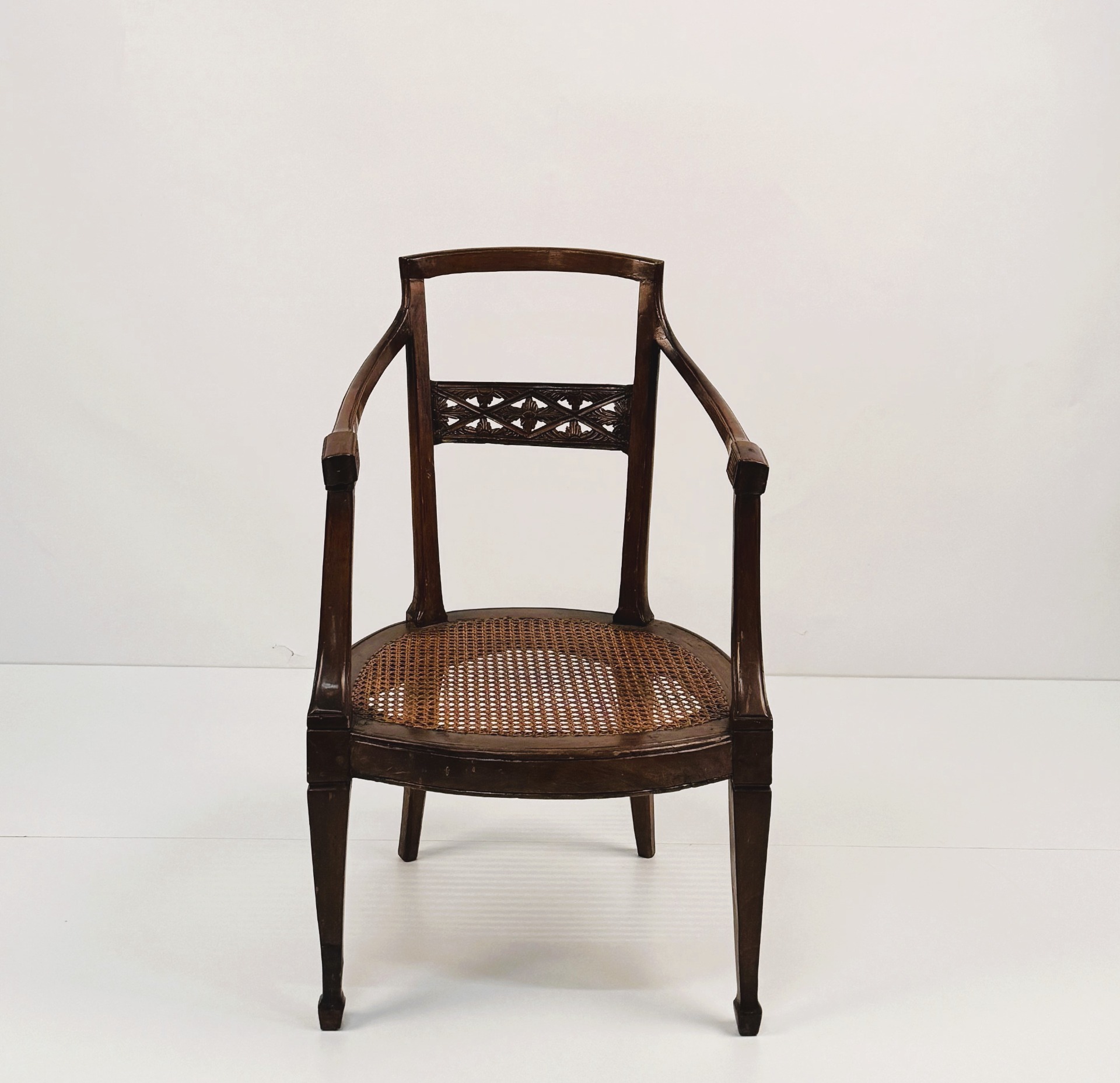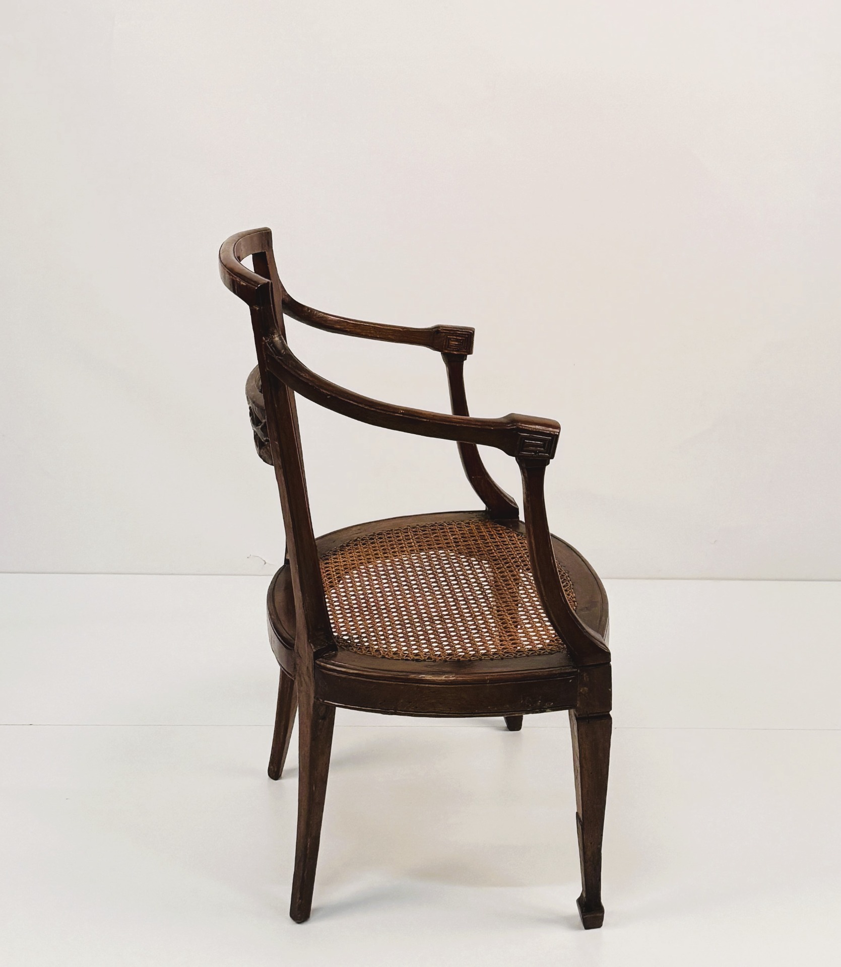 Set of eight walnut chairs, Veneto, late 18th century, open back with central folder carved with foliate motifs within diamonds, shaped armrests and uprights with Greek meander connecting die, truncated pyramidal front legs with pointed foot, cane seat (defects and restorations) cm 86x57x50