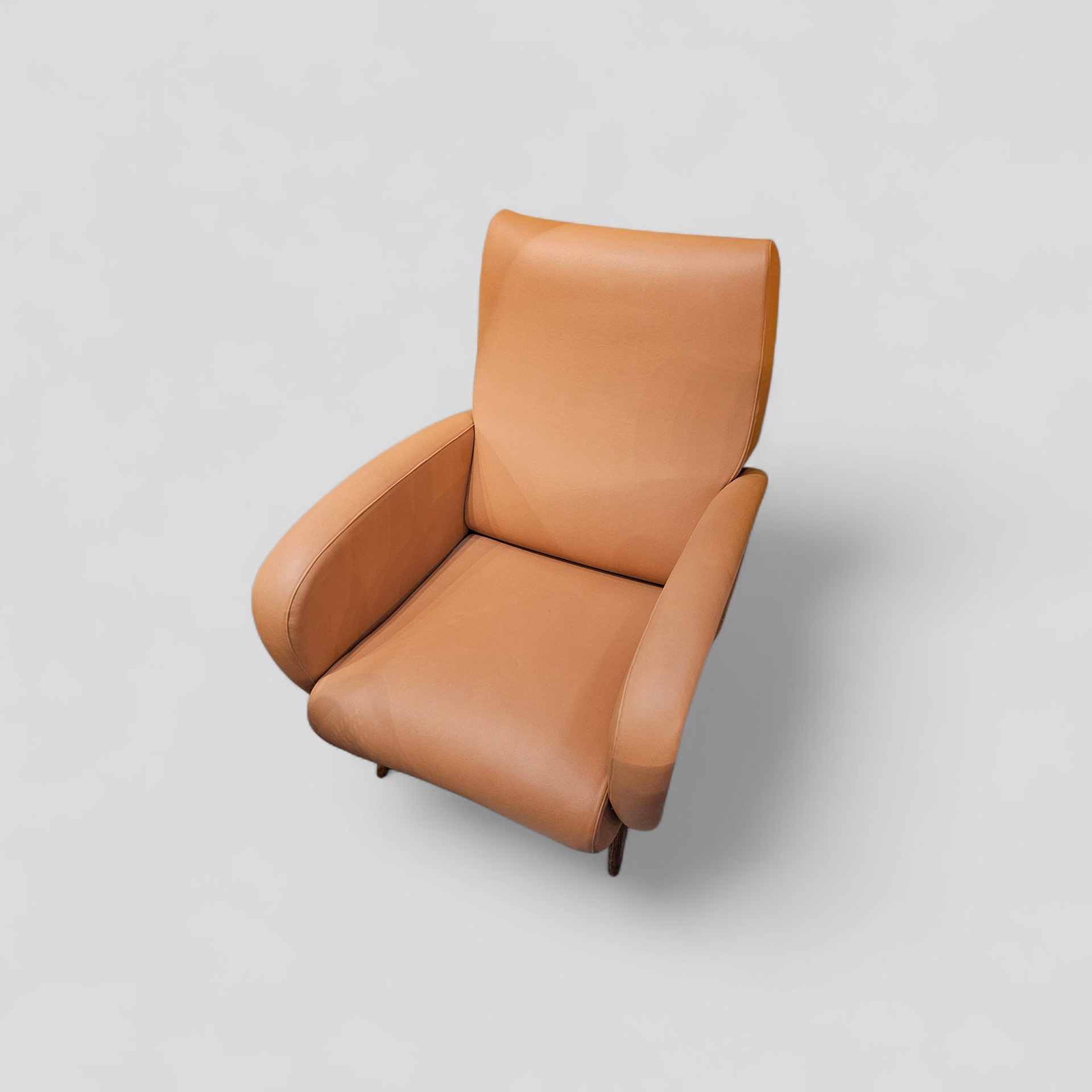 Pair of Zanuso Lady armchairs, reclining. In 'ROSANTICO' colored leather. Flared feet. Measures seventy in width, ninety in depth, and eighty-five in height. From the Fifties.