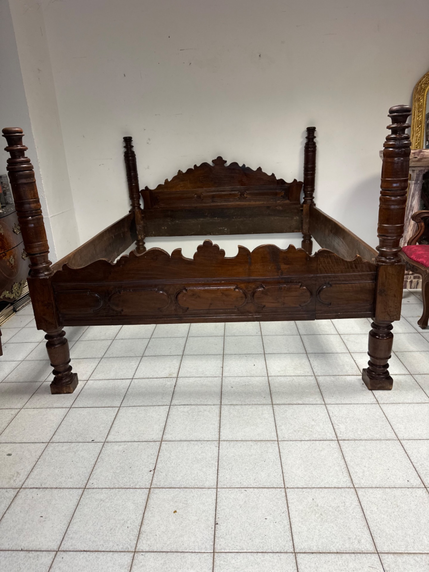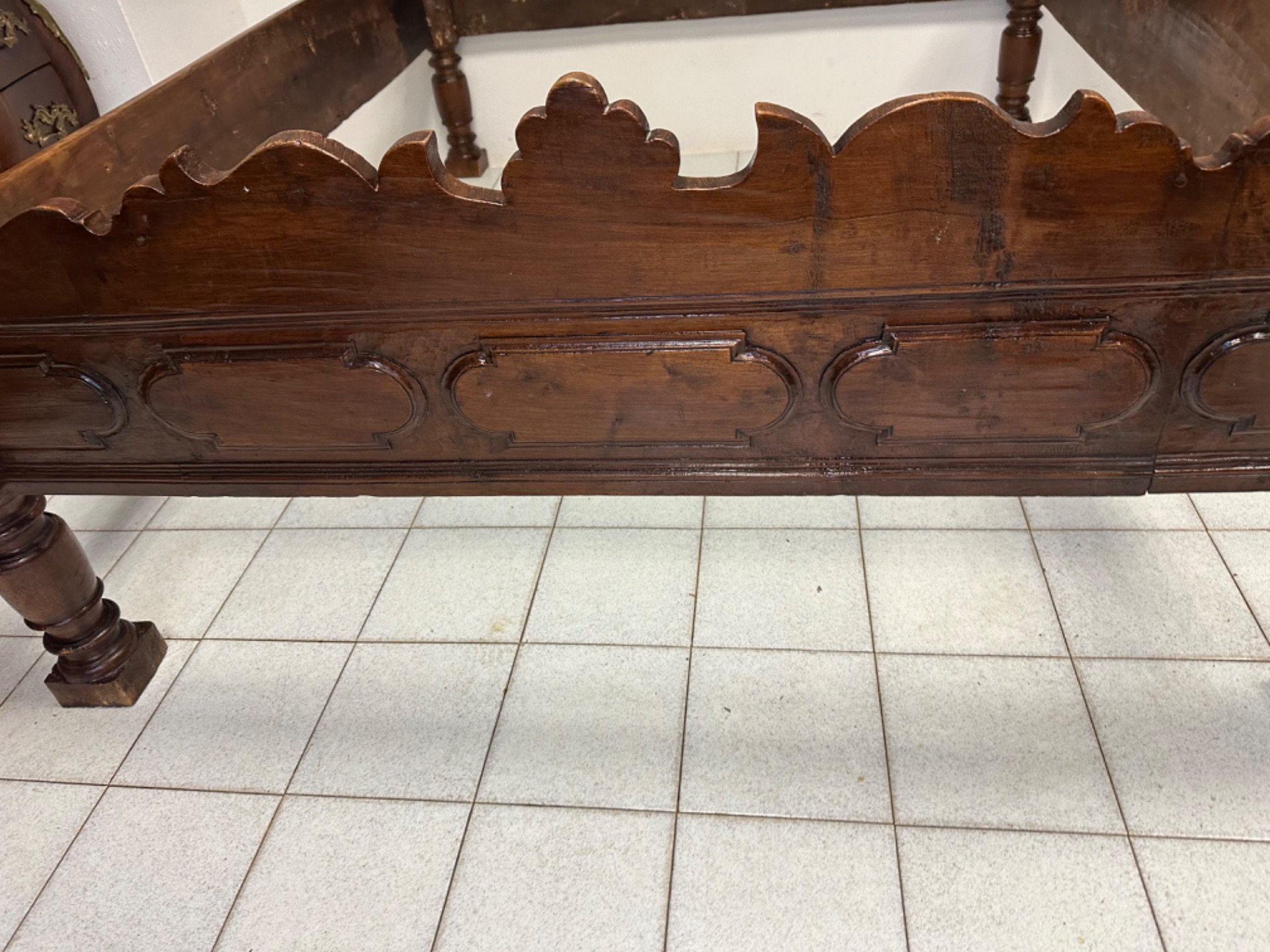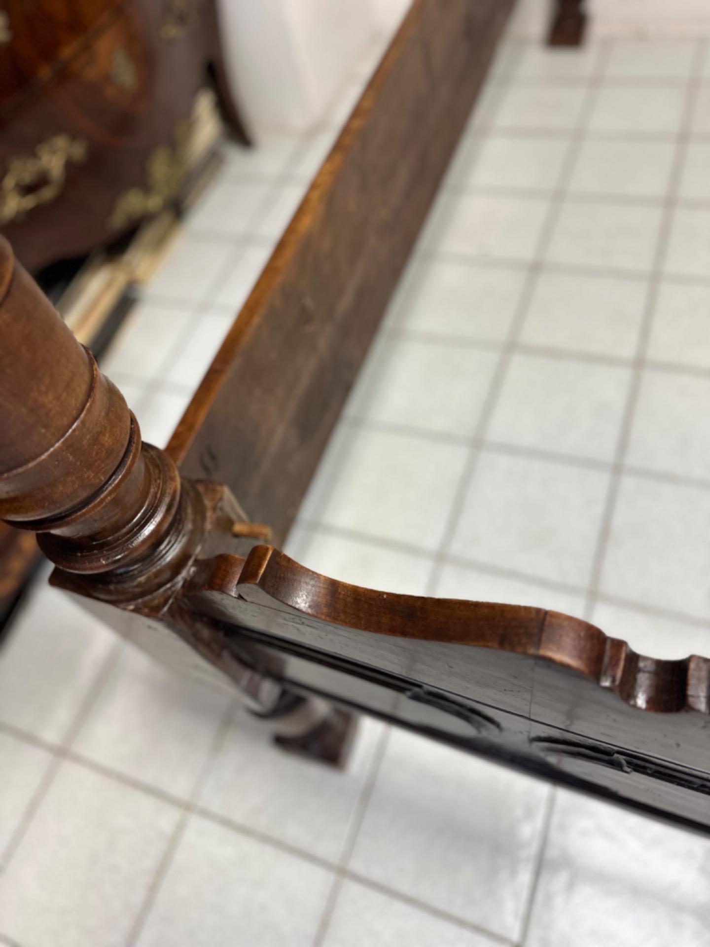 Emilian Bolognese walnut double bed from the full 17th century with carved bossages on the bands, turned columns with square plinth feet, shaped cymatium and footboard.