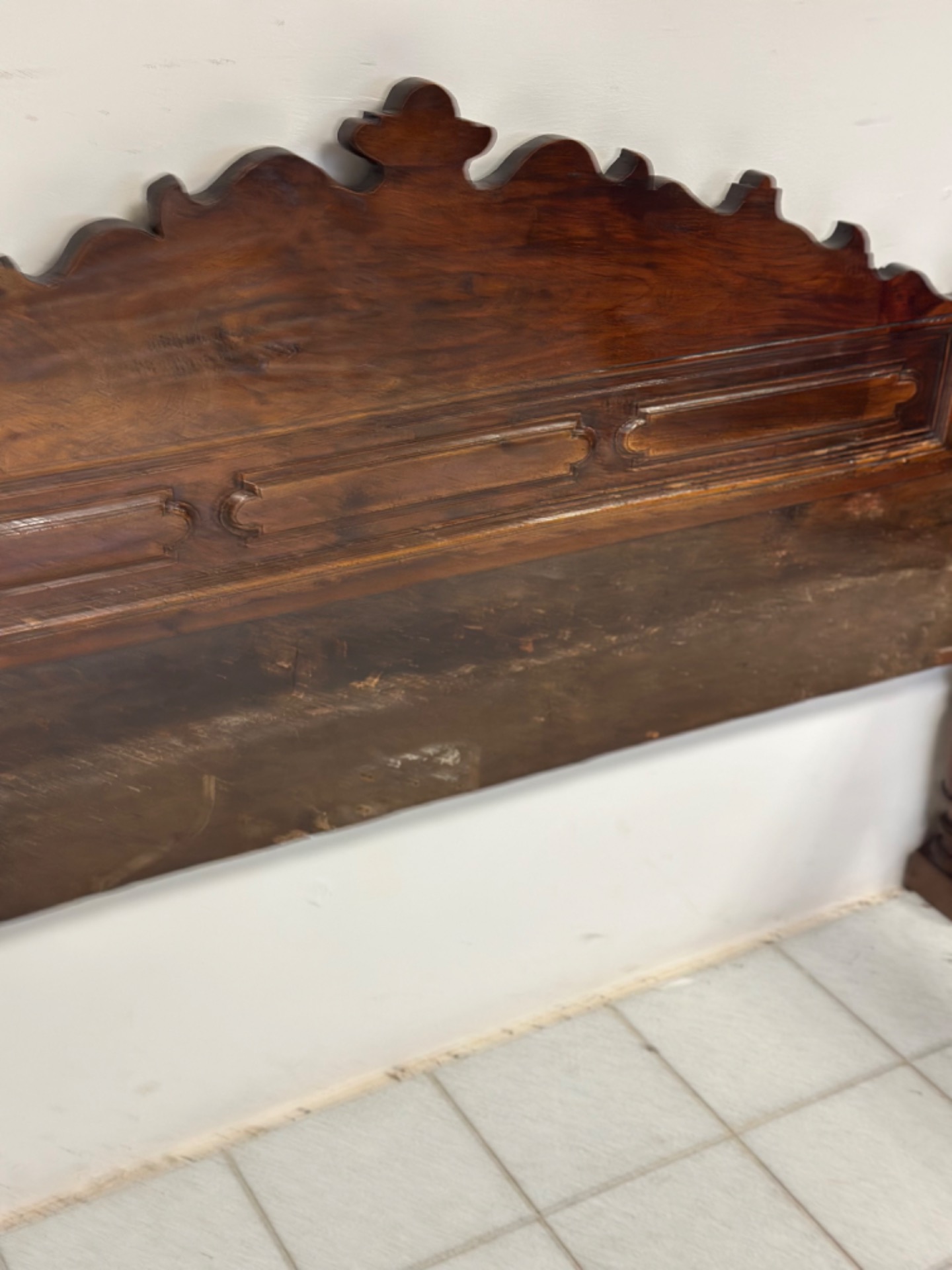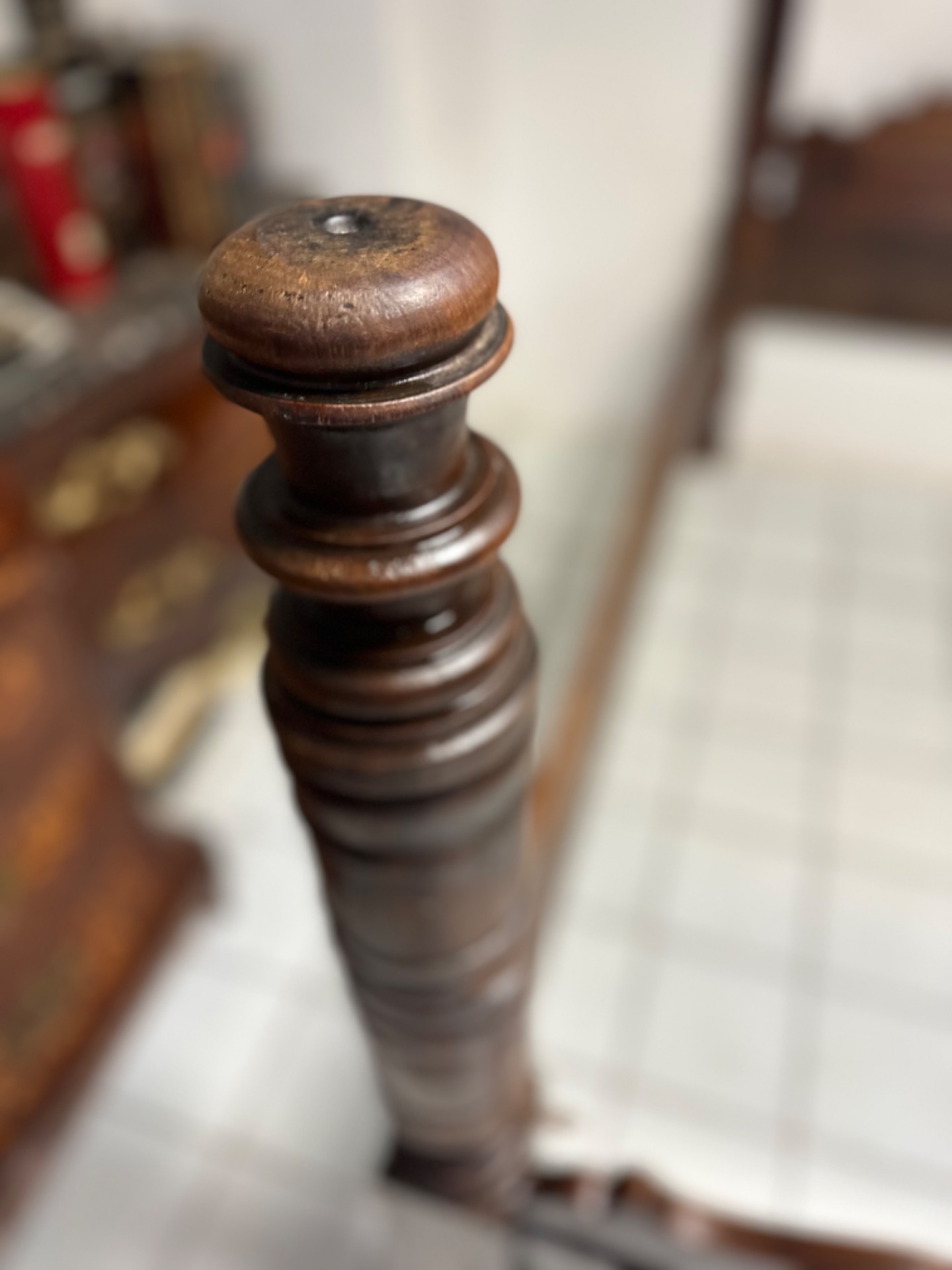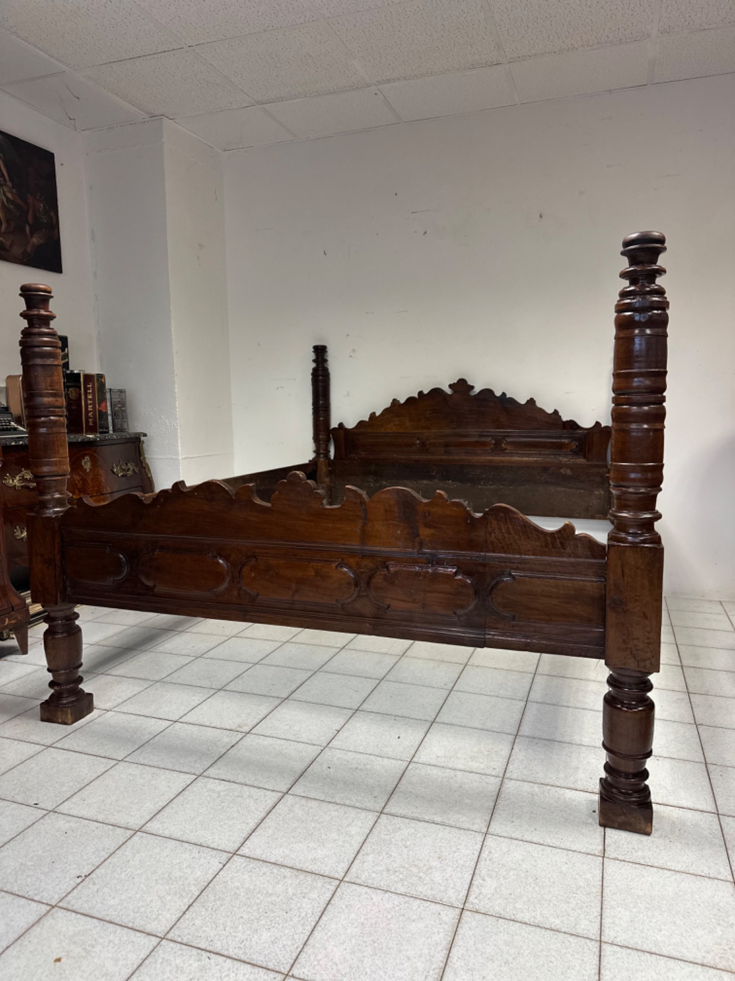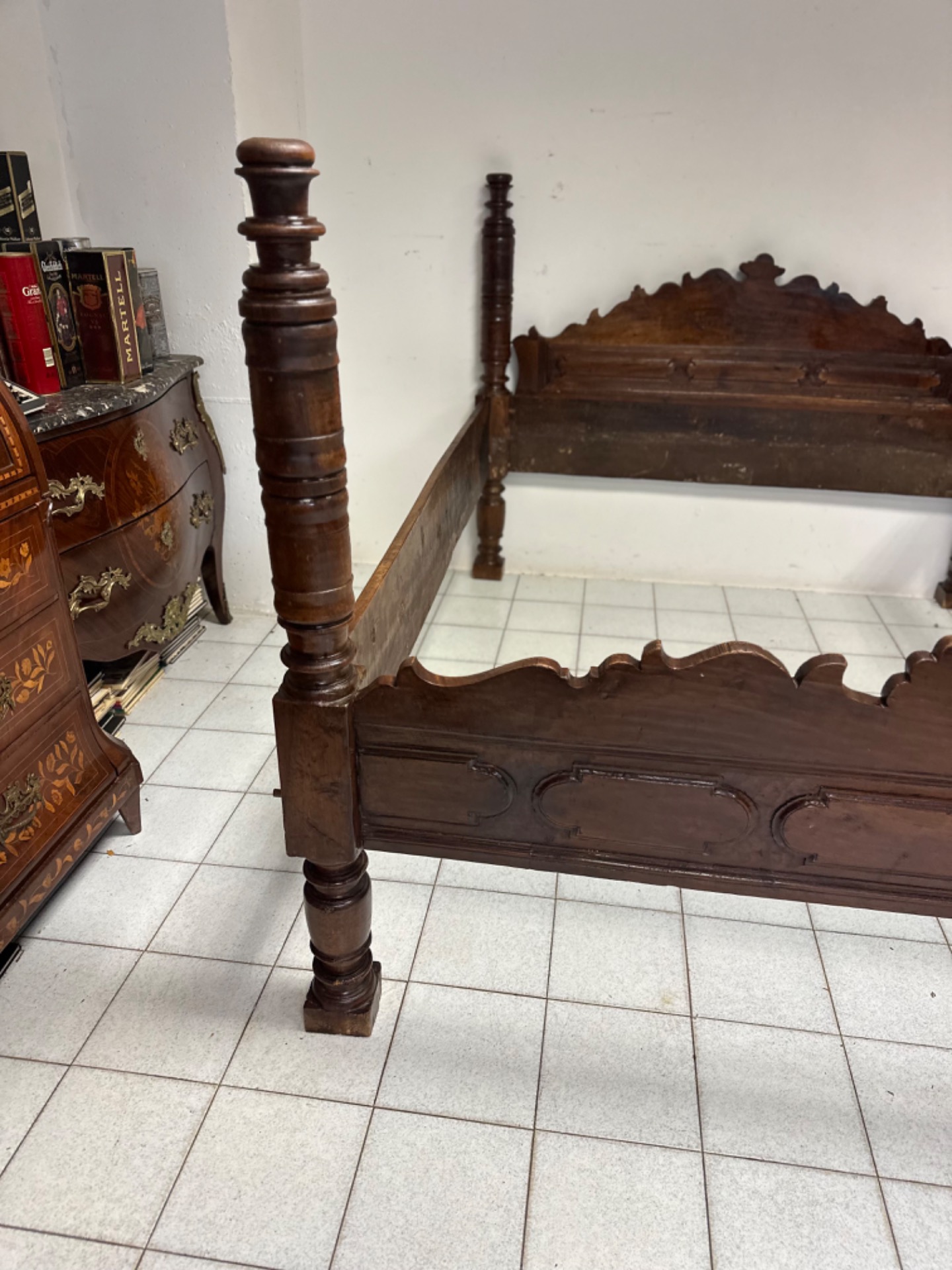 Emilian Bolognese walnut double bed from the full 17th century with carved bossages on the bands, turned columns with square plinth feet, shaped cymatium and footboard.