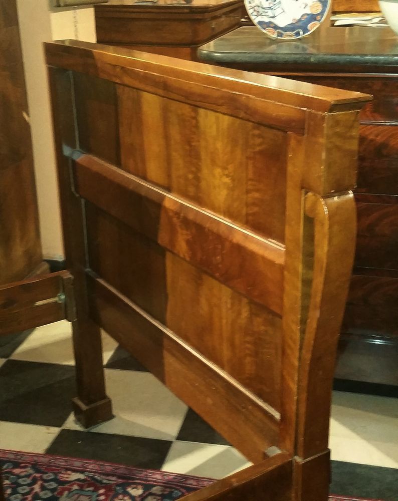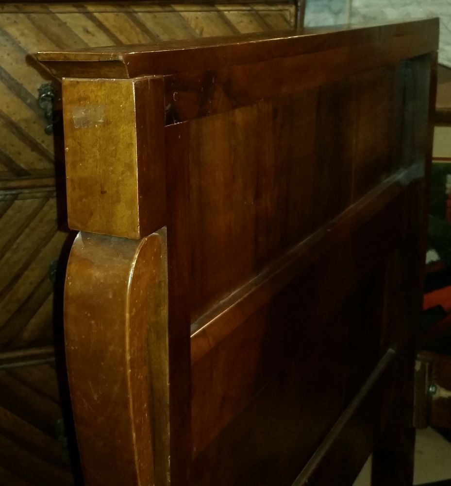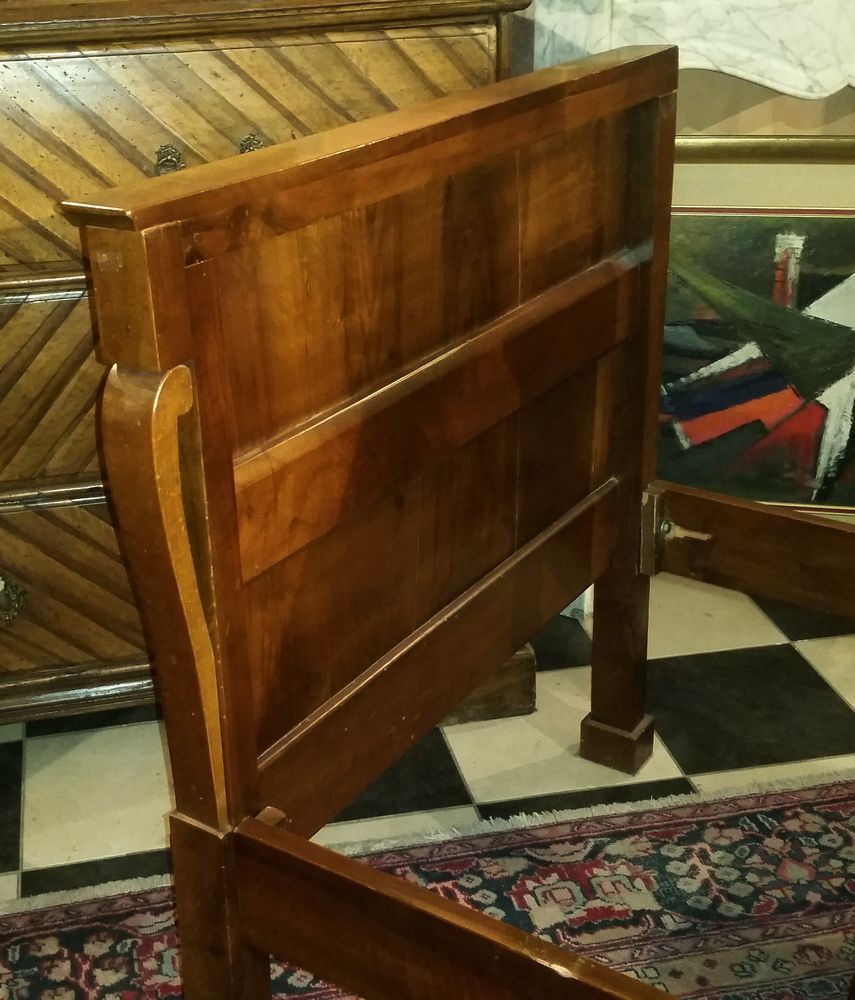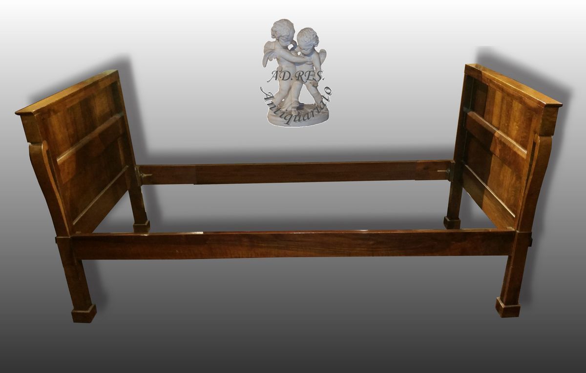 Single bed in solid walnut wood.It has a front part with uprights finished with volute motifs and square plinth feet.