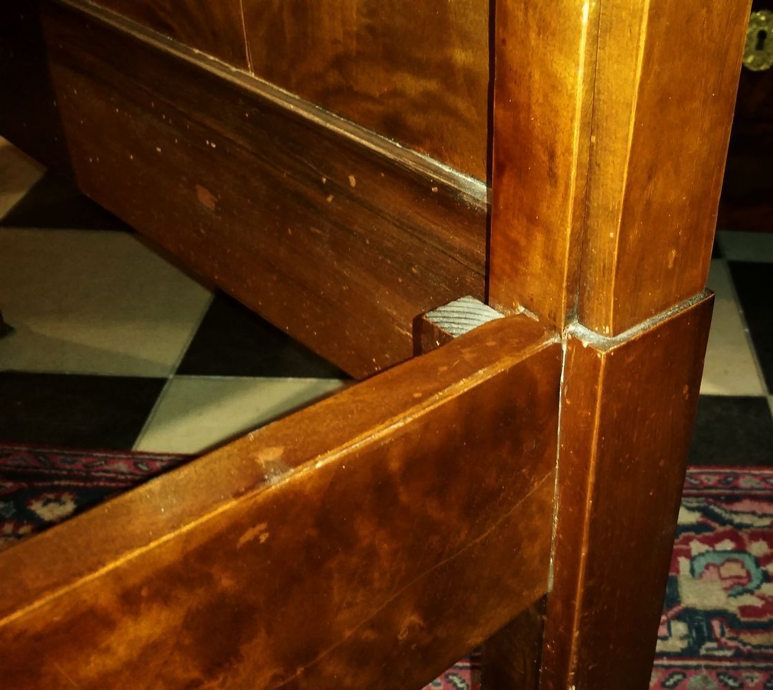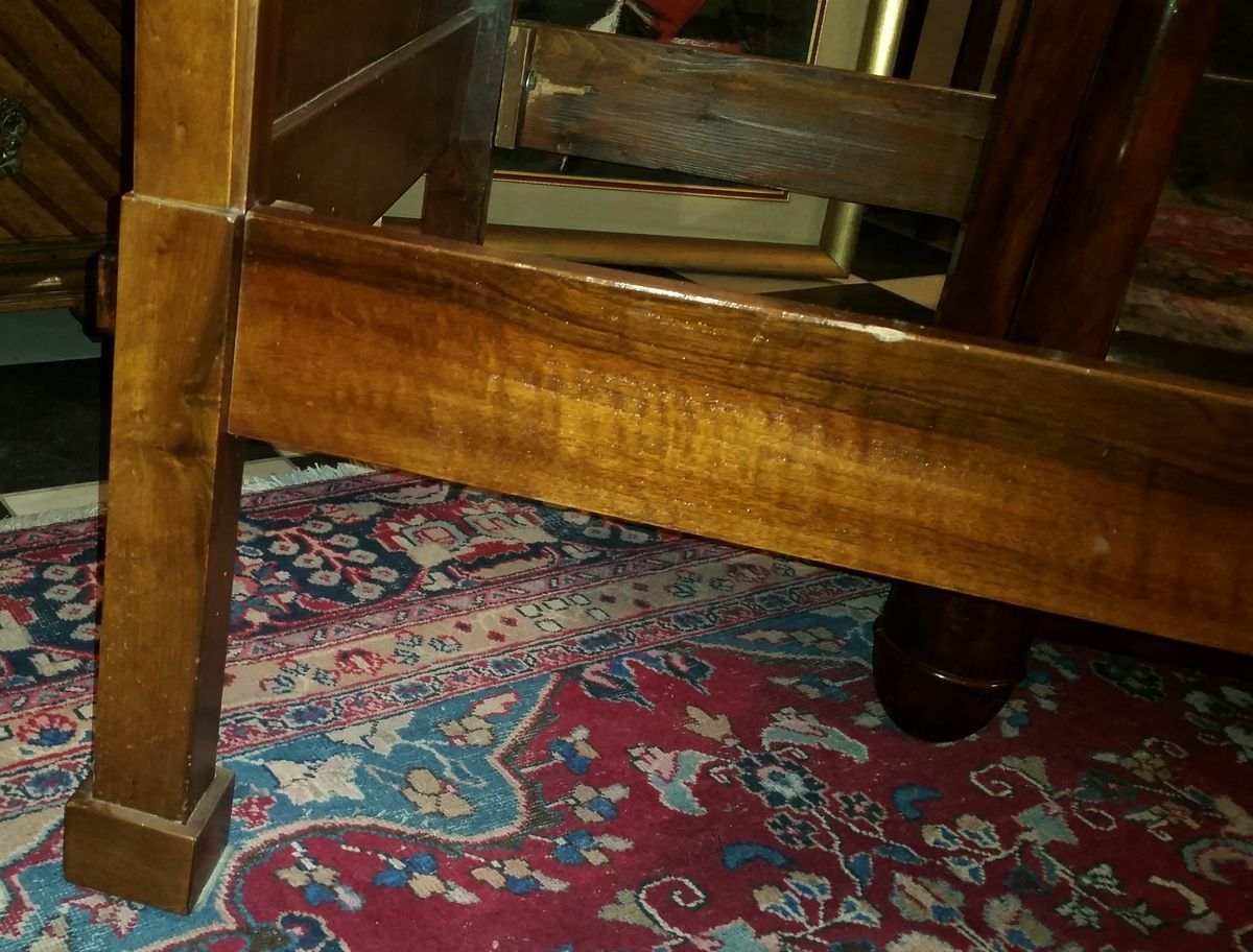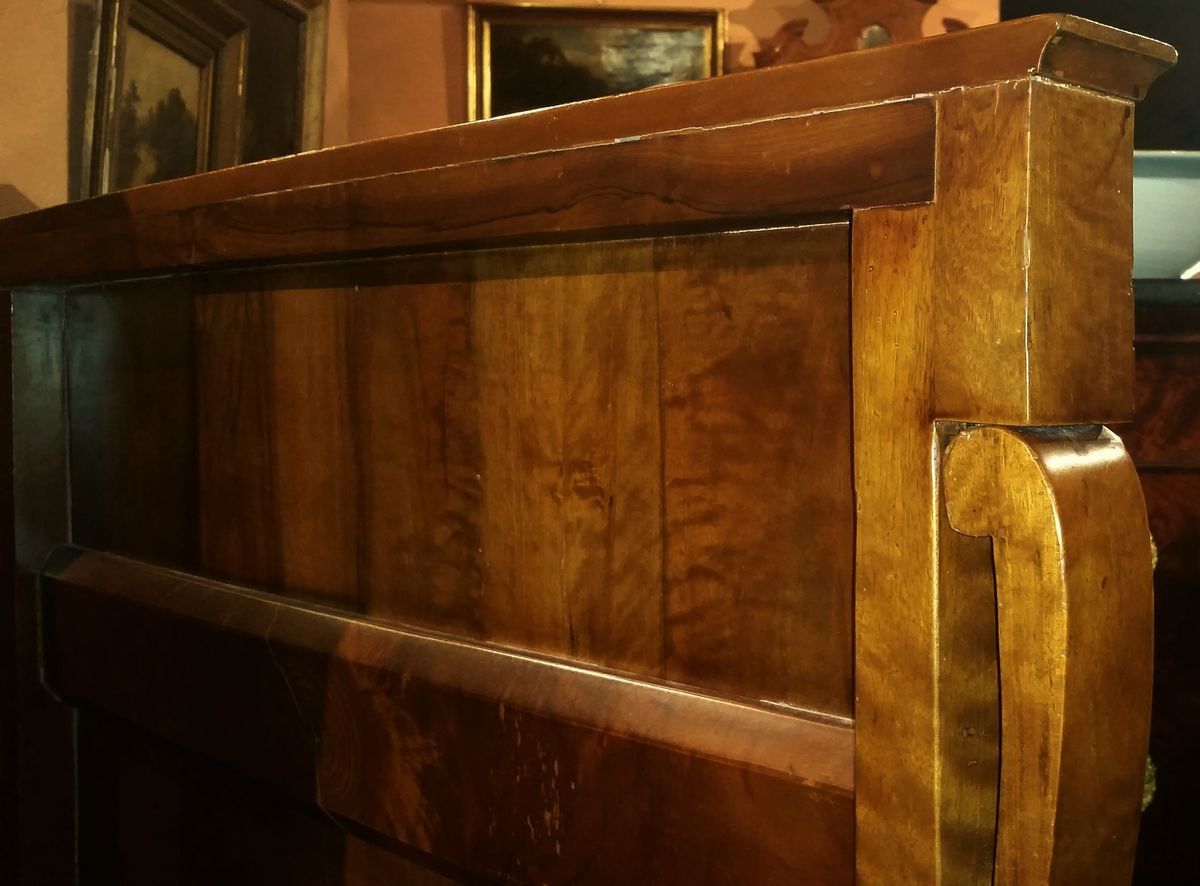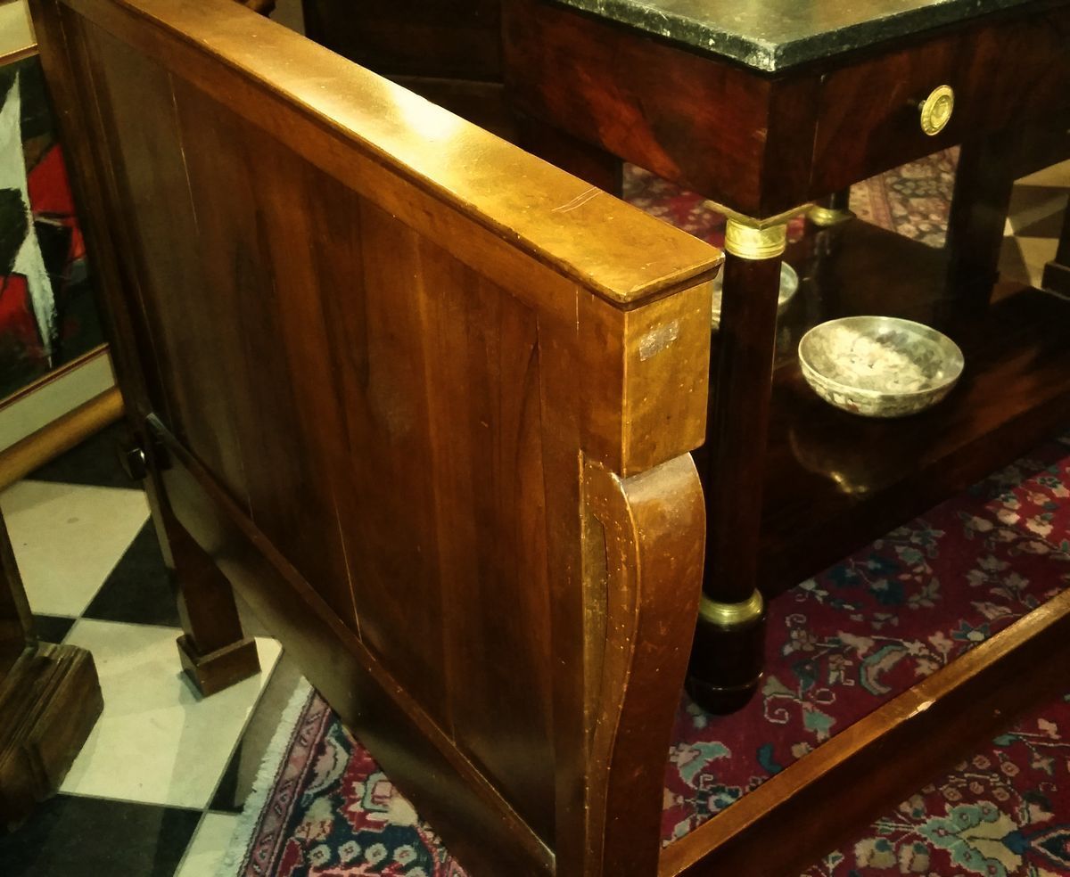 Single bed in solid walnut wood.It has a front part with uprights finished with volute motifs and square plinth feet.