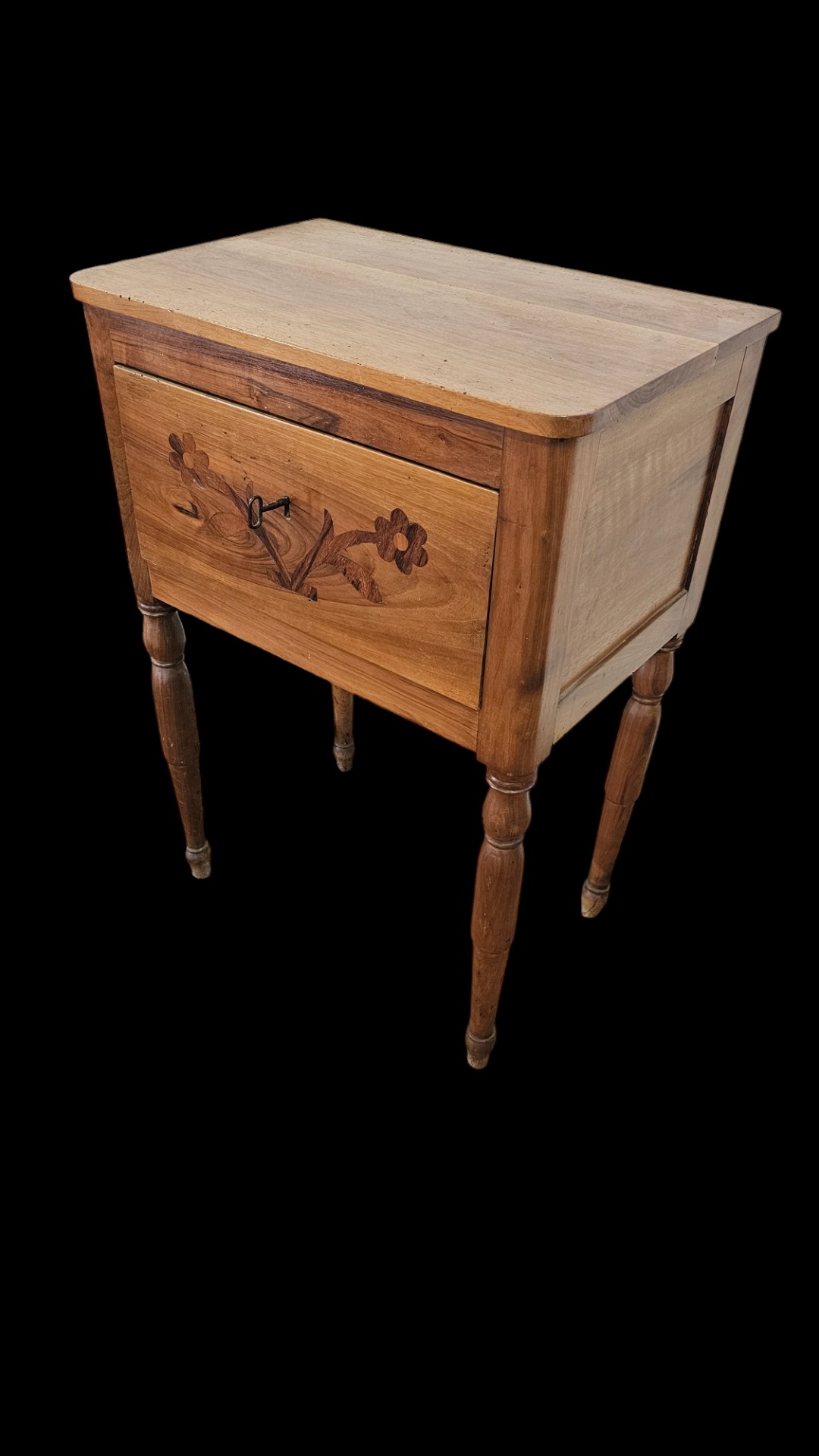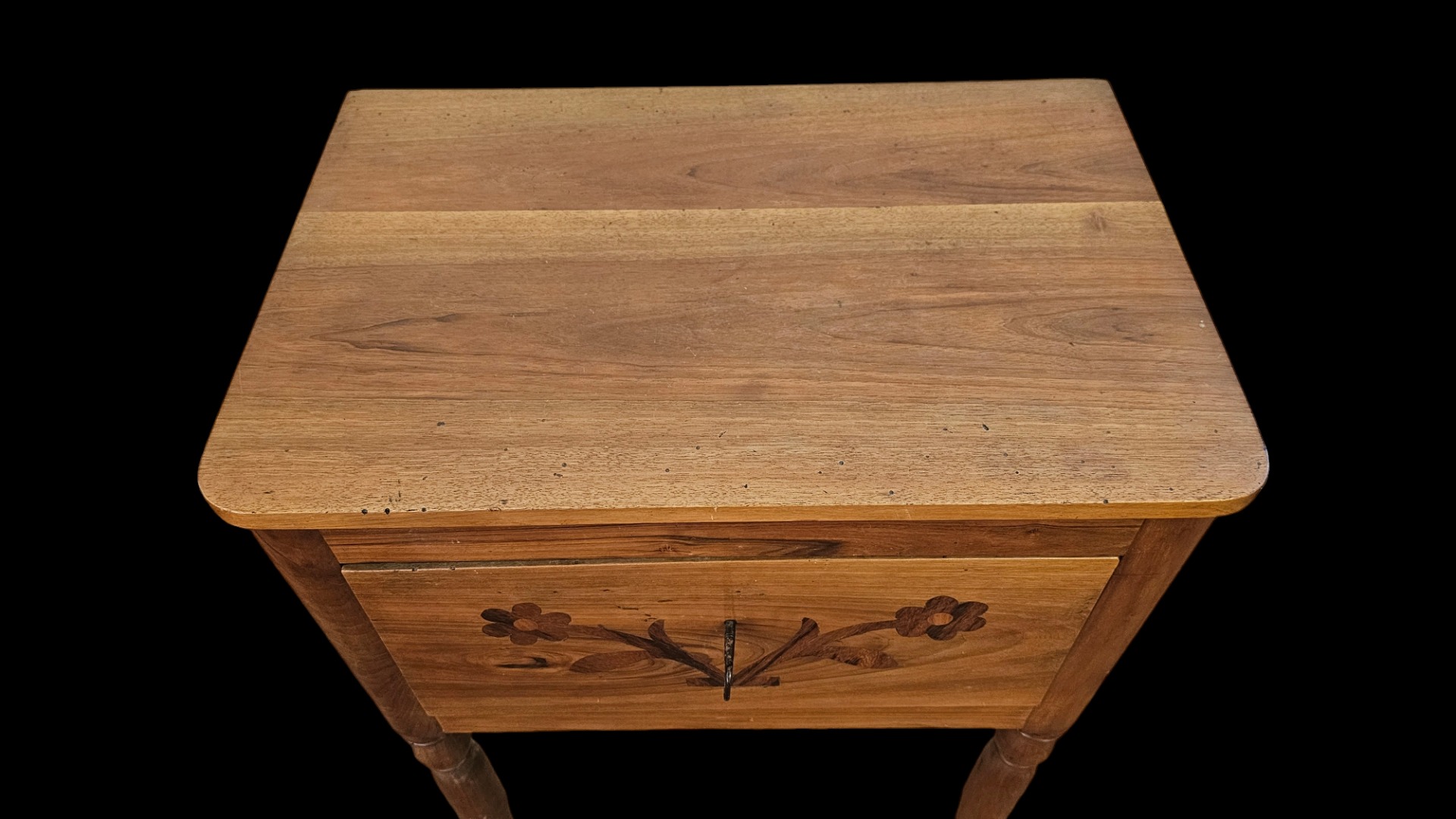 Beautiful walnut bedside table with a central drawer and turned legs. Louis Philippe period, measures 55cm width, 40cm depth, 70cm height, wax finish.
