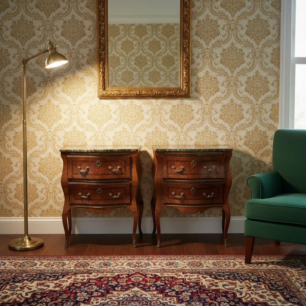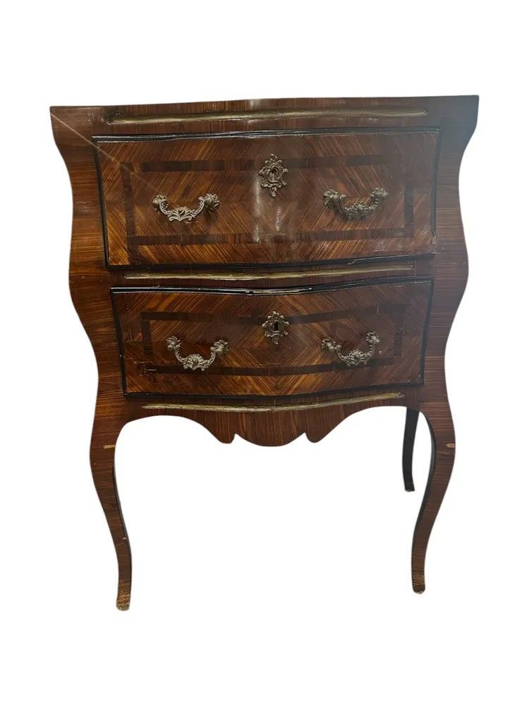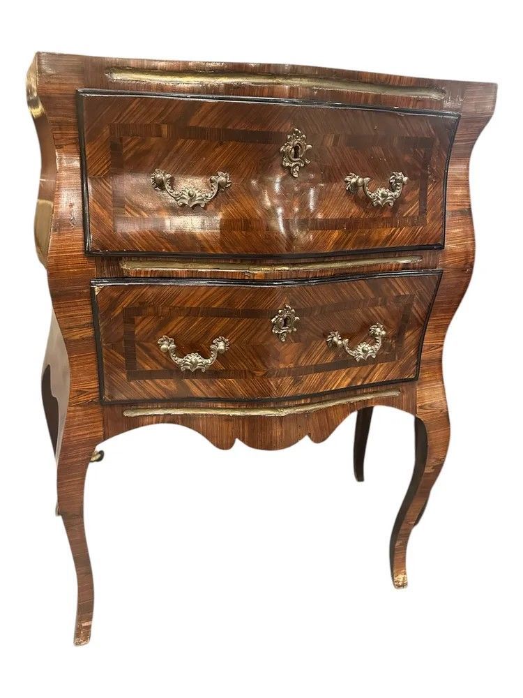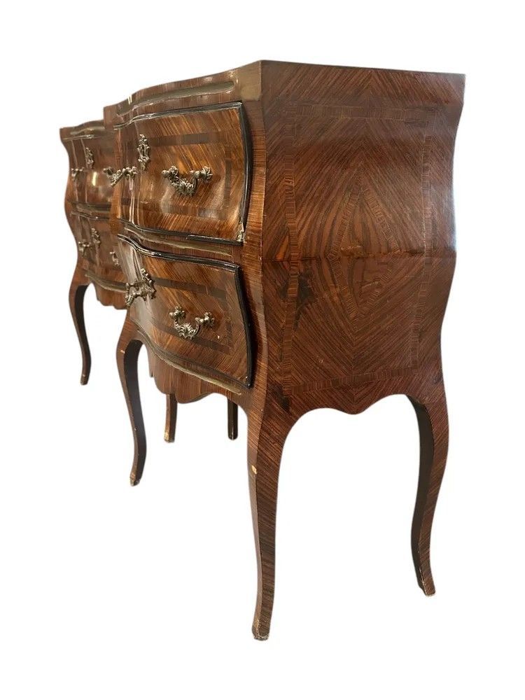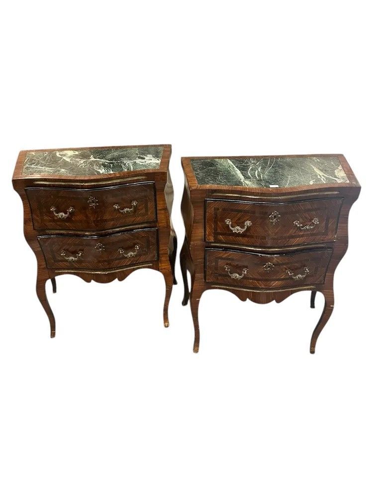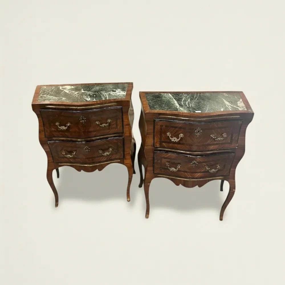 Frutto della raffinata manifattura siciliana di metà XIX secolo, questa straordinaria coppia di comodini in stile Luigi XV incarna la massima espressione del gusto aristocratico mediterraneo. I corpi sinuosi, scolpiti con la classica linea bombata “en arbalète”, sono interamente rivestiti da una preziosa impiallacciatura di ebano a spina di pesce che disegna un magnetico gioco di luci e venature.Il piano sagomato è in raro marmo verde delle Alpi, solcato da venature bianche e grigie che ricordano la schiuma marina. Il profilo fresato segue la morbida onda del fronte, garantendo leggerezza visiva e protezione al legno.Dettagli di pregioDue cassetti ampi per ciascun mobile, scorrevoli su guide originali e foderati in abete.Placchette, bocchette e maniglie in bronzo dorato finemente cesellato a motivi rocaille.Filettature in bois de rose che incorniciano i pannelli frontali.Gambe cabriole slanciate terminate da sabots in bronzo.Fondo sagomato con grembiale intagliato che alleggerisce la vista frontale.Misure: H 78 cm | L 65 cm | P 34 cm.Lucidati a tampone con gommalacca, questi comodini hanno beneficiato di un restauro conservativo che preserva la patina originaria senza snaturarne l’anima. Perfetti in camera da letto, raffinati in un ingresso o ai lati di un divano, portano negli interni di oggi l’eleganza senza tempo del Rococò francese riletto dall’estro isolano.Scegliere questa coppia significa accogliere un pezzo unico di storia, capace di dialogare con ambienti classici e contemporanei con identica, magnetica personalità.Stile: Luigi XV Materiale: LegnoAltezza (cm): 78Larghezza (cm): 65Profondità (cm): 34Epoca: XIX Secolo - 1800