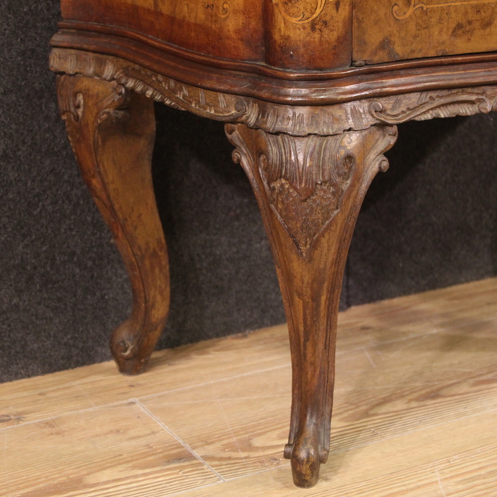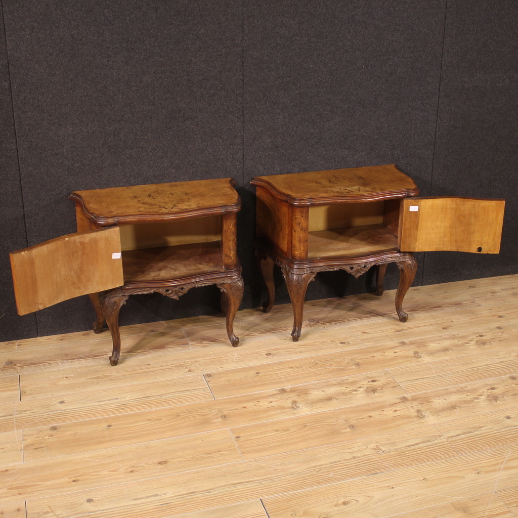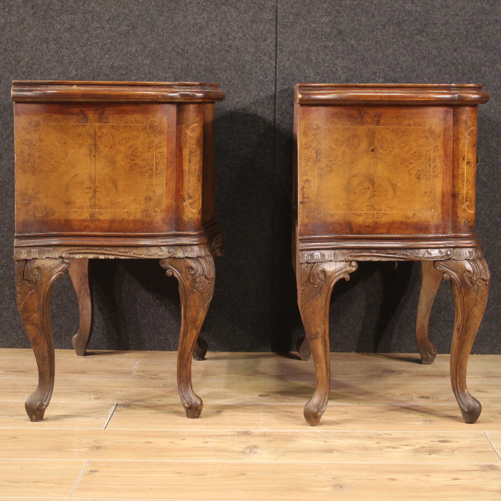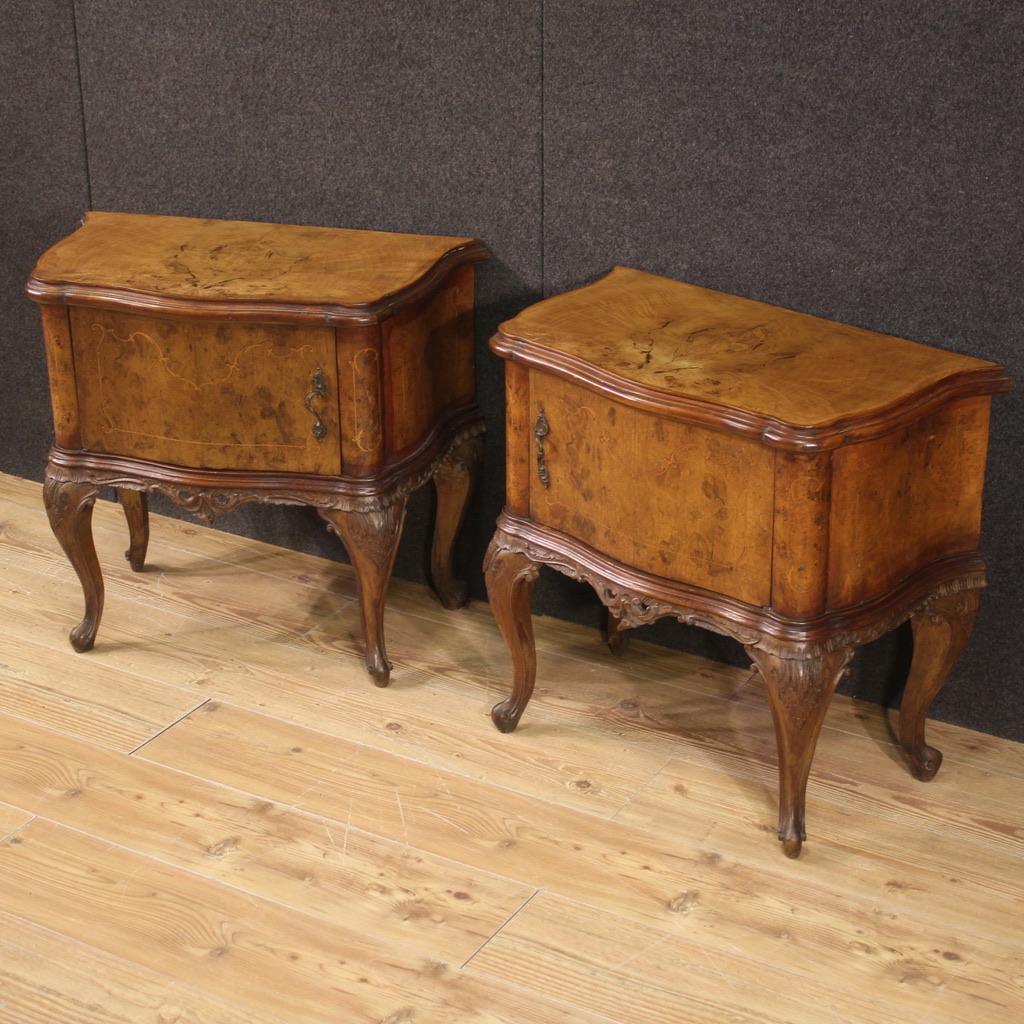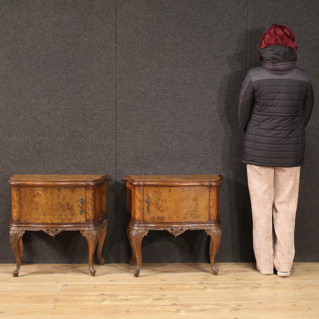 Pair of Italian bedside tables from the mid-20th century. Wavy and rounded furniture inlaid and veneered in burl, maple, beech and fruit wood. Bedside tables of particular size and proportion equipped with a front door and wooden top in character of good measure and service. Pleasantly furnished bedroom or living room tables, for antique dealers and interior decorators. Fairly large furniture with finely chiseled wooden base and legs with curly feet (see photo). Night stands that show some small signs of wear, overall in good state of conservation.