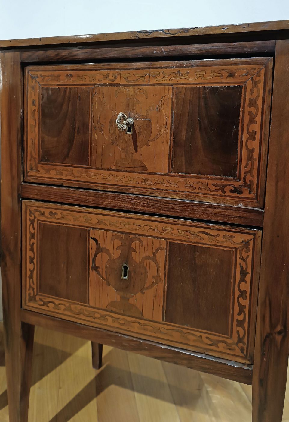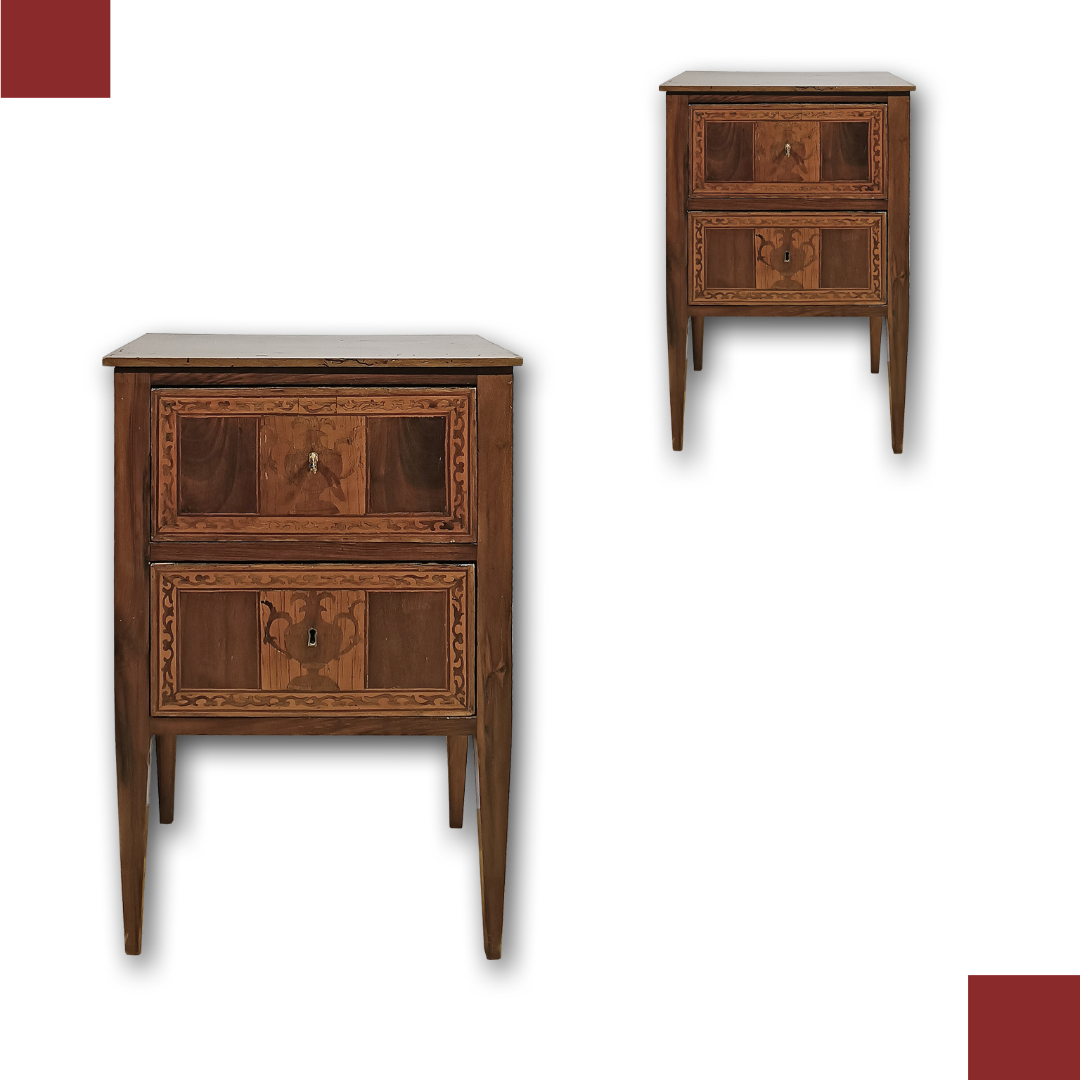 Elegant pair of bedside tables in solid hand-carved walnut, embellished with threads and geometric inlays made with fruit woods. The bedside tables are distinguished by their truncated pyramid legs, characteristic of the period, and have two ergonomic drawers, ideal for storing objects, which can be opened with bronze keys. Their particularity lies in the refined inlays present on both drawers on the front, with geometric frames and vegetal scroll motifs, in the center of which is a delicate amphora which adds further elegance. Spirit polished, these bedside tables represent an example of great taste and elegance, capable of furnishing any environment with class. Tuscan manufacture of the neoclassical period, around the end of the 18th century.