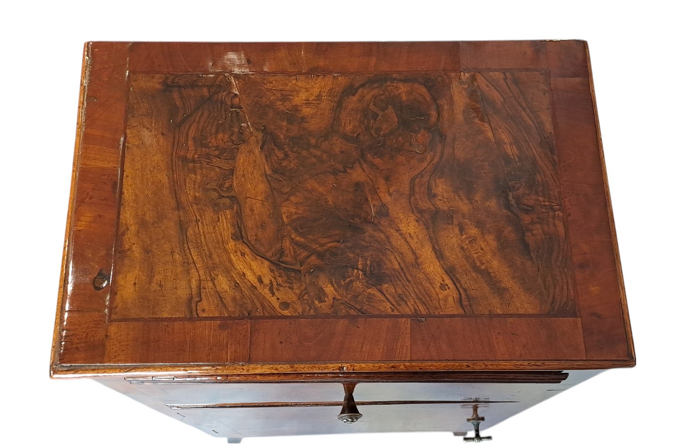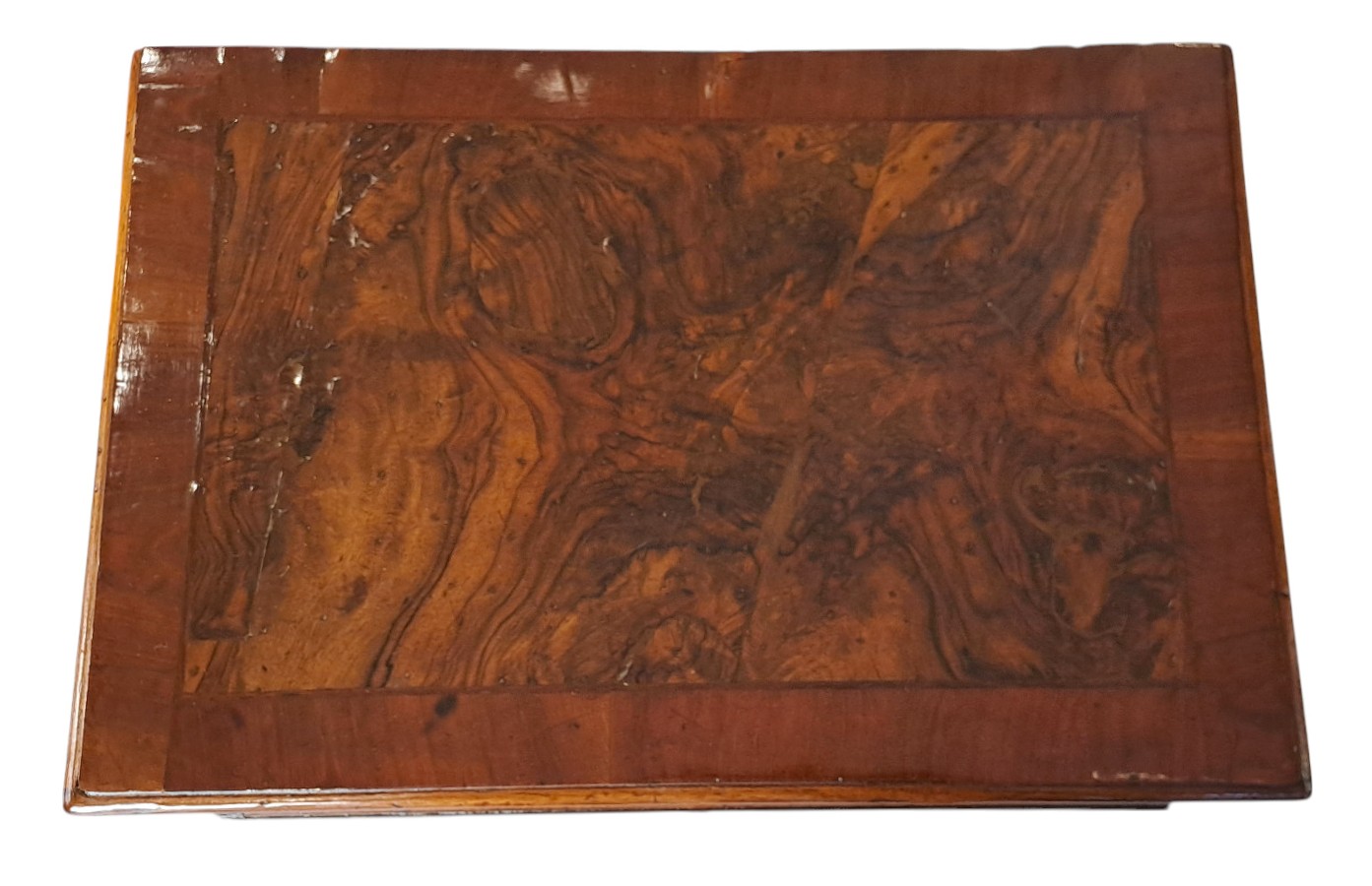 The visible surfaces, including the top, the drawer front, and the door panels, are finely veneered with carefully selected walnut and cherry root panels, arranged to create refined grain patterns ("book-matched" or "herringbone") that enhance their intrinsic beauty.