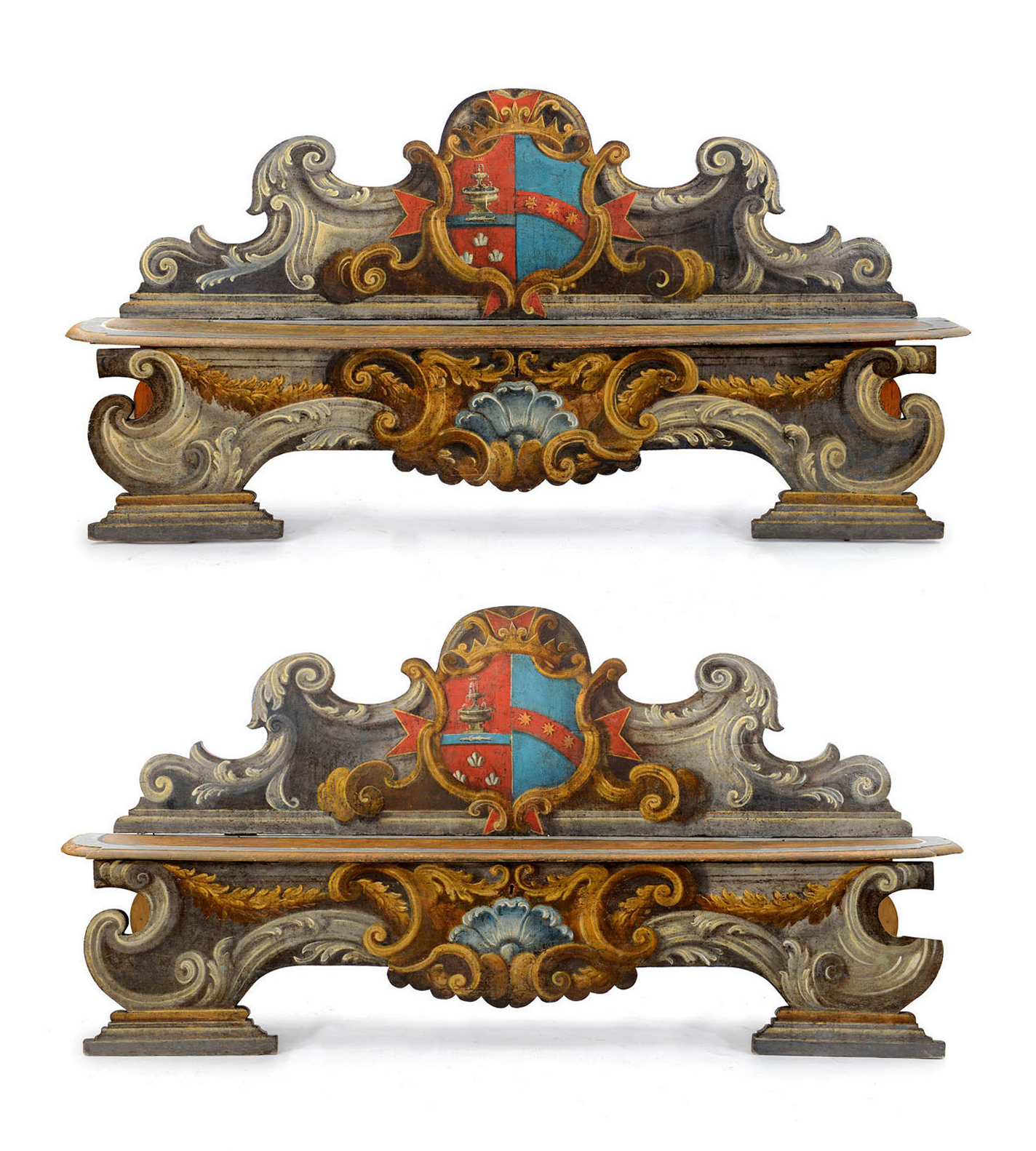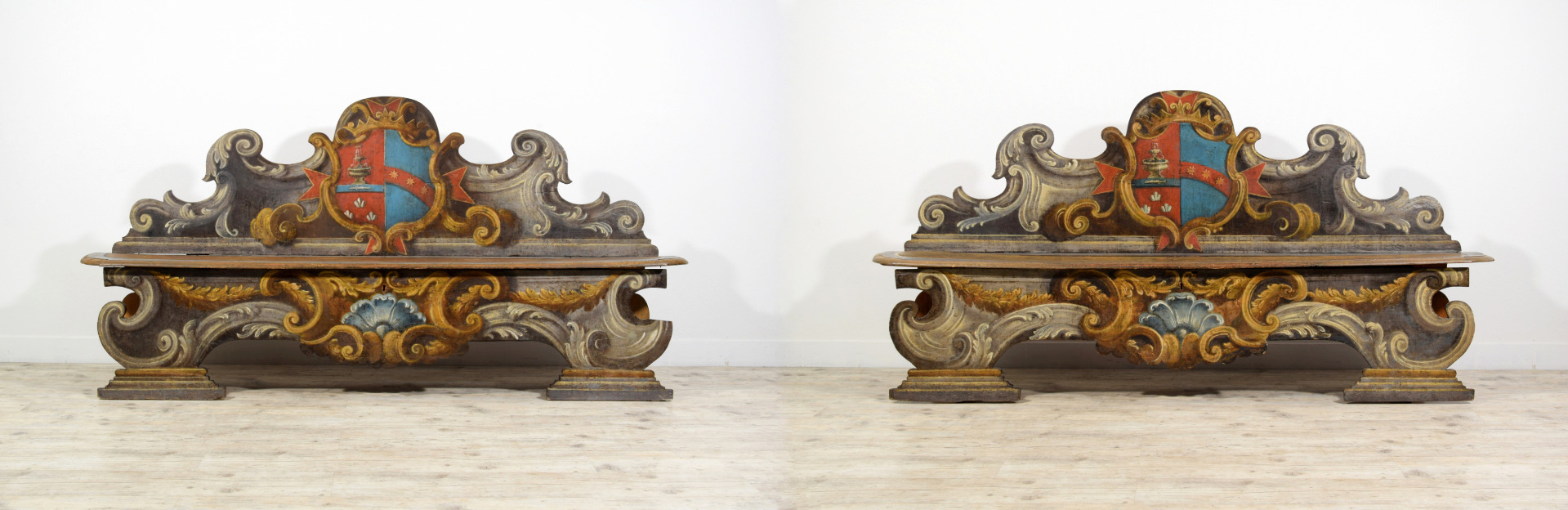 This pair of important Baroque benches was made in Tuscany in the early 18th century. The lacquered wood structure features trompe l'oeil decorations and a central noble coat of arms.