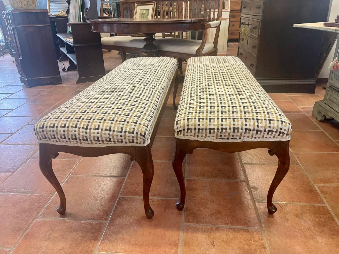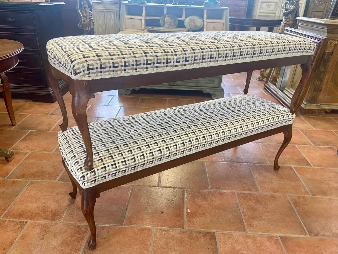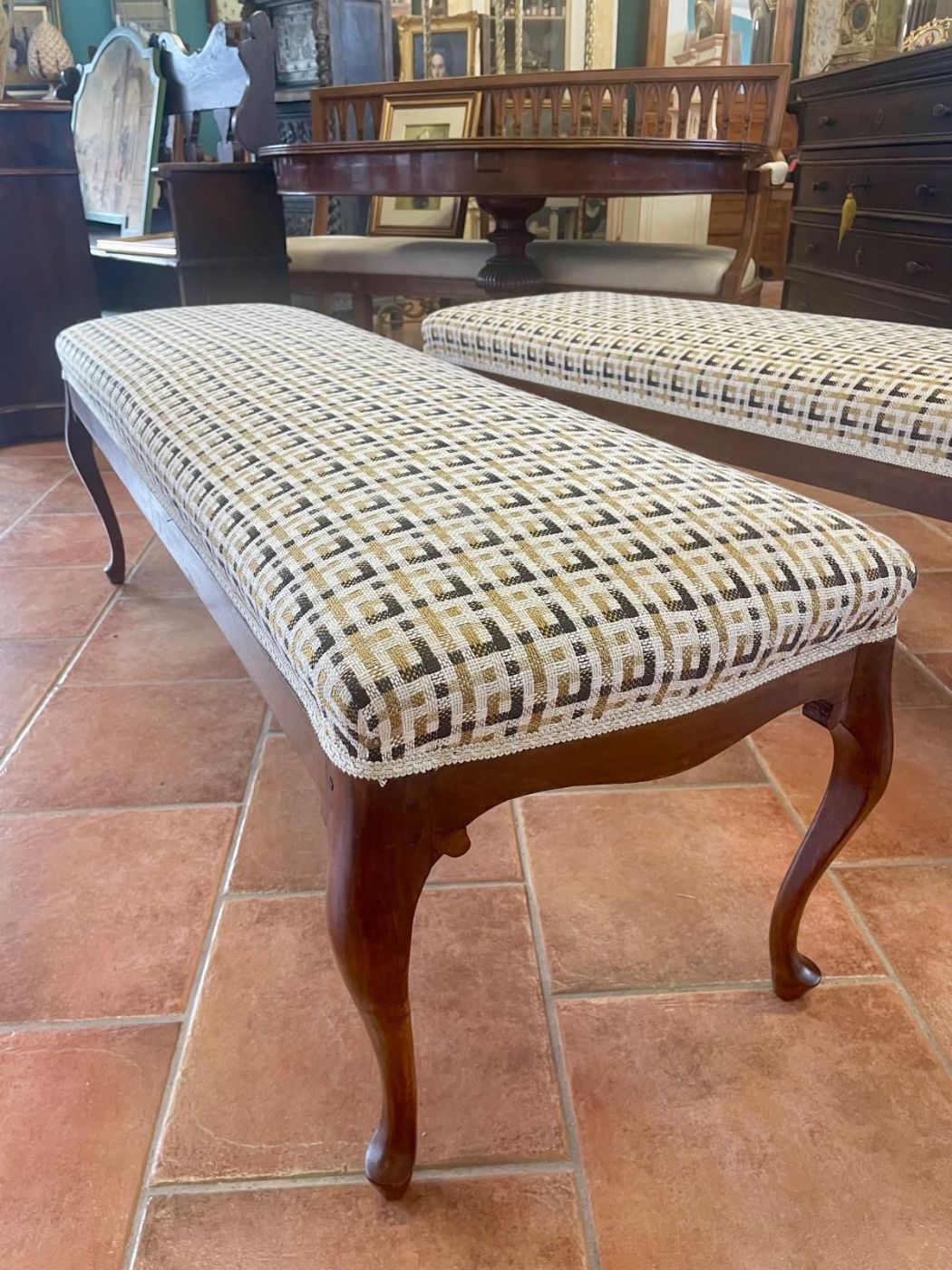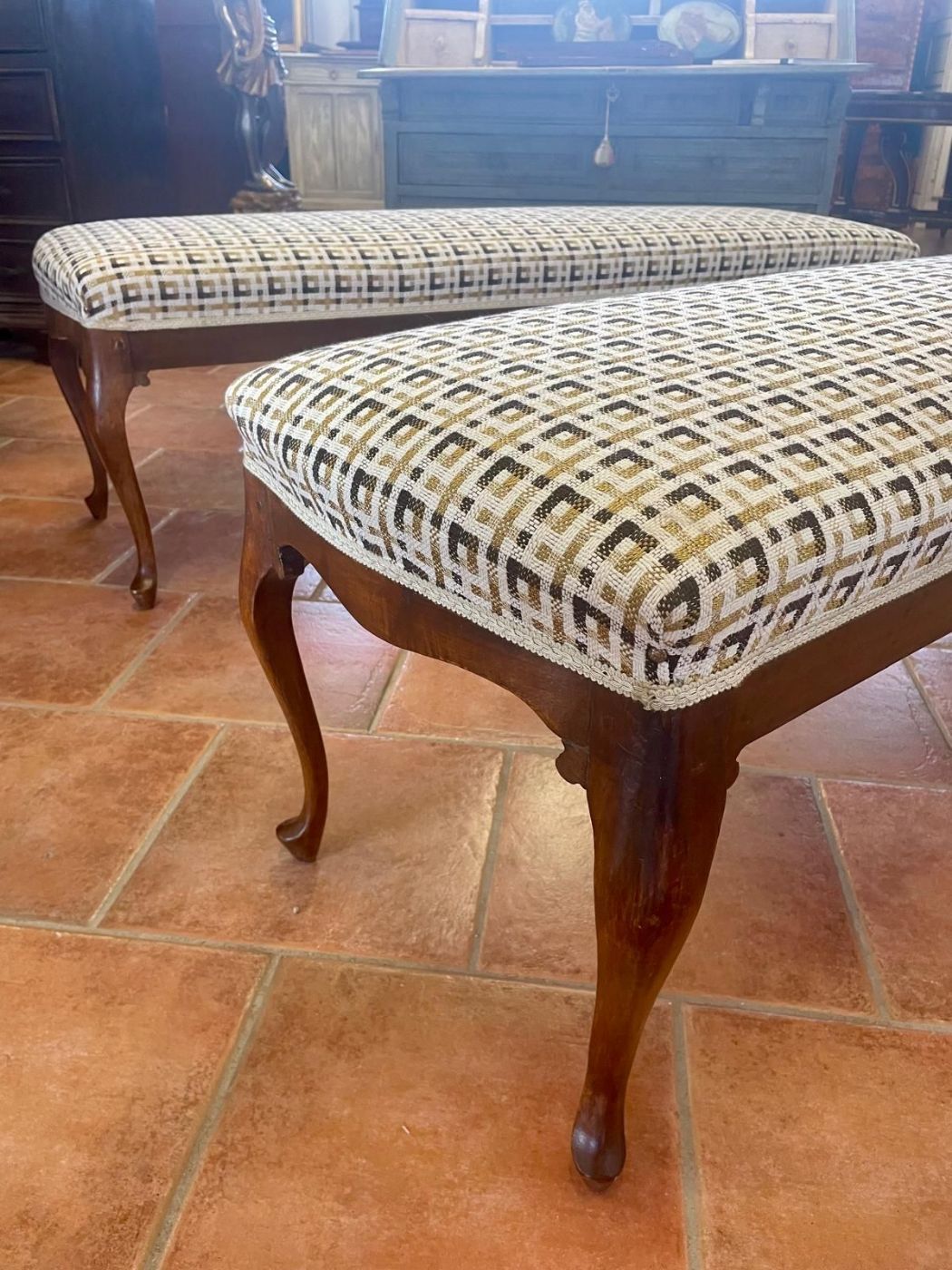 Beautiful pair of 19th-century upholstered walnut benches in perfect condition, with a curved short side and 4 cabriole legs. The geometric patterned fabric in shades of black, gold, and dove gray on an ivory background is stunning. Dimensions: 150 x 46, height 52 cm