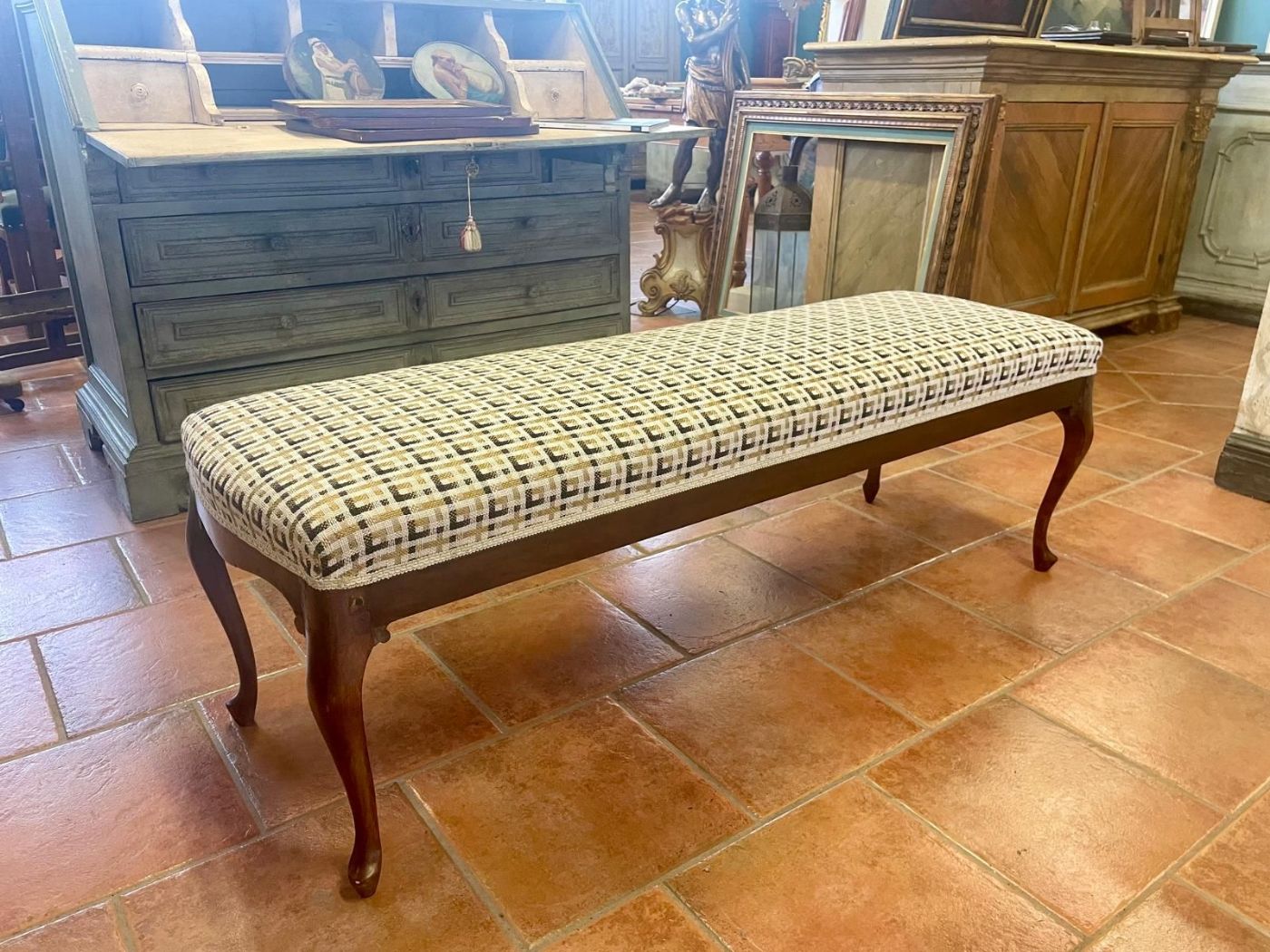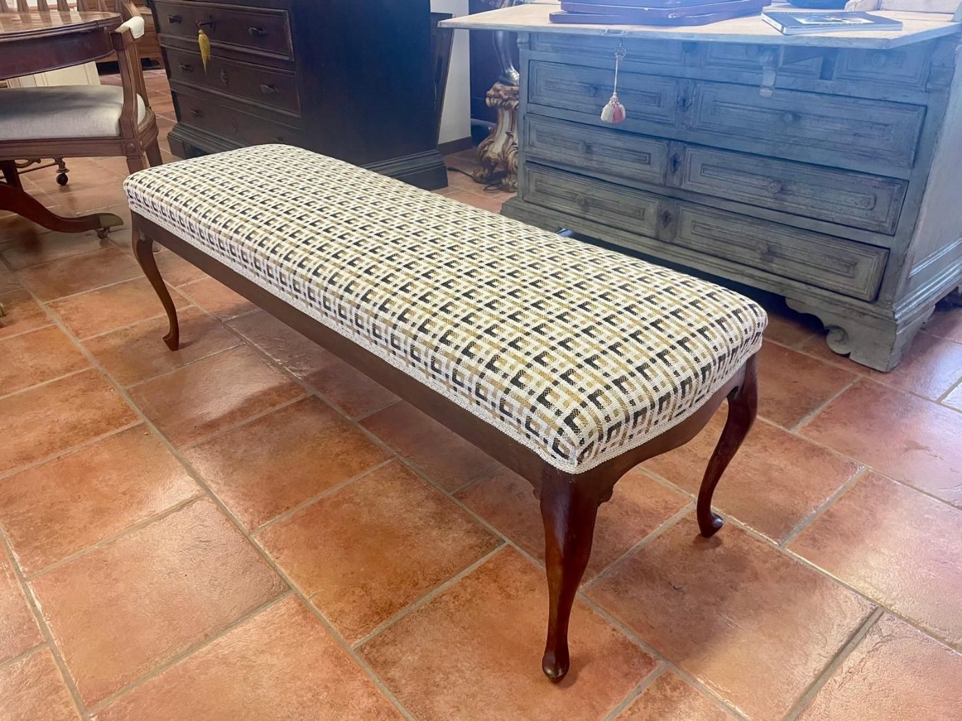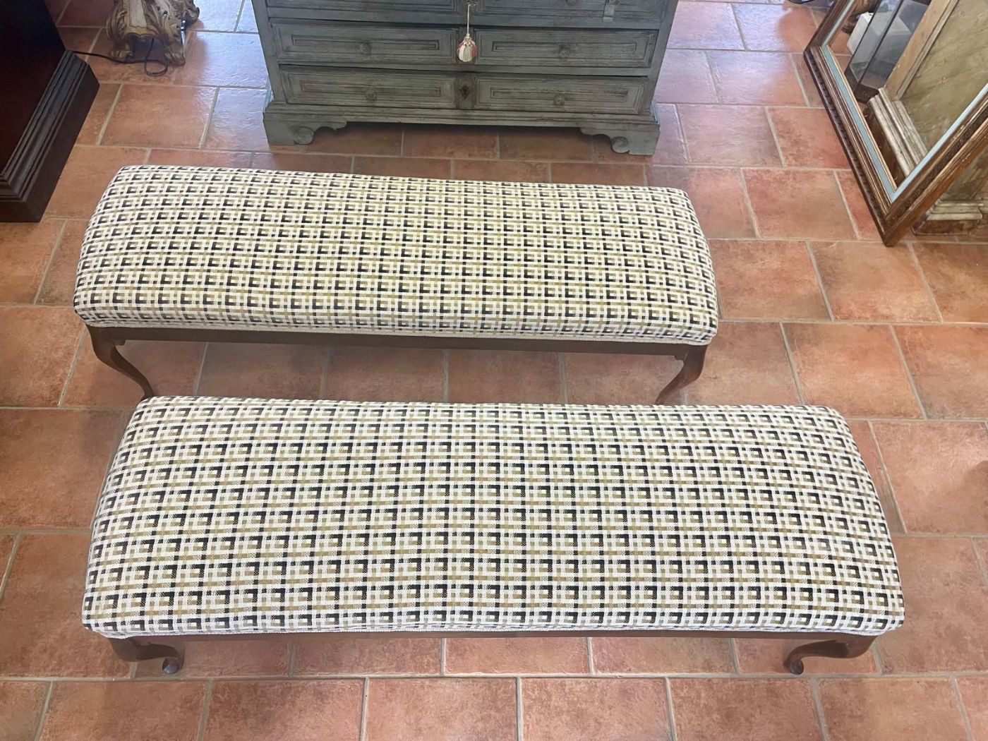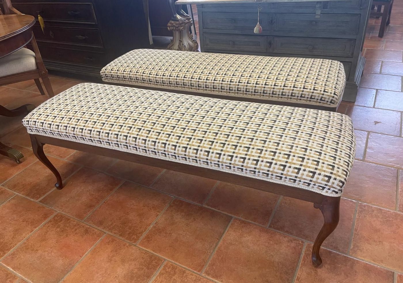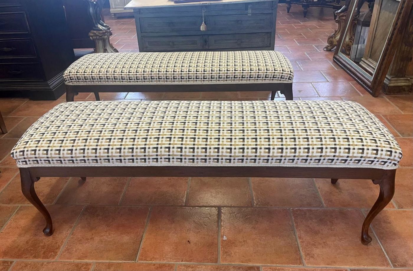 Beautiful pair of 19th-century upholstered walnut benches in perfect condition, with a curved short side and 4 cabriole legs. The geometric patterned fabric in shades of black, gold, and dove gray on an ivory background is stunning. Dimensions: 150 x 46, height 52 cm