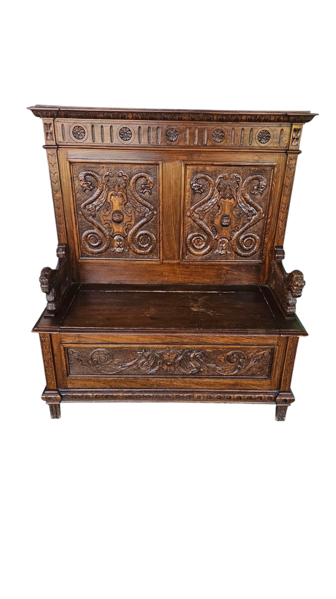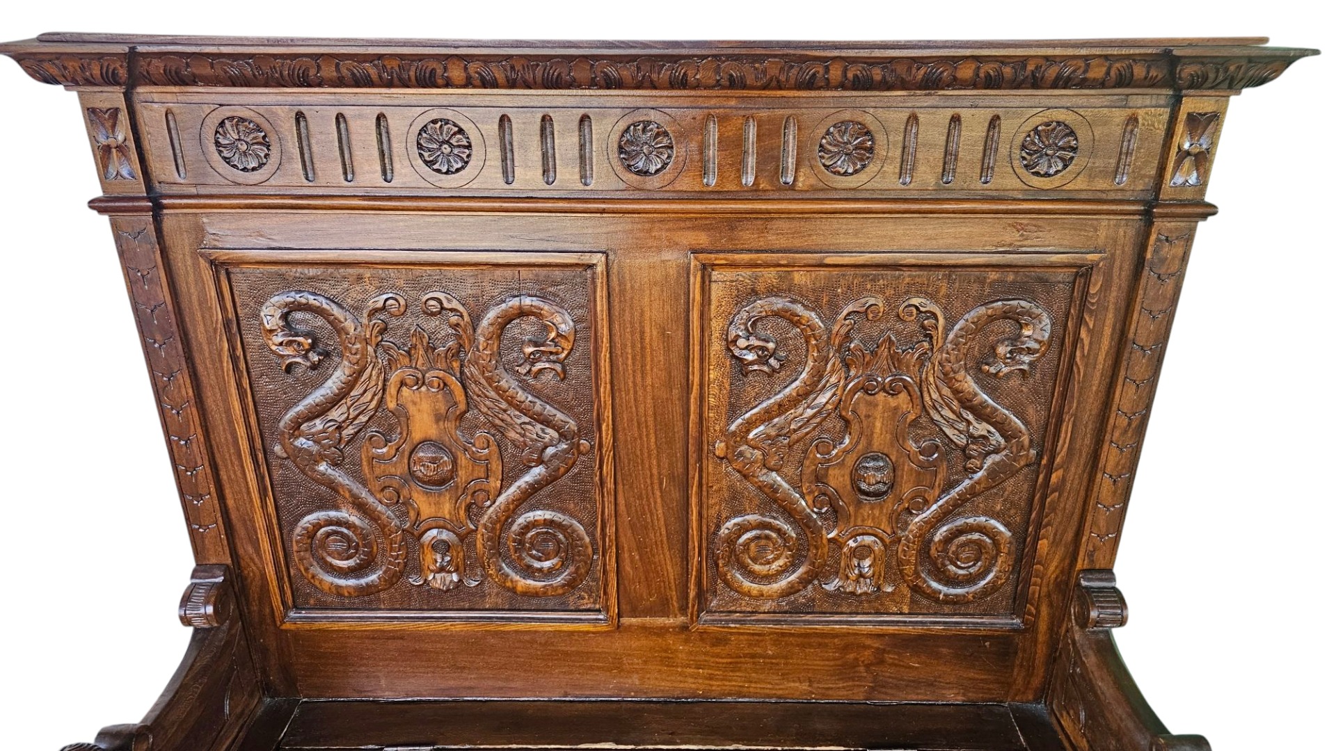 Beautiful Renaissance walnut bench with carvings. It measures one hundred and twenty centimeters in width, forty-five in depth, and one hundred and seventy in height.
