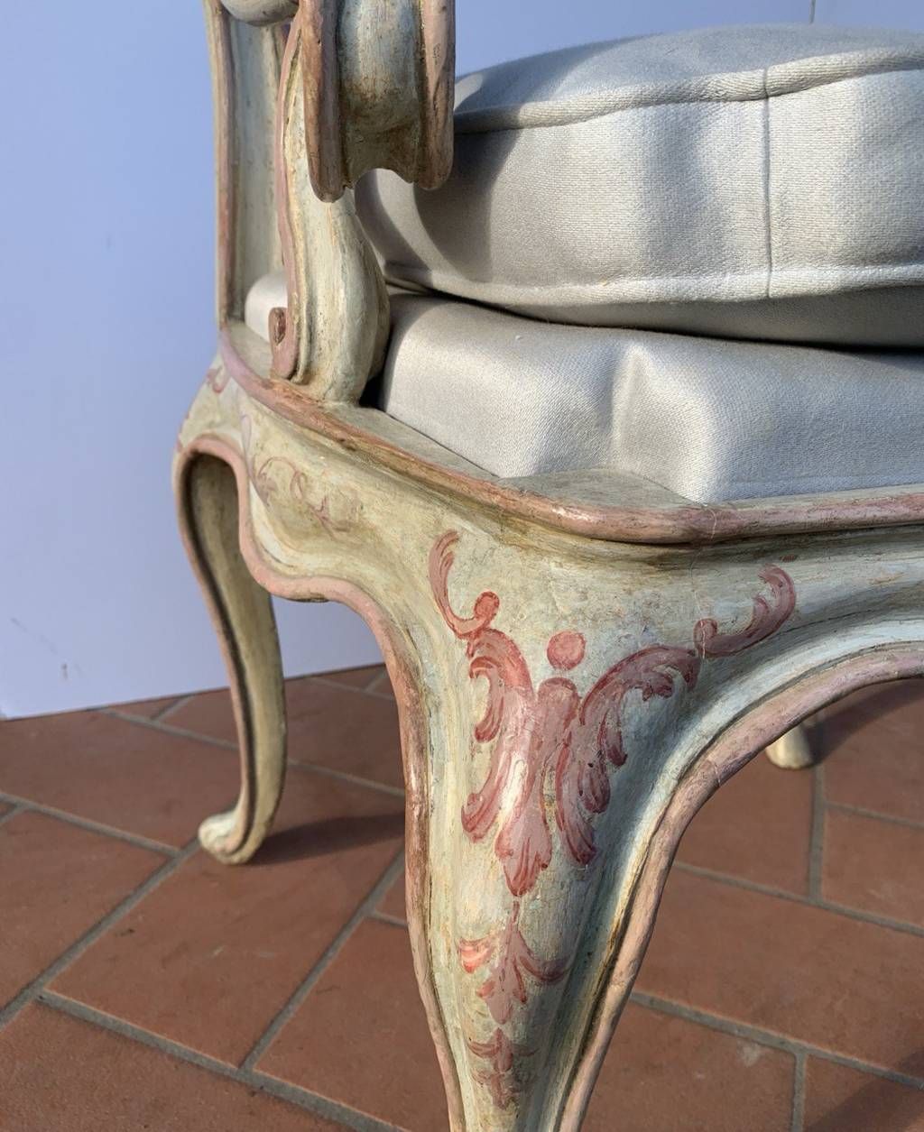 Made entirely of carved, lacquered, and painted wood with vegetal decorations on a cream-colored background. Eight arched legs and elegantly carved scroll armrests. Vienna straw seat covered with fine fabric.
