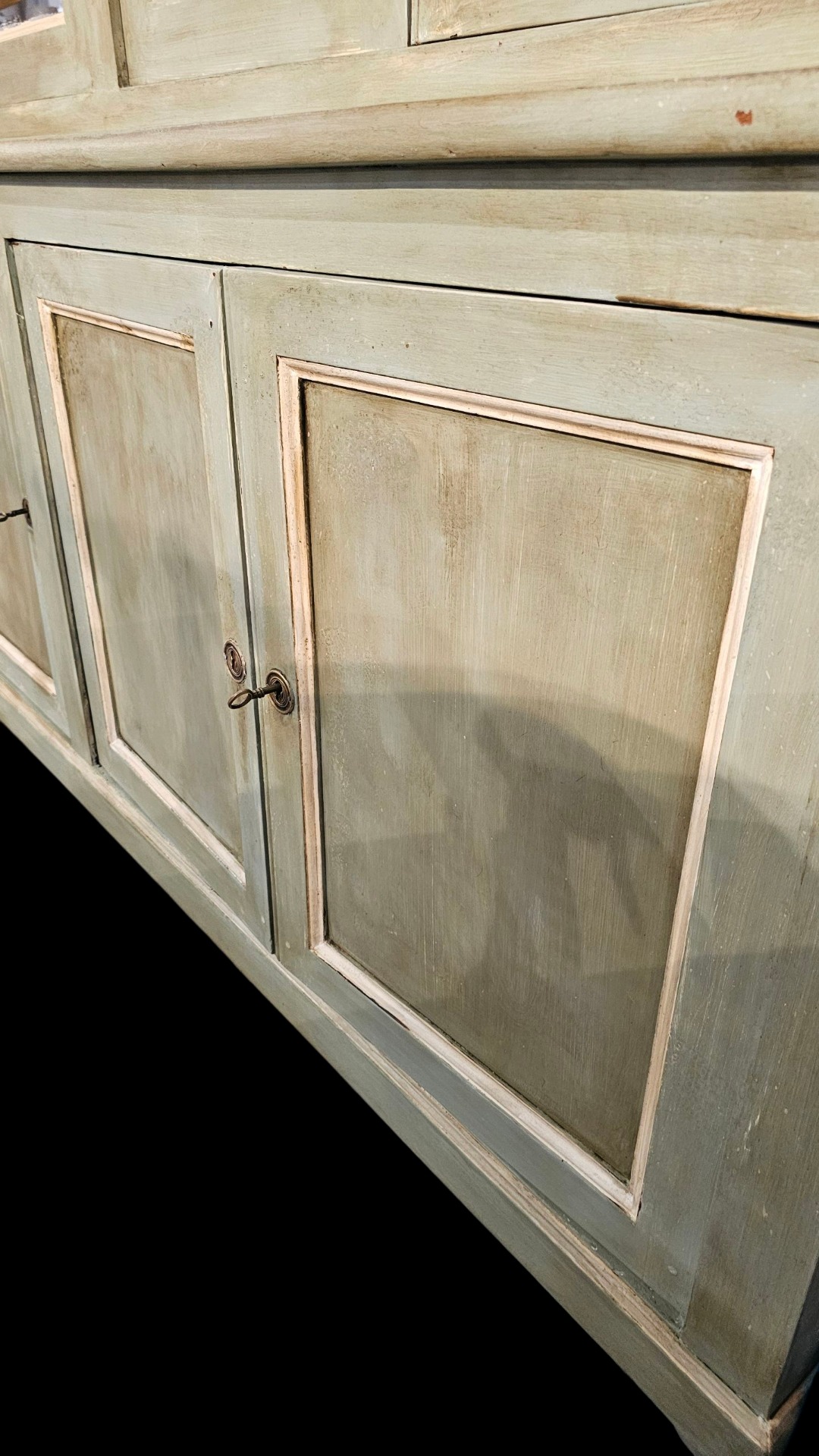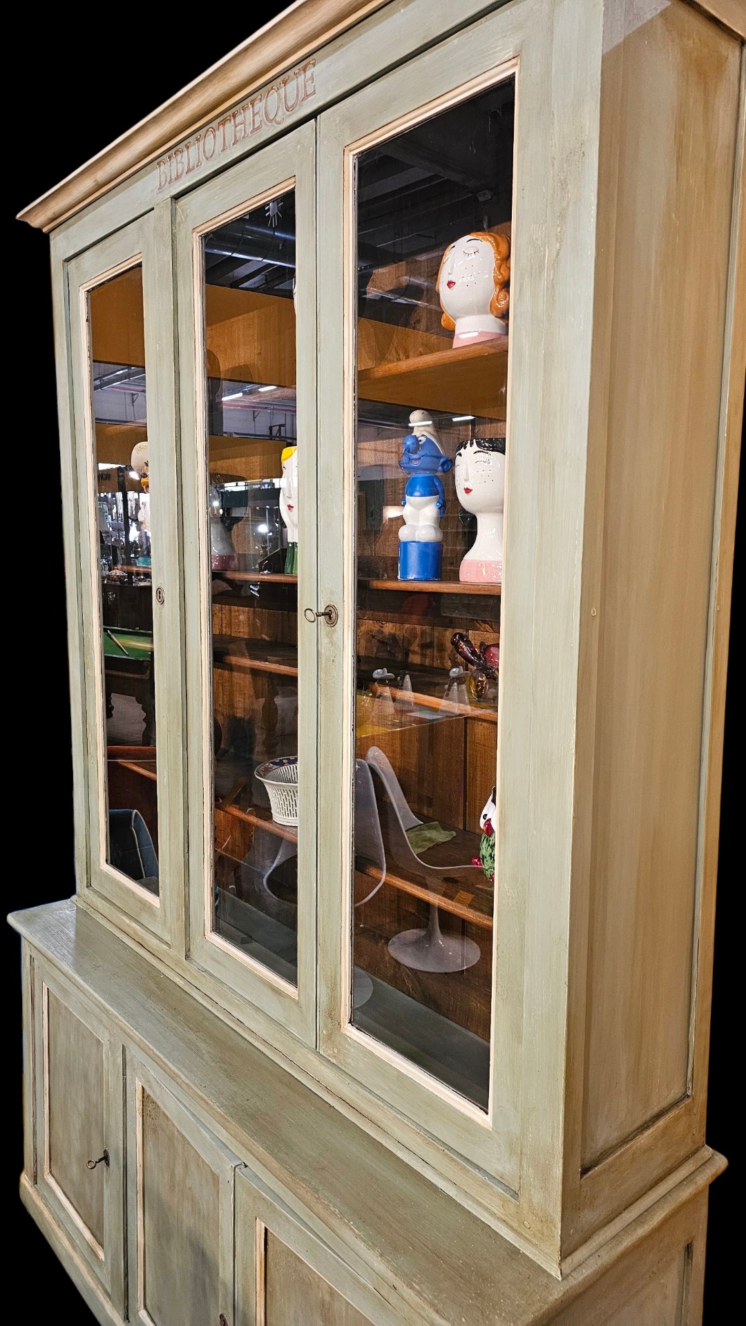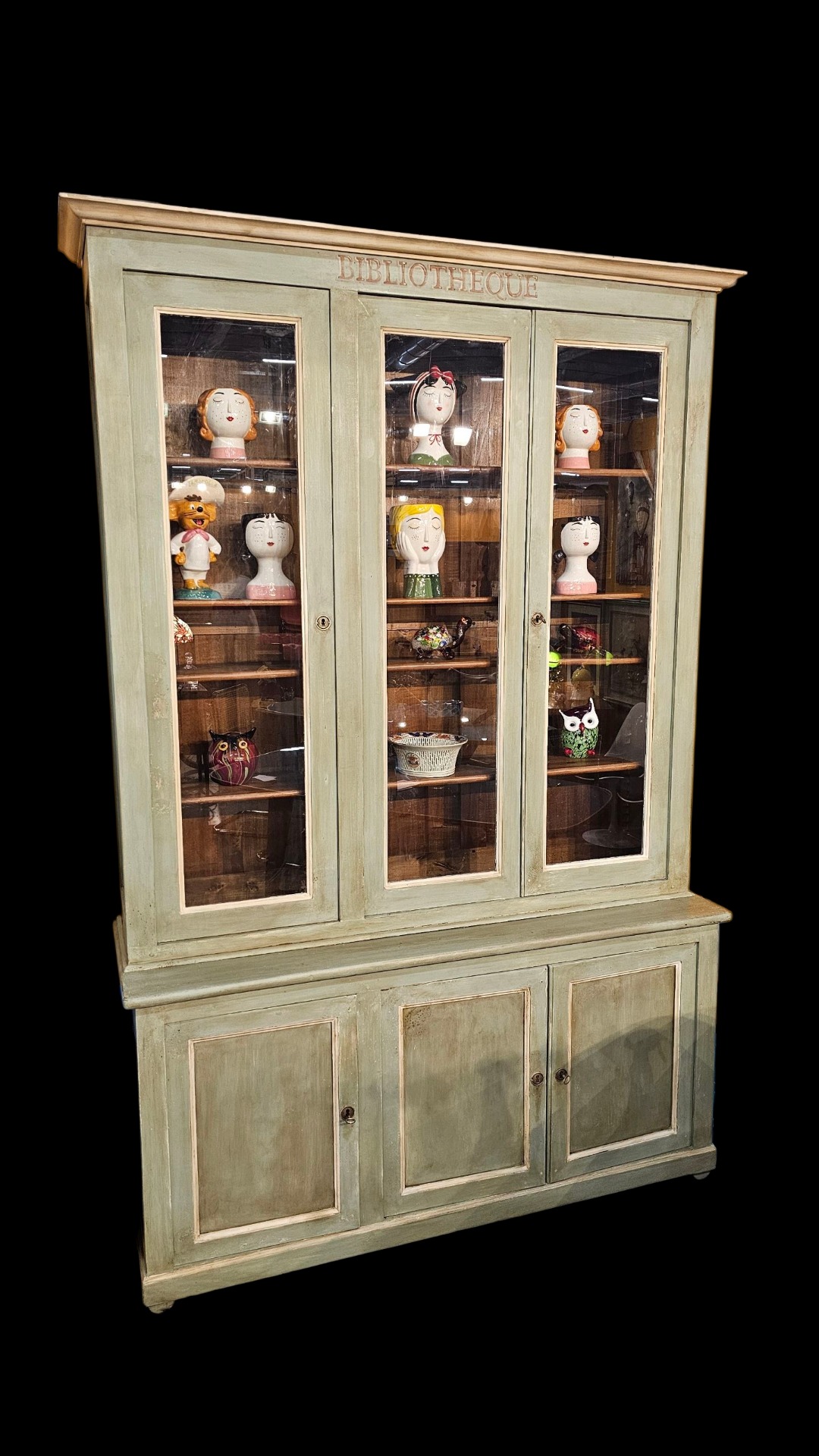 Beautiful French bookcase lacquered in sage green. With small shelves and 3 glass doors in the upper part. Measures 150cm wide, 40cm deep and 240cm high. Late nineteenth century period.