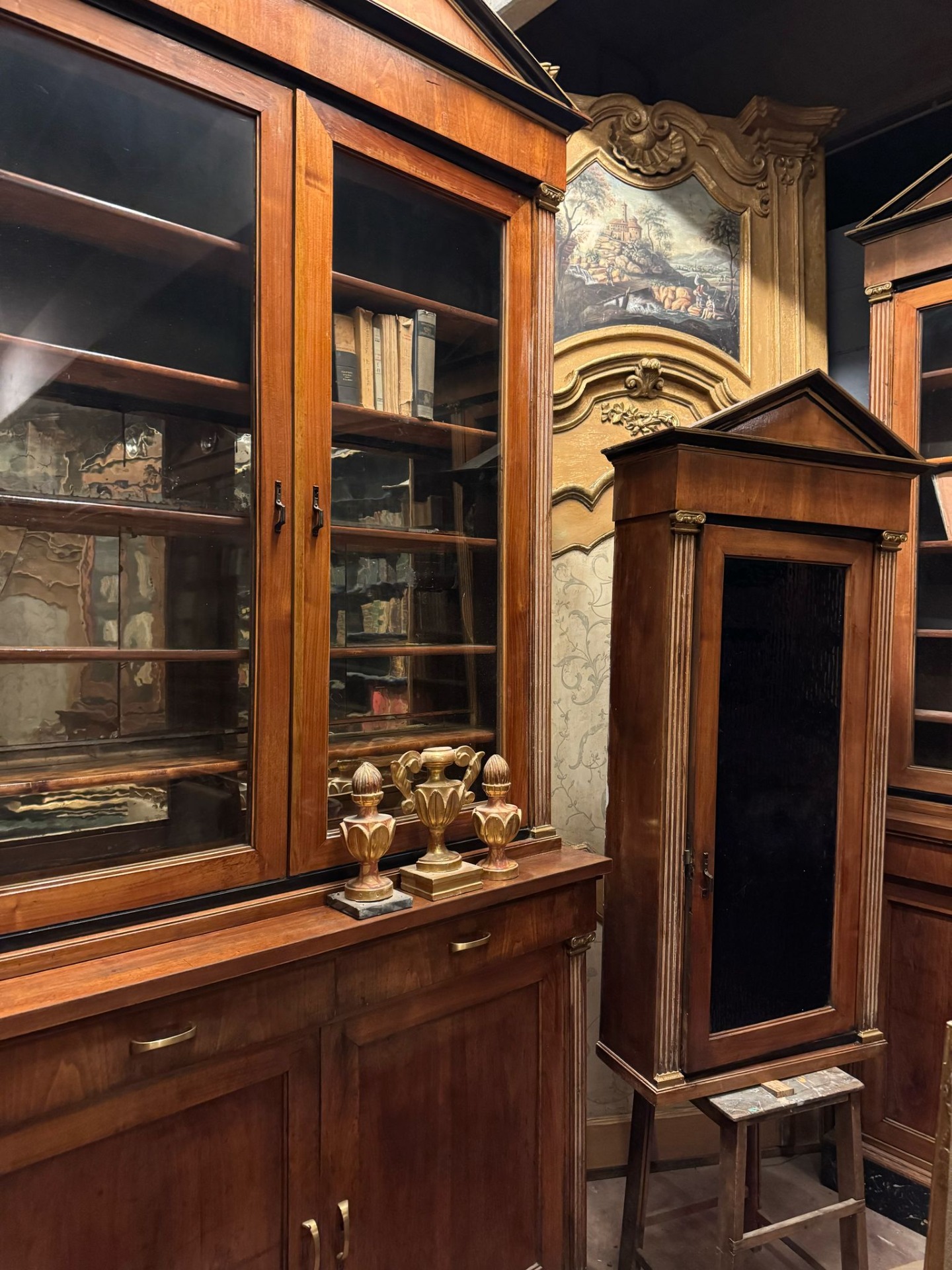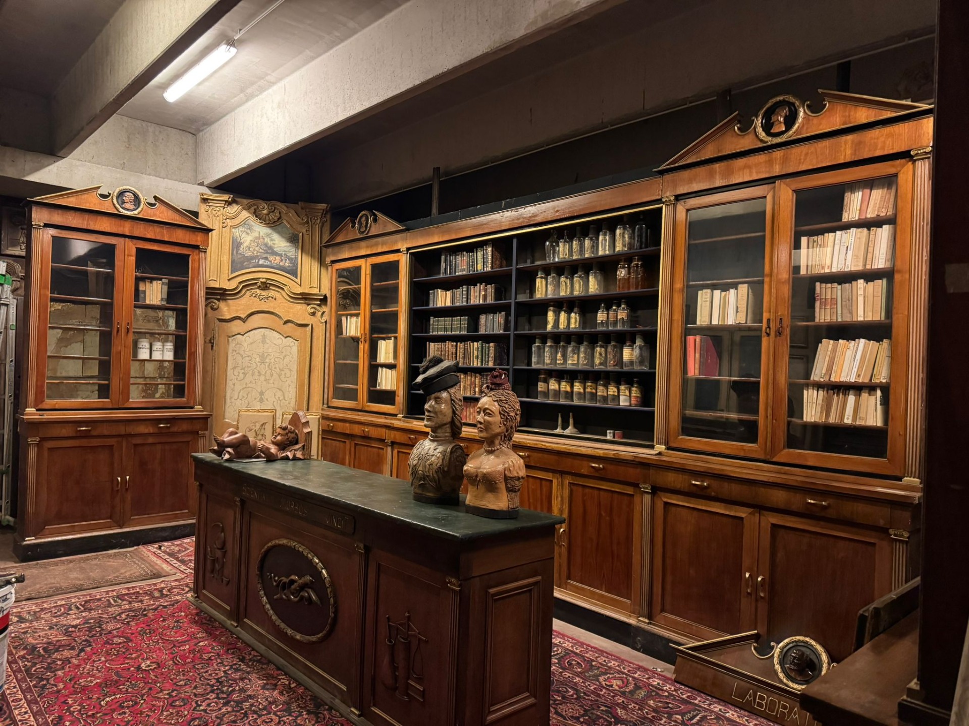 LIB159 - Farmacia in legno di noce. Epoca primi '900. Completa di: 2 mobili che misurano cm L 510 x H 290 x P 38 1 mobile che misura cm L 137 x H 290 x P 38 1 portale/ laboratorio che misura cm L 121 x H 290 x P 12 una teca con anta vetrata che misura cm L 72 x H 154 x P 28 1 bancone che misura cm L 265 x H 92 x P 52 Misure totali metri lineari 14,87 x H 2,90 I mobili più grandi presentano colonnine scolpite e dorate, antine inferiori con ripiani e cassettini sopra, mentre la parte superiore presenta ante vetrate e ripiani, impreziosita da due cimase con volti scolpiti. Il mobile più piccolo presenta sempre colonnine scolpite, antine inferiori con ripiani e coppia di cassettini sopra, la parte superiore è valorizzata da antine vetrate con all'interno ripiani e specchio. Parte superiore con cimasa mossa centrata da volto scolpito. Il bancone presenta piano laccato ad effetto finto marmo, scritta latina "Scientia Morbos Vincit" e simboli della sanità scolpiti (al centro troviamo il bastone di Asclepio che simboleggia le arti sanitarie, combinando il serpente, che con il cambiamento della pelle simboleggia la rinascita e la fertilità, con la verga, un semplice strumento).