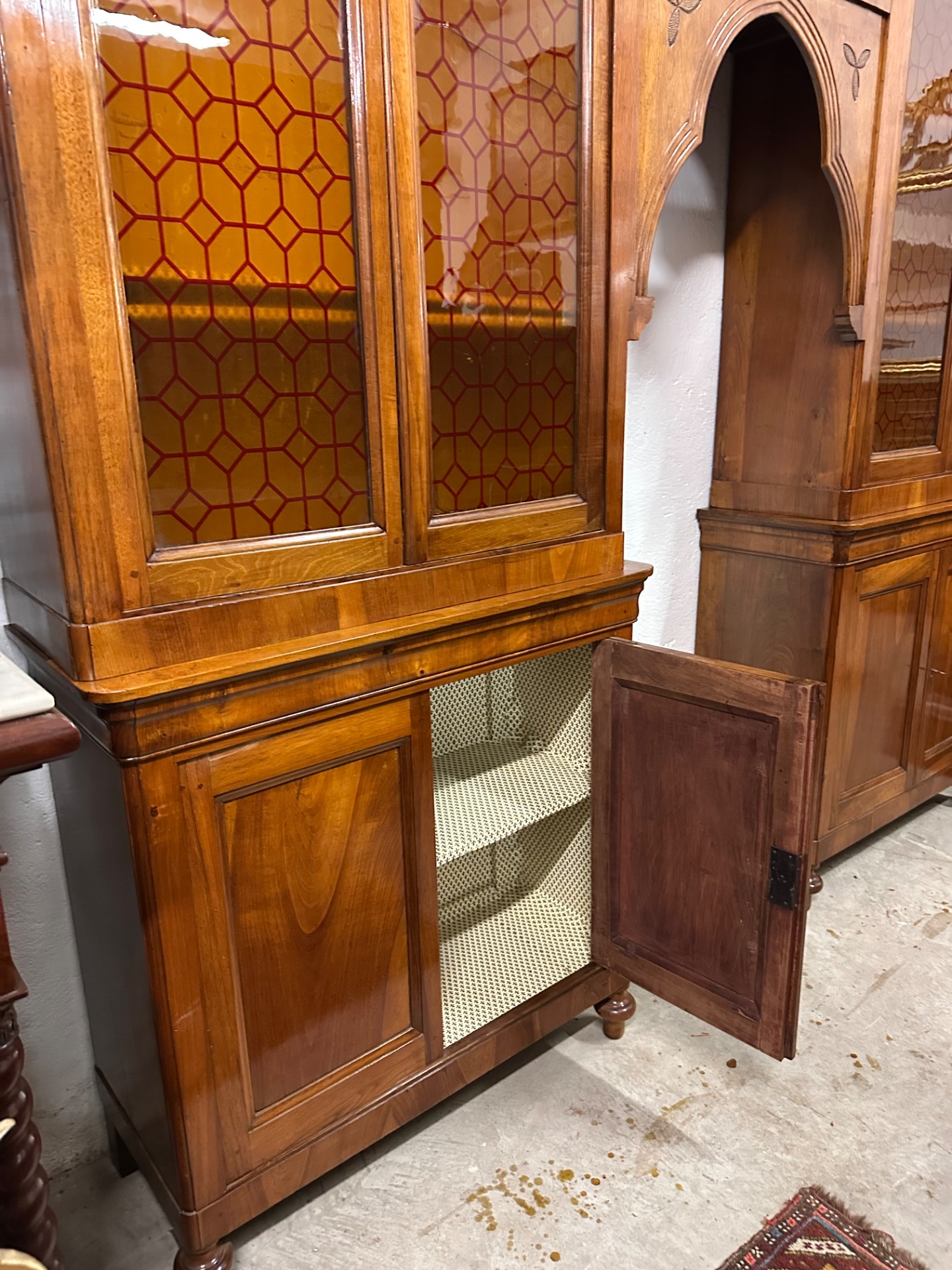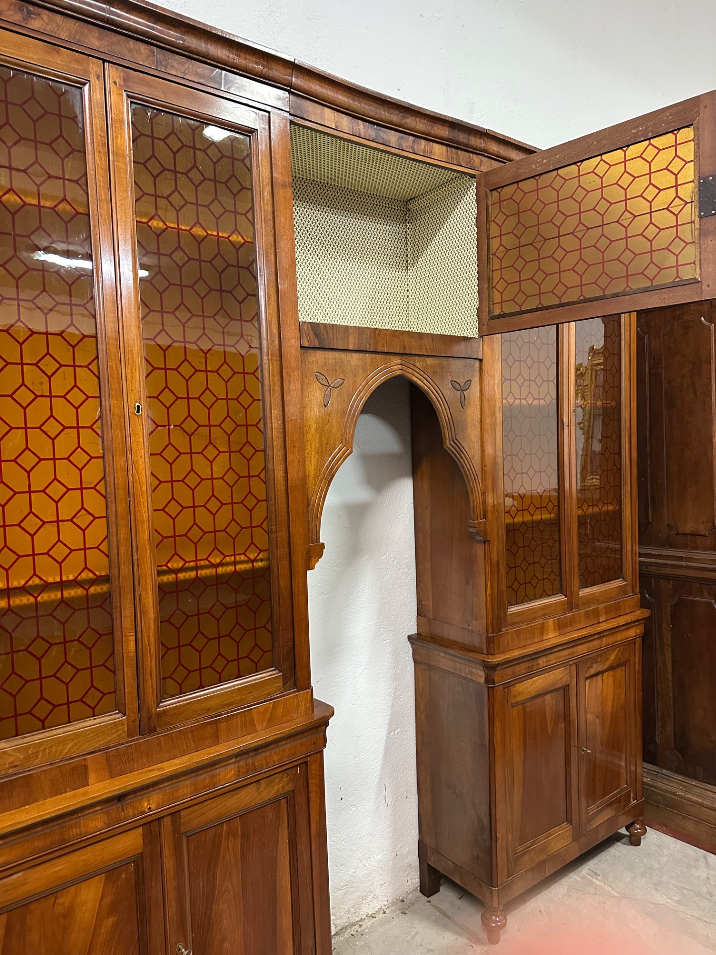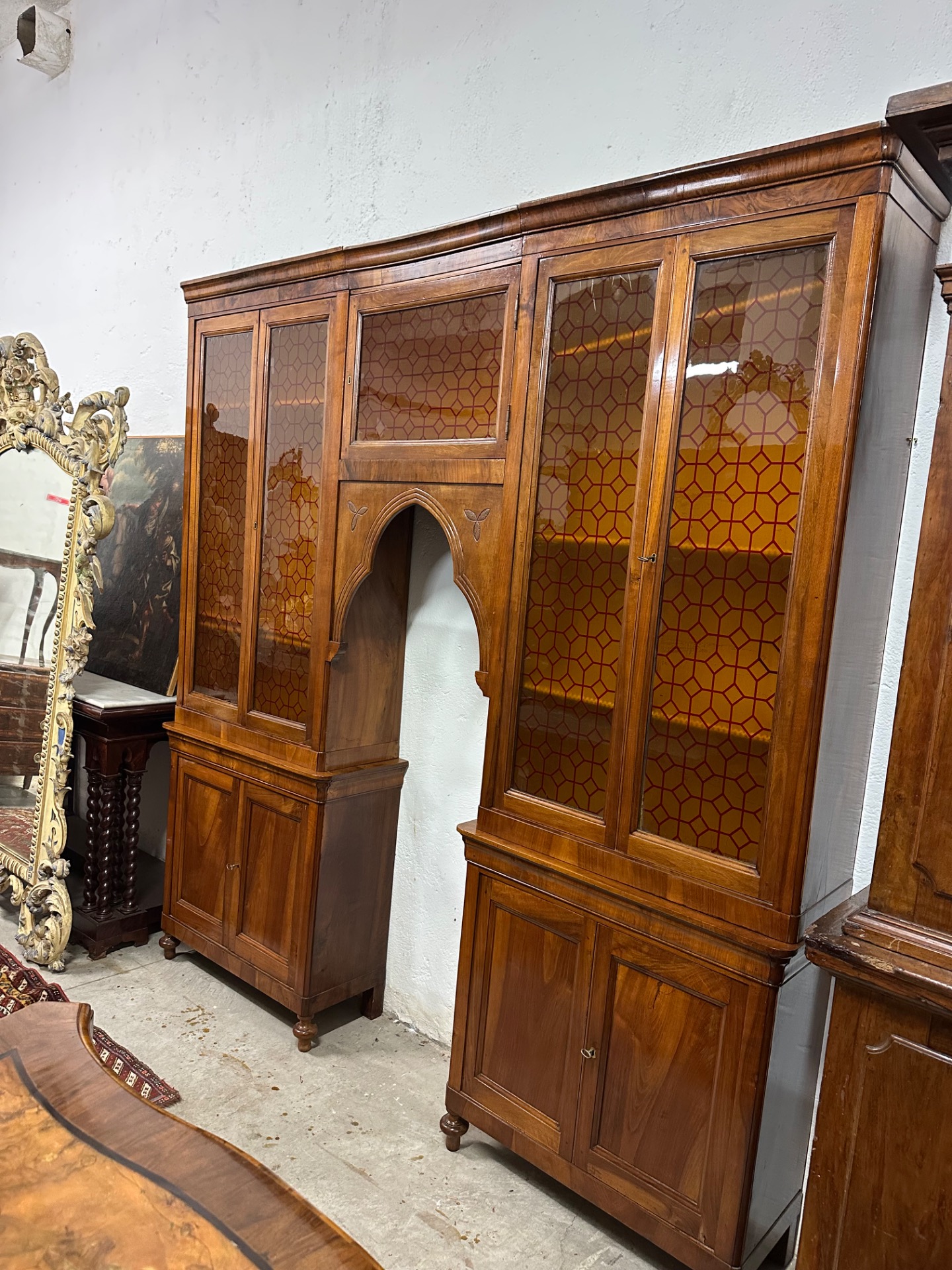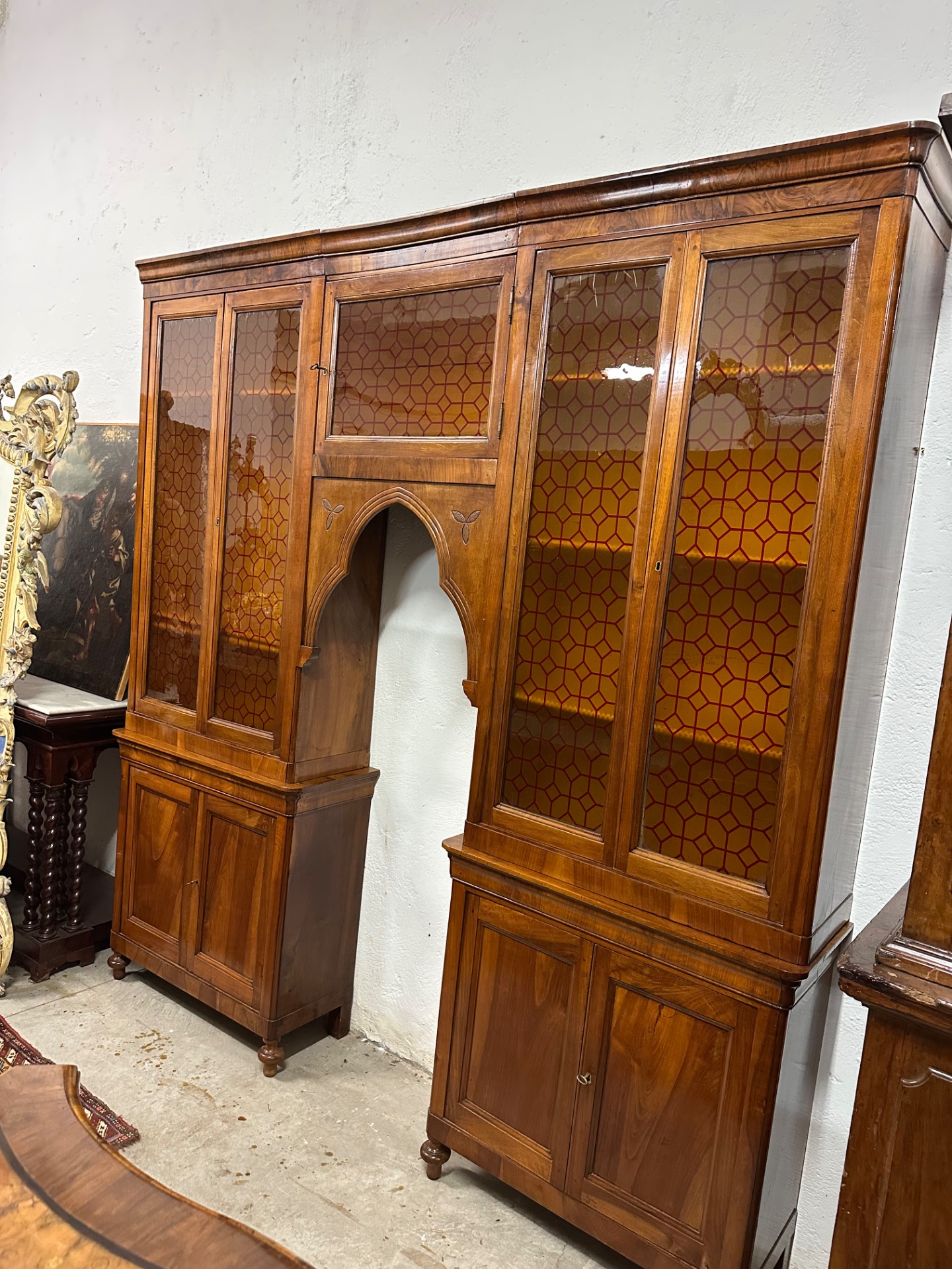 Lombard Carlo X style over-door bookcase from the first half of the 19th century, composed of two lateral elements with four doors each, and those of the upper part with cathedral-decorated glass and a central door. Lombardy, mid-19th century. Restoration completed, ready to be placed in the house. Measurements: W 242 / H 248 / D 38 Authenticity is certified. A sales invoice will be issued. We ship throughout Europe, do not hesitate to contact us. We accept PayPal, Visa, and Mastercard payments.