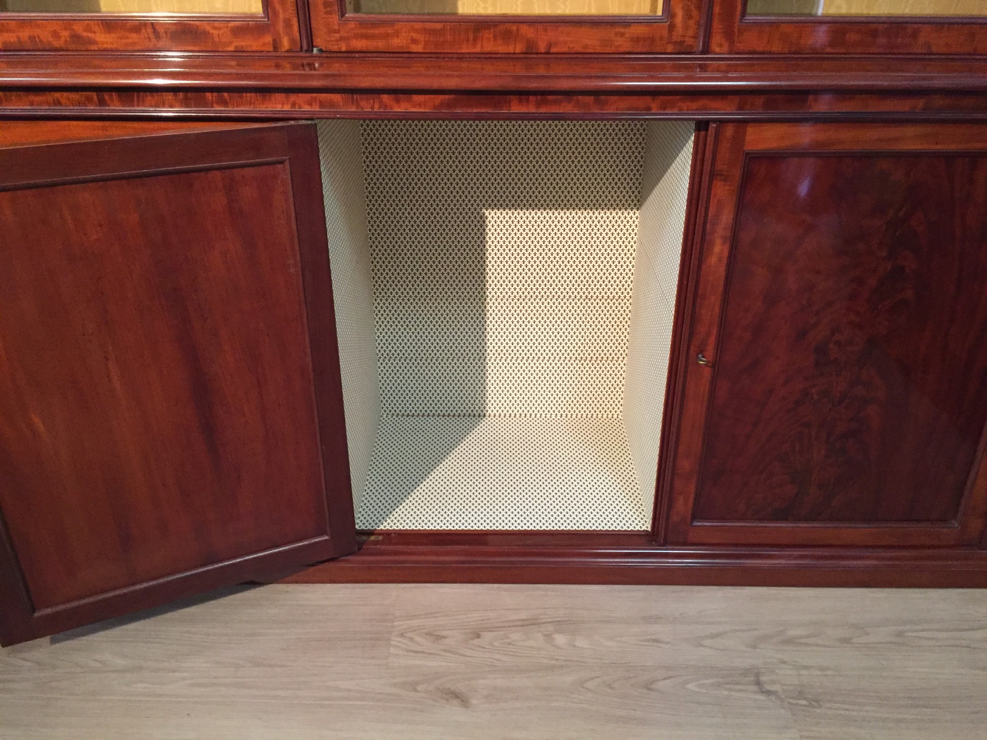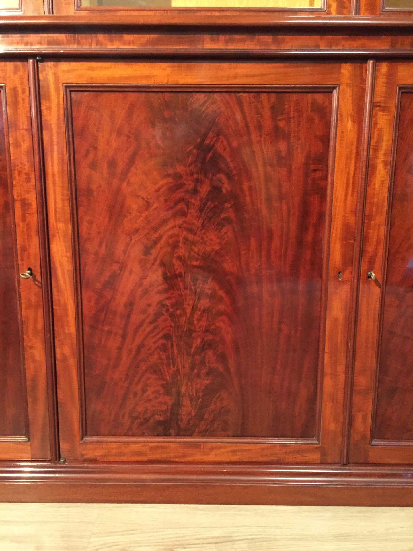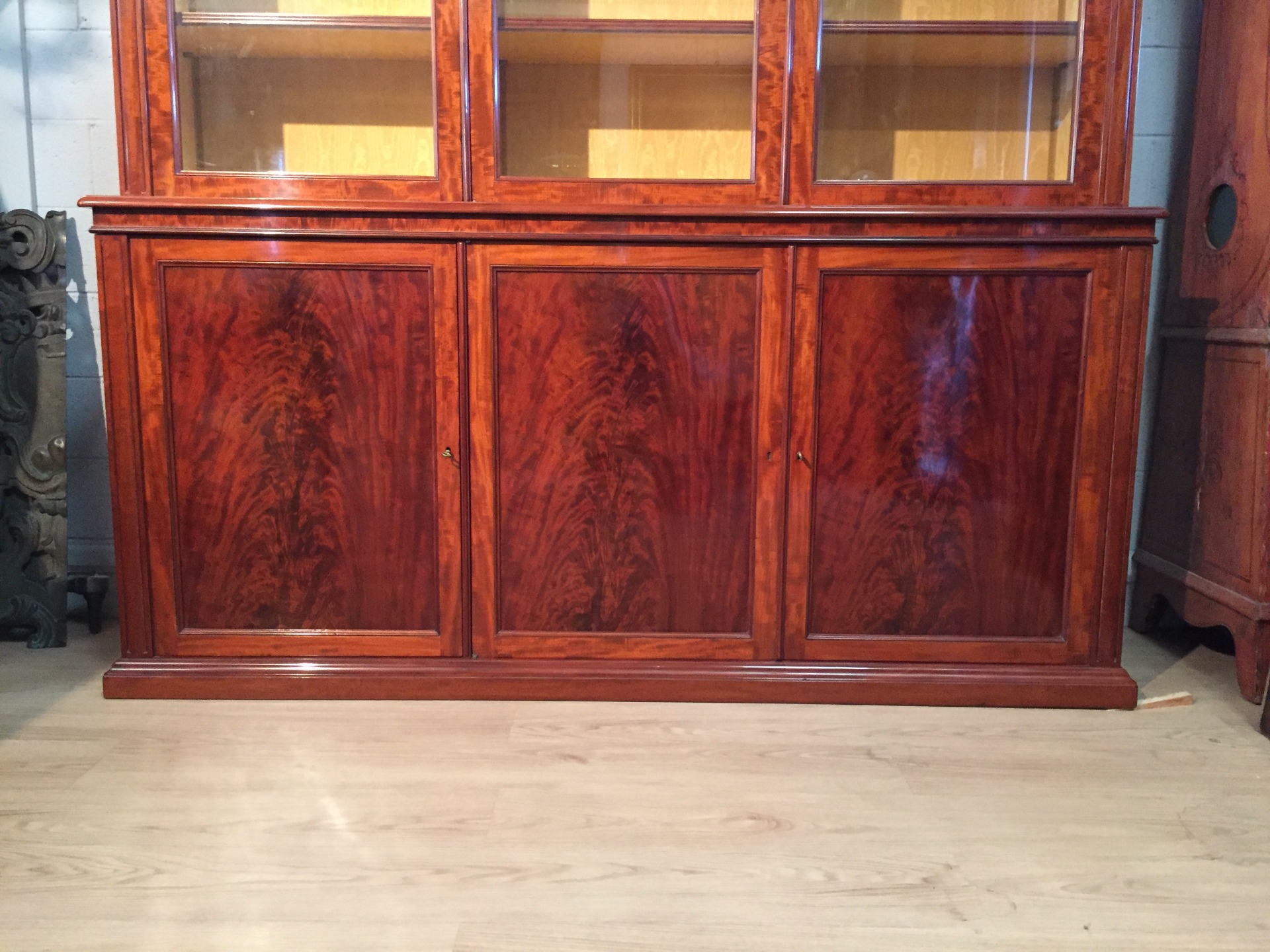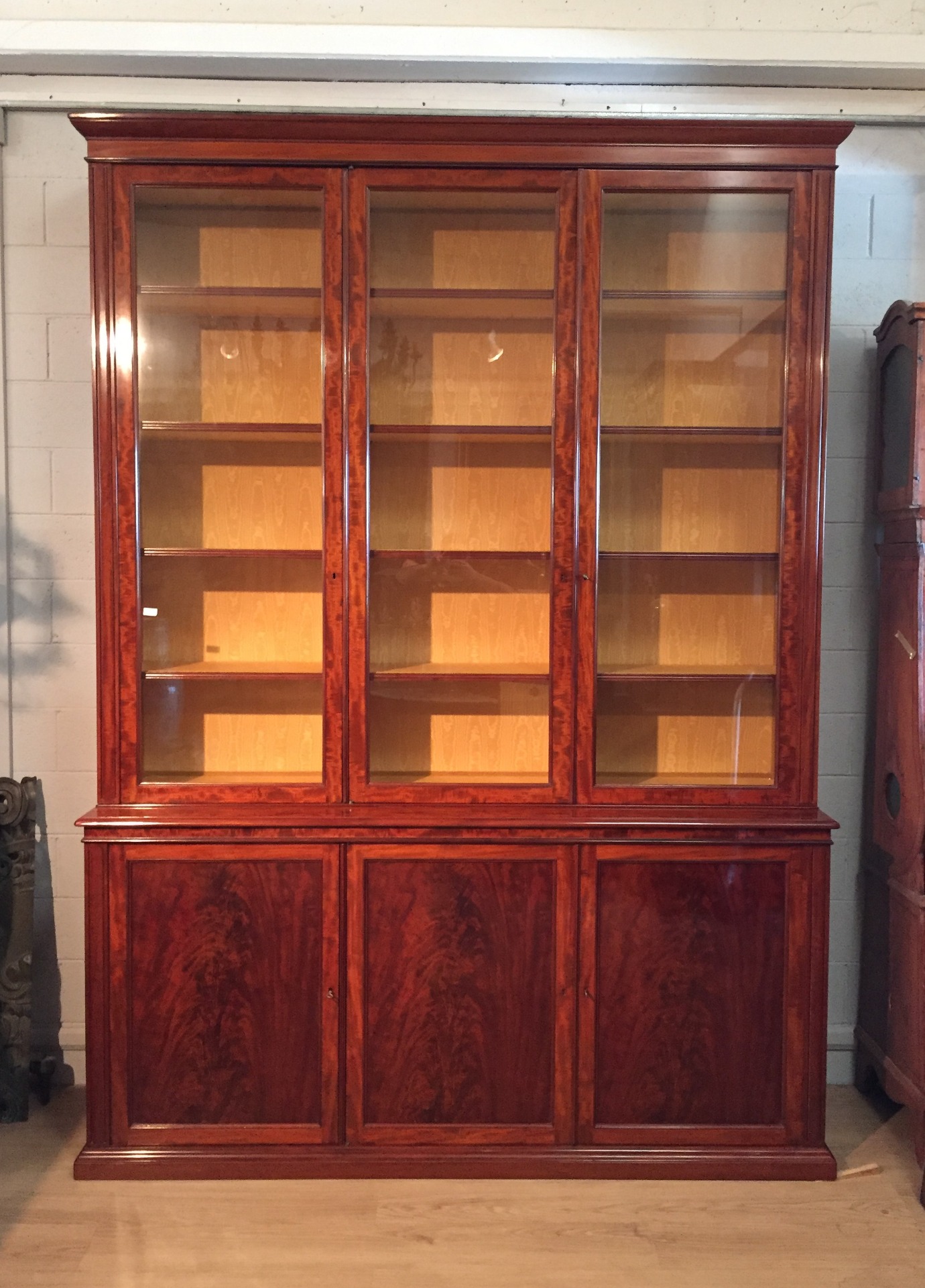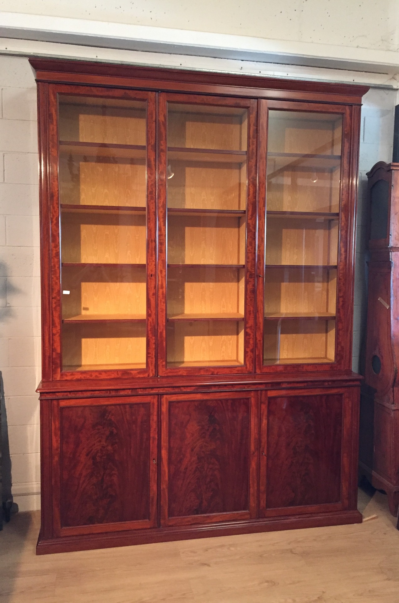 This bookcase was made with the refined wood essence of mahogany feather which creates elegant chromatic games and veins, making the furniture very decorative. Made in France in the second half of the 19th century, it consists of three glass doors that protect the upper compartment divided into shelves. Below it has three doors that conceal very practical compartments for storing everyday objects or tableware, or documents. This piece of furniture can in fact be designed for a living room, for a study or bedroom or be placed in an entrance.