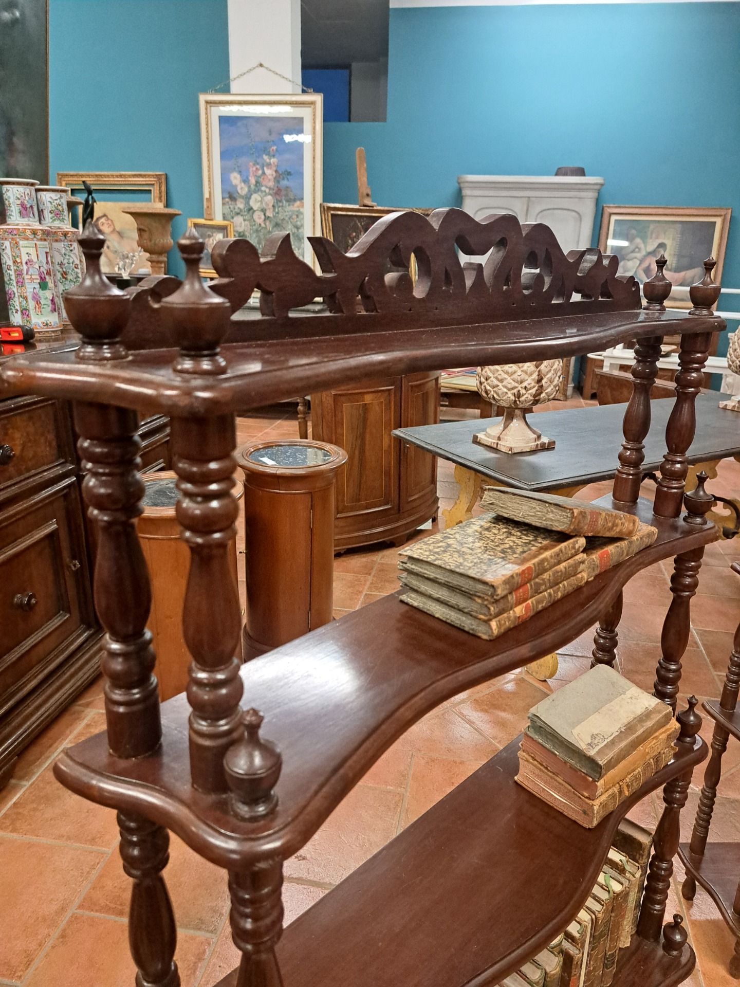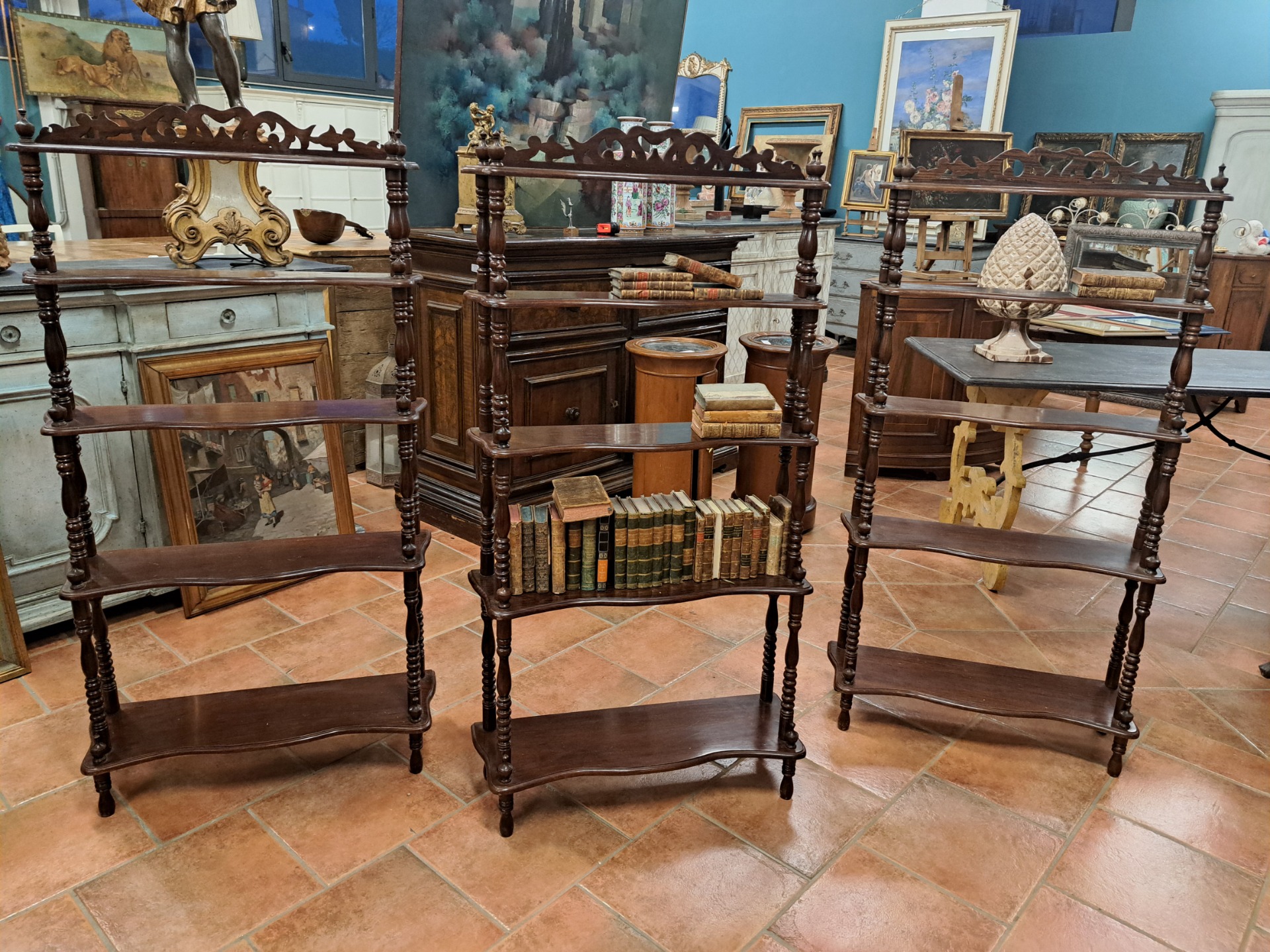 Rare and particular group of three large rosewood étagères, each with 5 wavy shelves with ogee edge, double side turnings, and a richly carved crest.