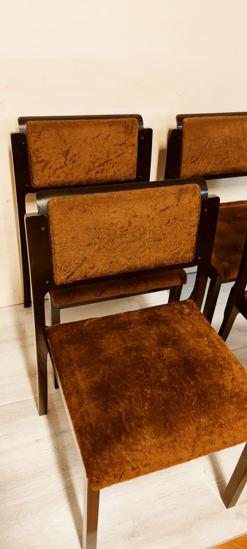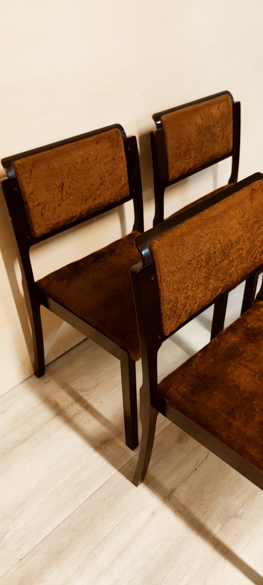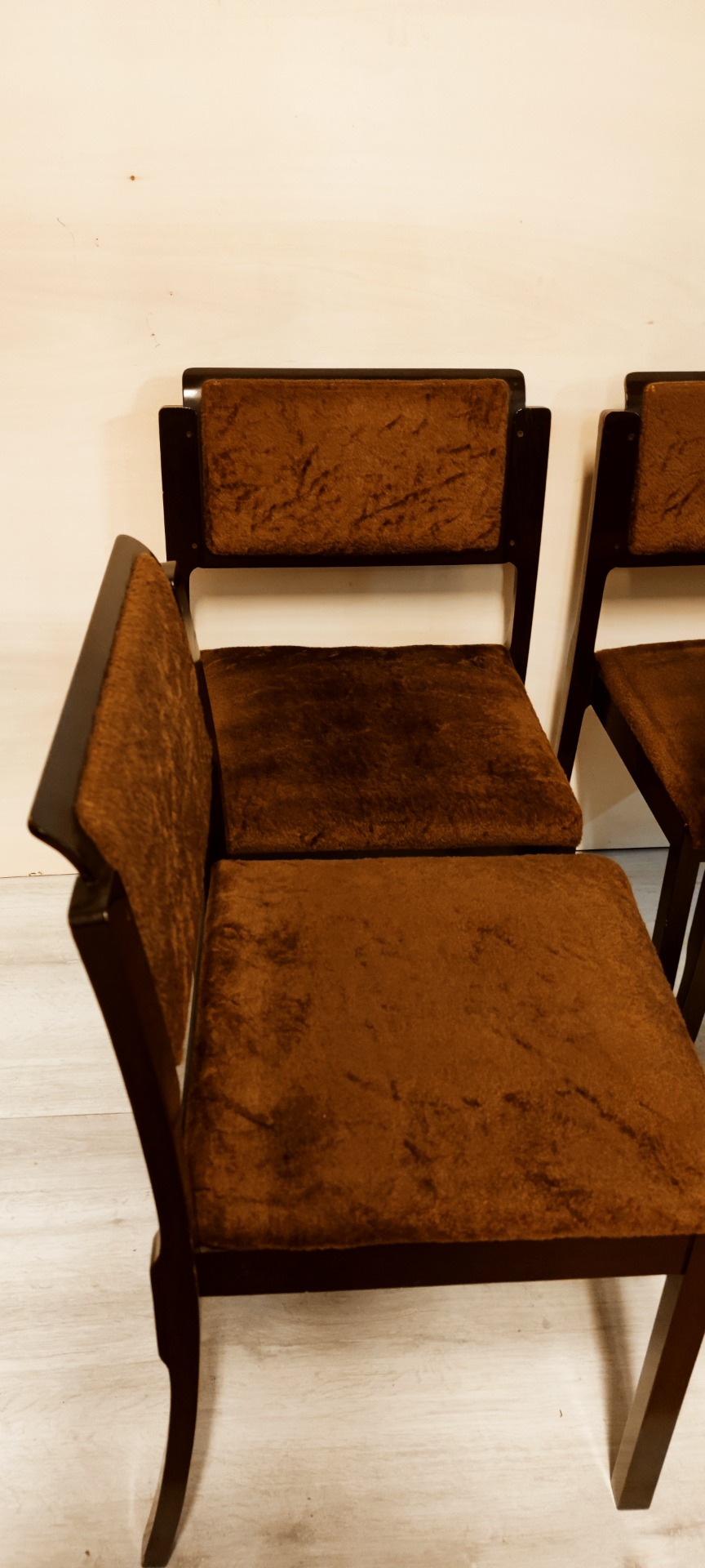 Four vintage chairs in ebonized oak. Brown fabric. Dimensions fifty by fifty, height seventy-eight. 1970s.