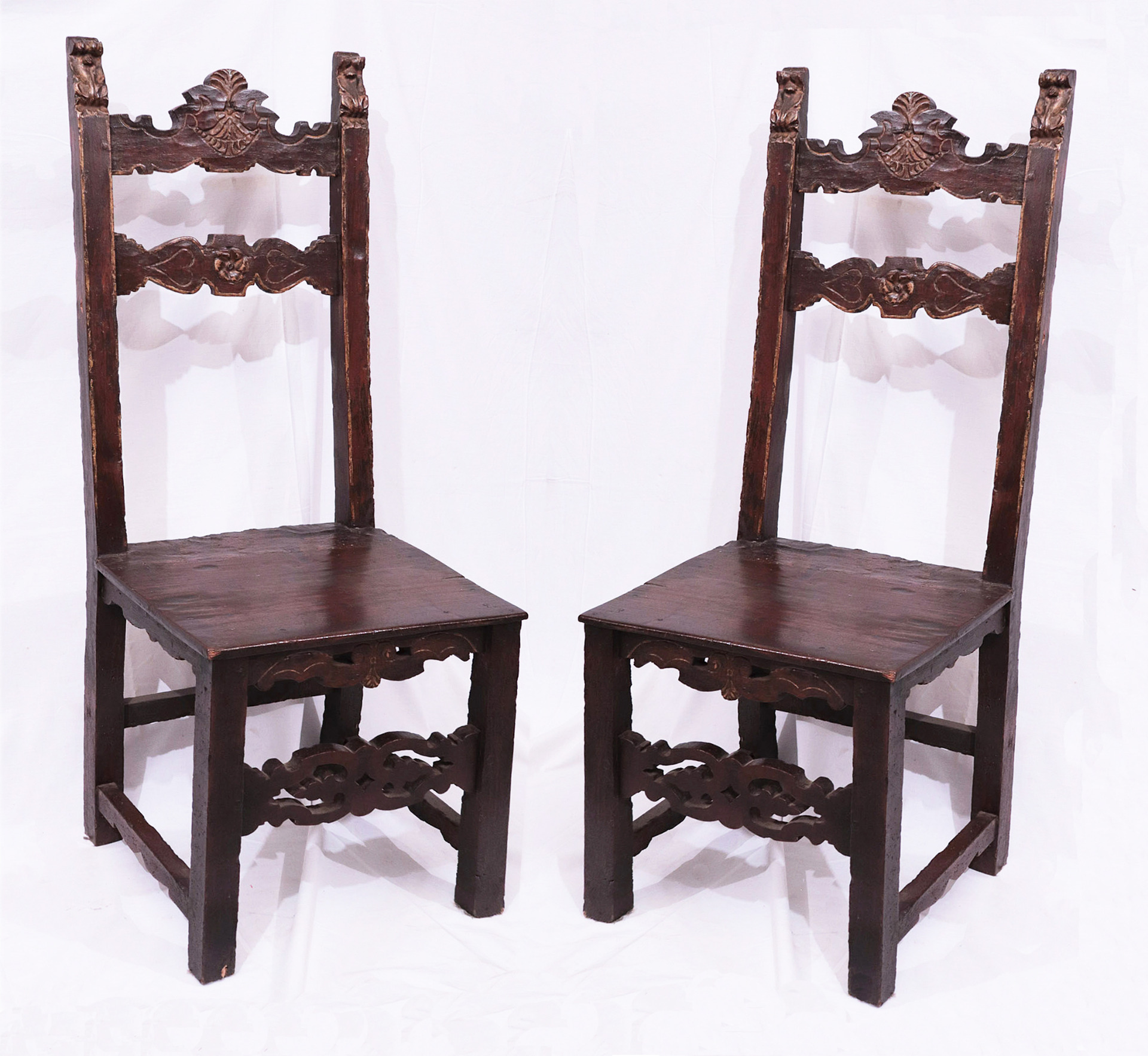 Pair of chairs with high backrests, carved and highlighted in gold. They are very beautiful and still have their original patina. They are not ideal for everyday use as seats, but are very scenic and decorative.