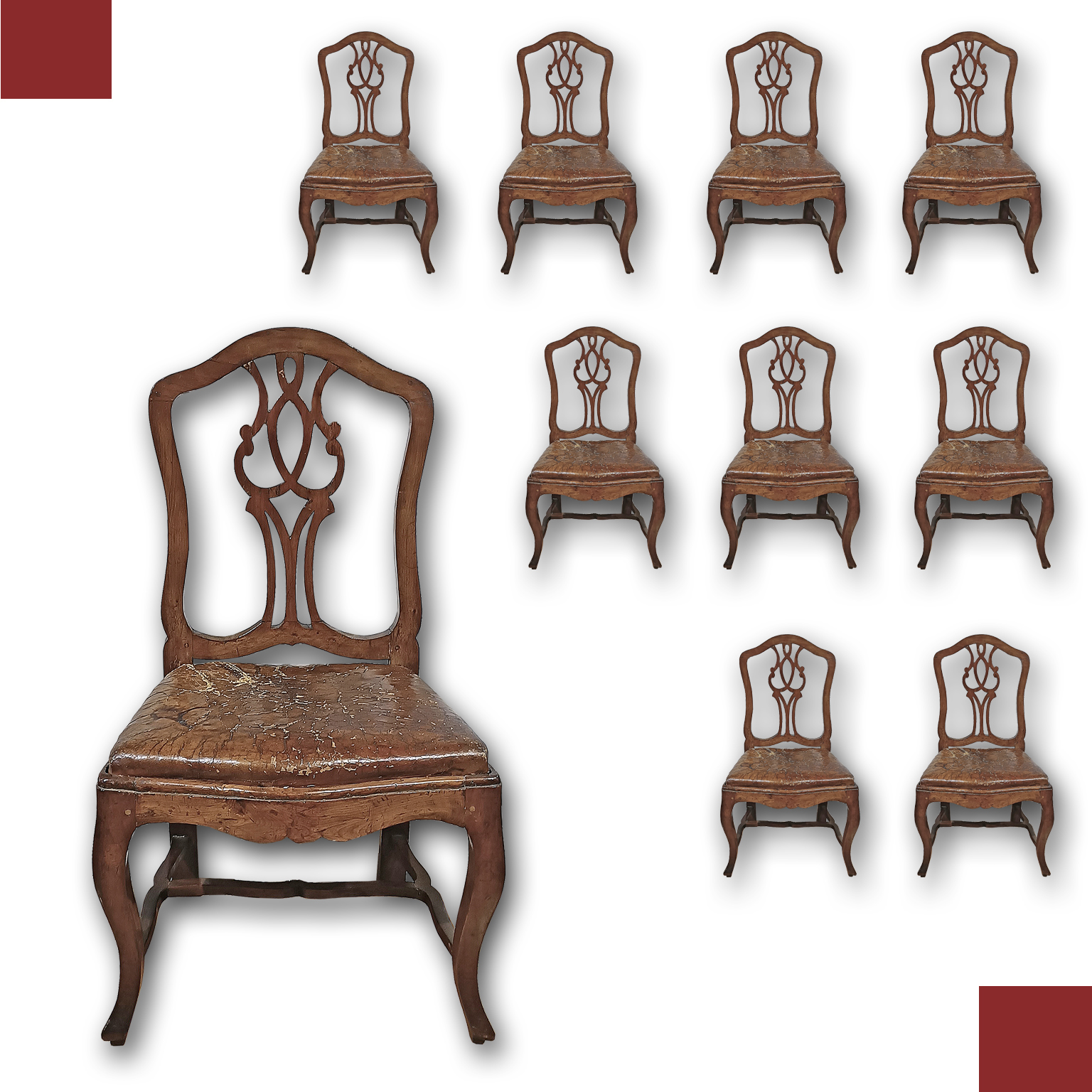 Elegant set of ten solid walnut chairs, finely hand-carved. The chairs are characterized by curved legs and profile, while the backrest features carvings that create geometric patterns. The seat is comfortable and embellished with original leather upholstery. These are finely crafted chairs, capable of furnishing any environment with elegance, class and a touch of antiquity. Tuscan manufacture, from the Louis XV period, around the mid-18th century.
