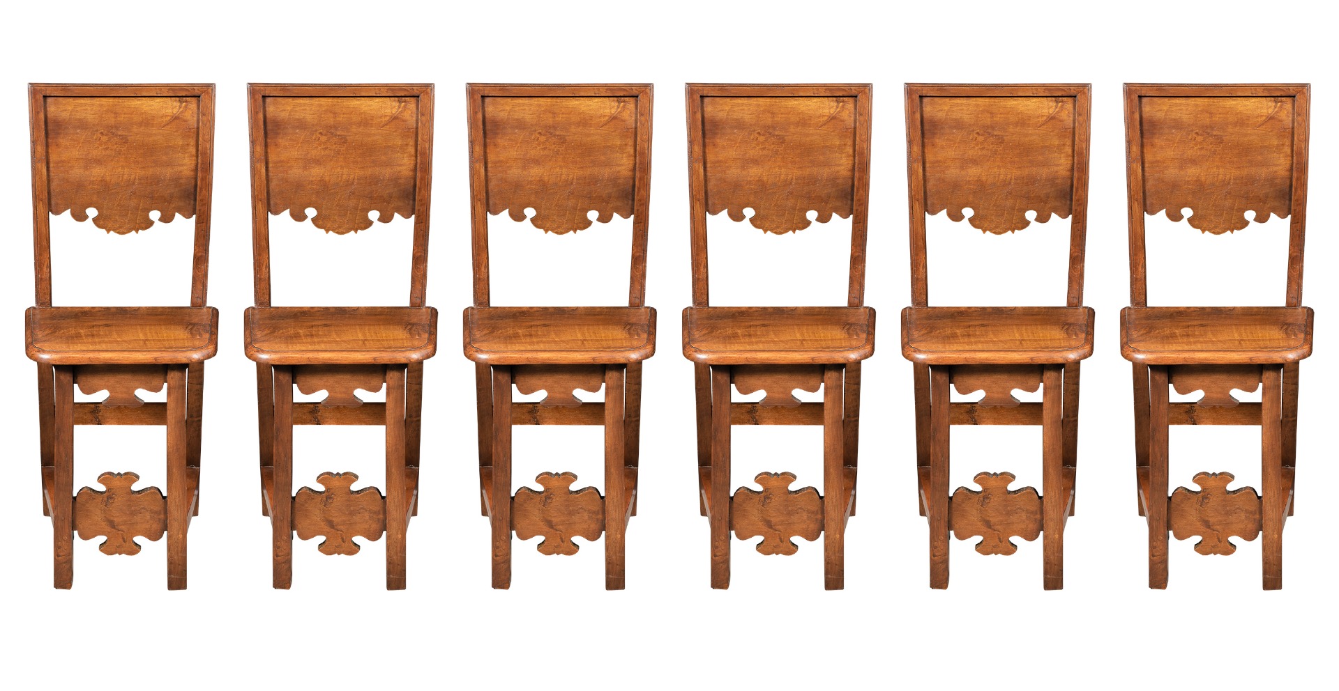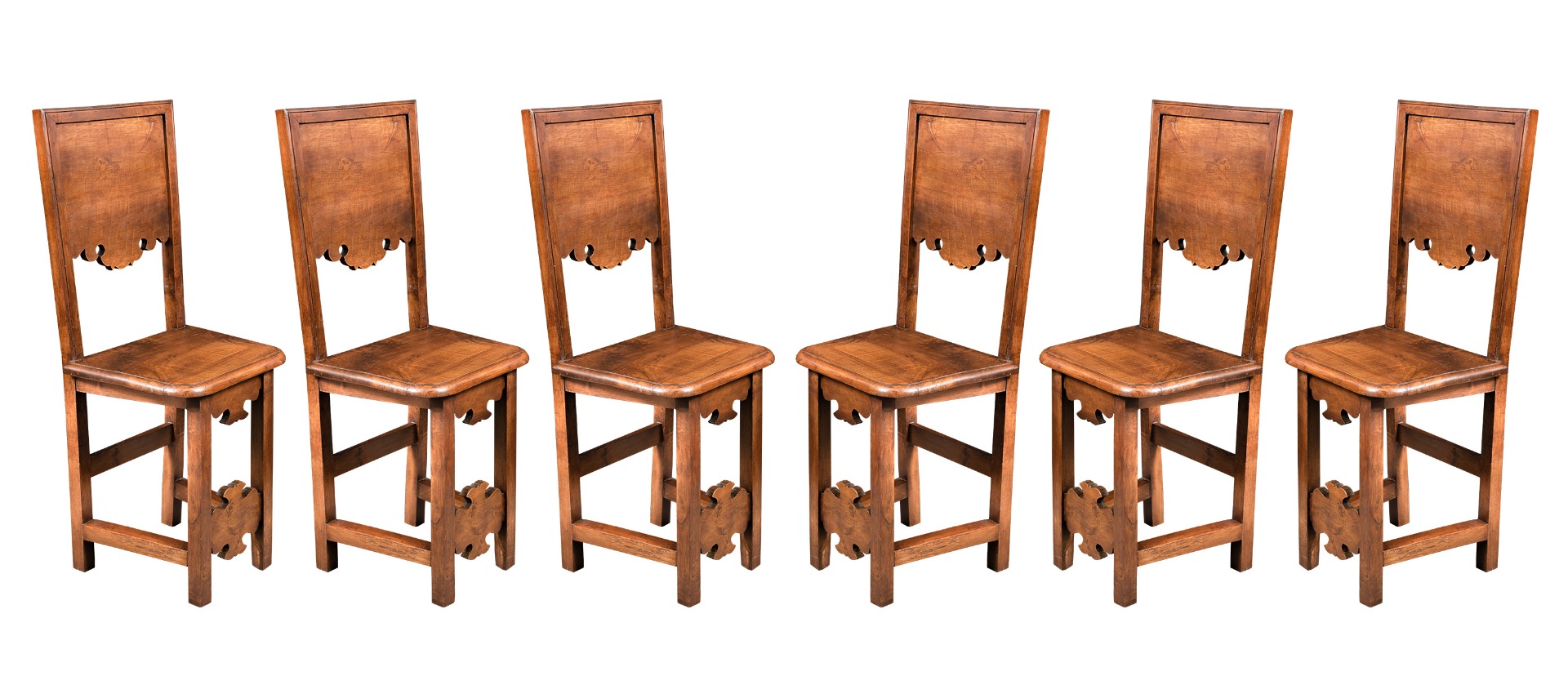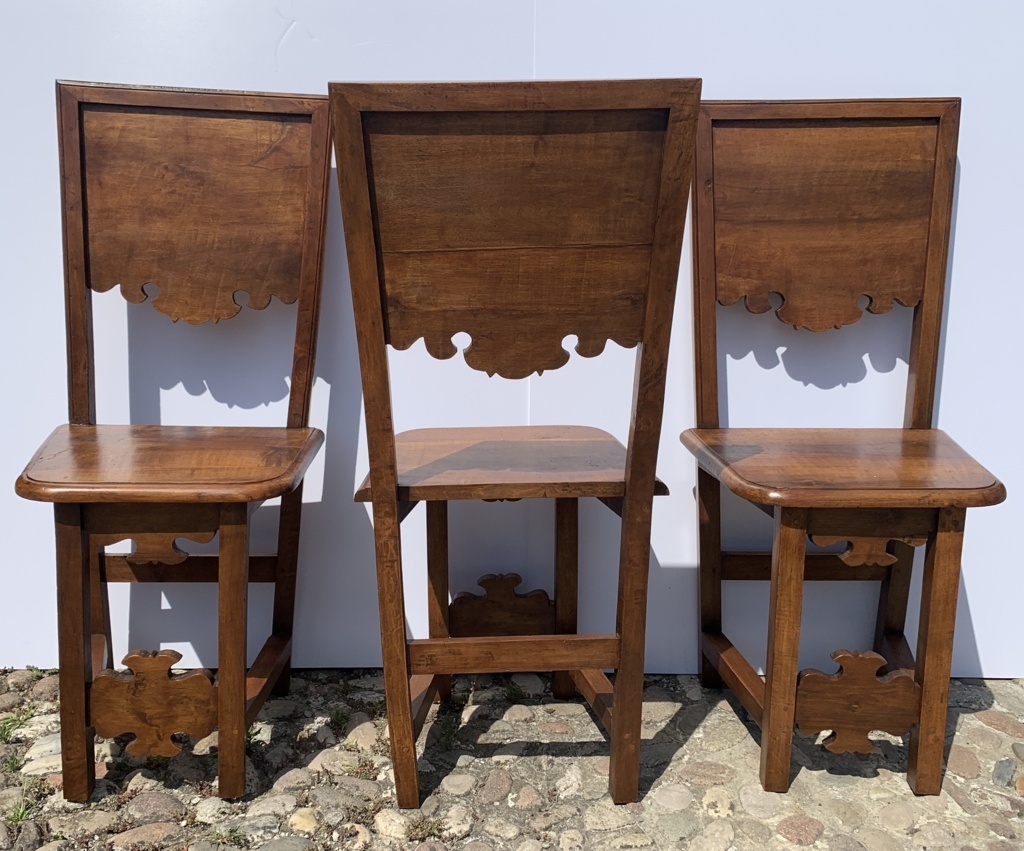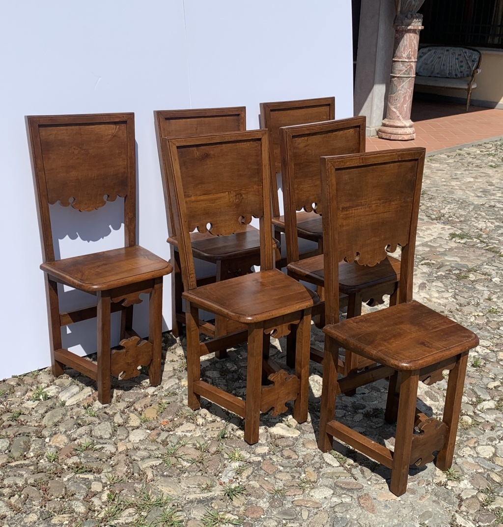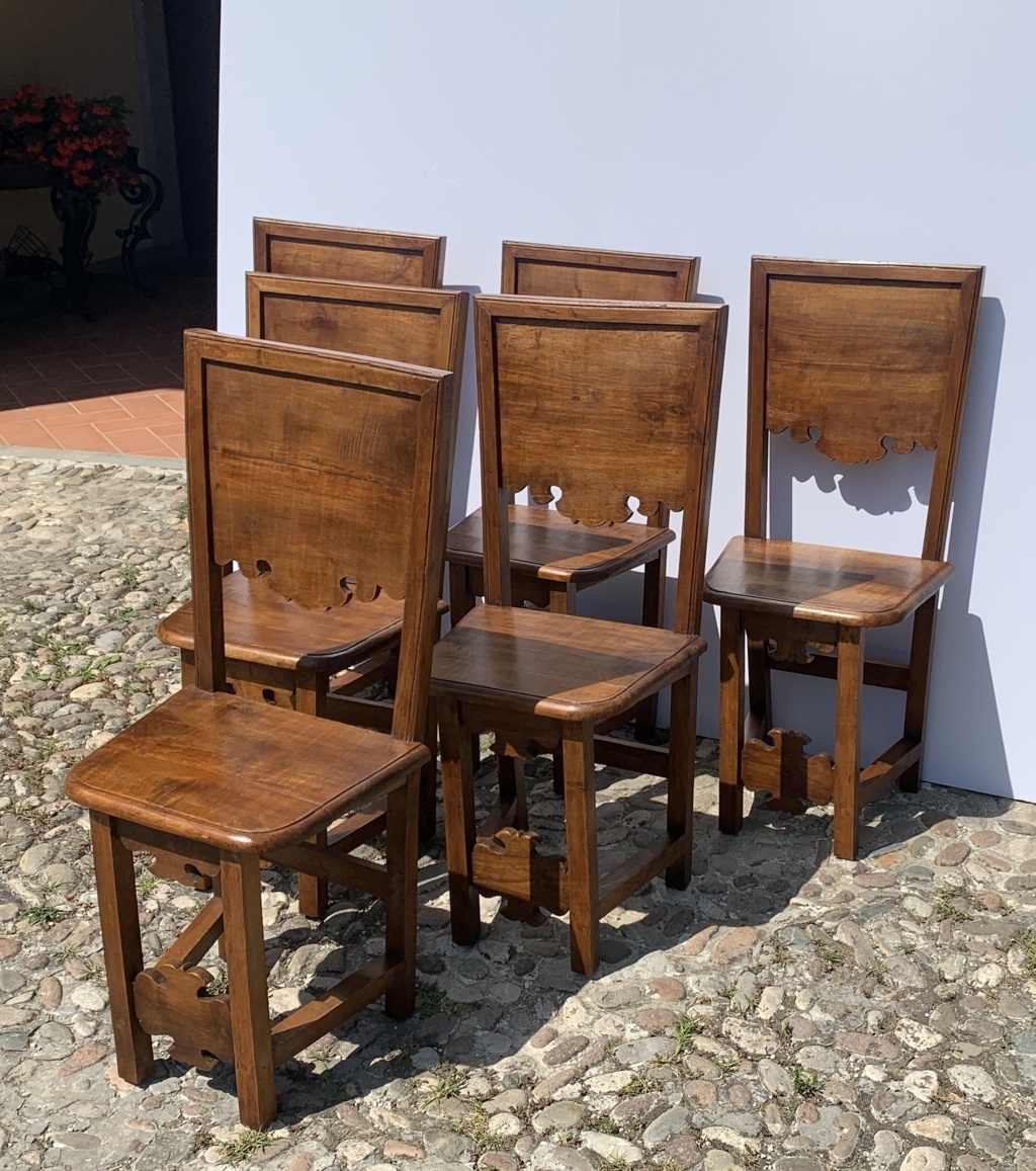 Six friar chairs in solid walnut. Friuli, 17th century.