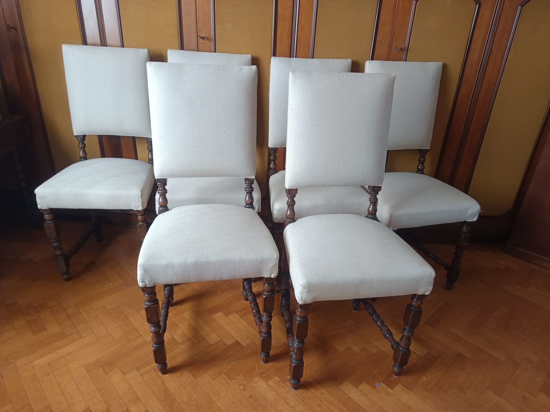 Six walnut spool chairs in excellent condition, with upholstered seats and backs.