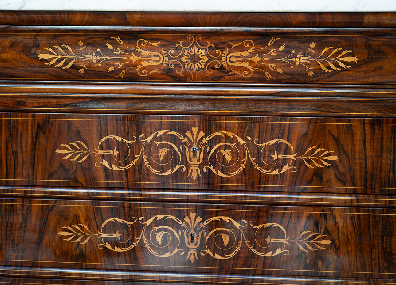 The front is divided into three large drawers adorned with maple profiles with floral inlays in the center.