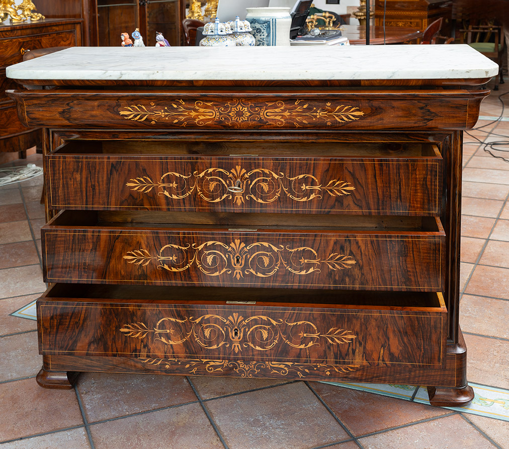 Description: Antique French Charles X chest of drawers in walnut burl with maple inlay and marble top.