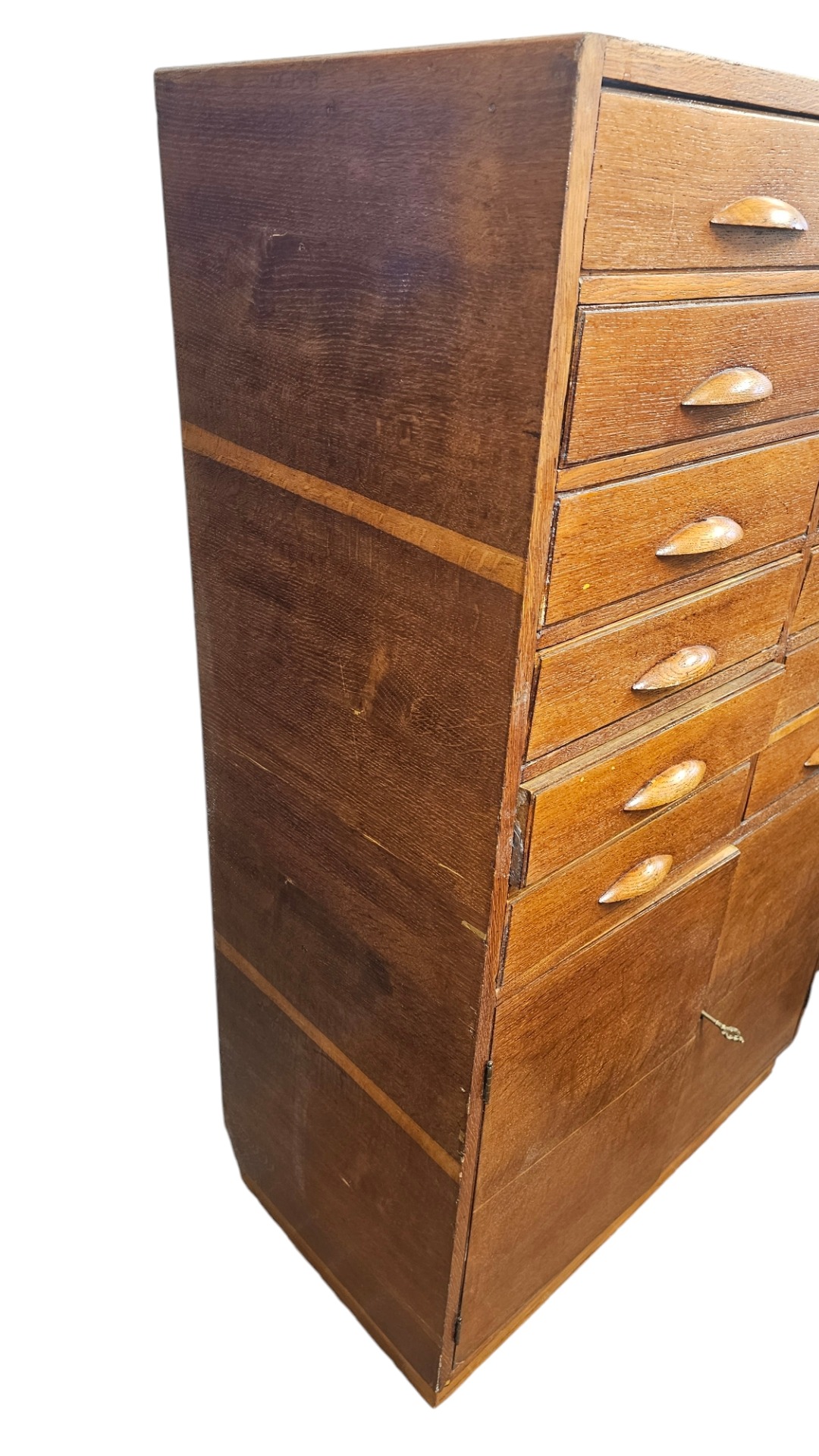 Beautiful oak office chest of drawers with flap drawers. 2 small doors in the lower part. Shellac polishing. Measures ninety in width, forty in depth, and one hundred and forty in height.