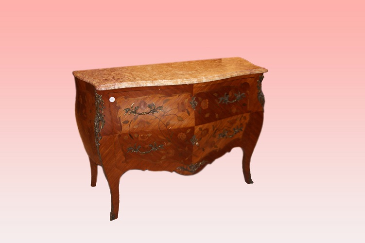 Cassettone francese a 2 grandi cassetti della seconda metà del 1800, stile Luigi XV, in legno di bois de rose. Presenta piano in marmo chiaro, applicazioni in bronzo e ricchi motivi di intarsio floreale sui lati e sul fronte.