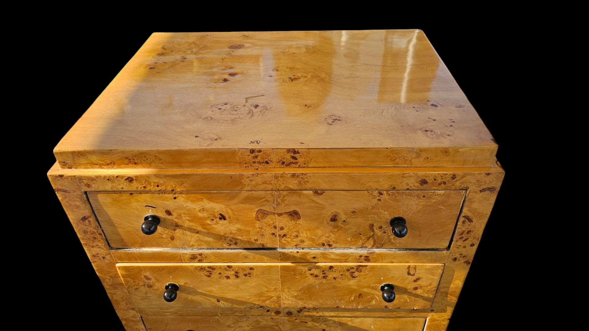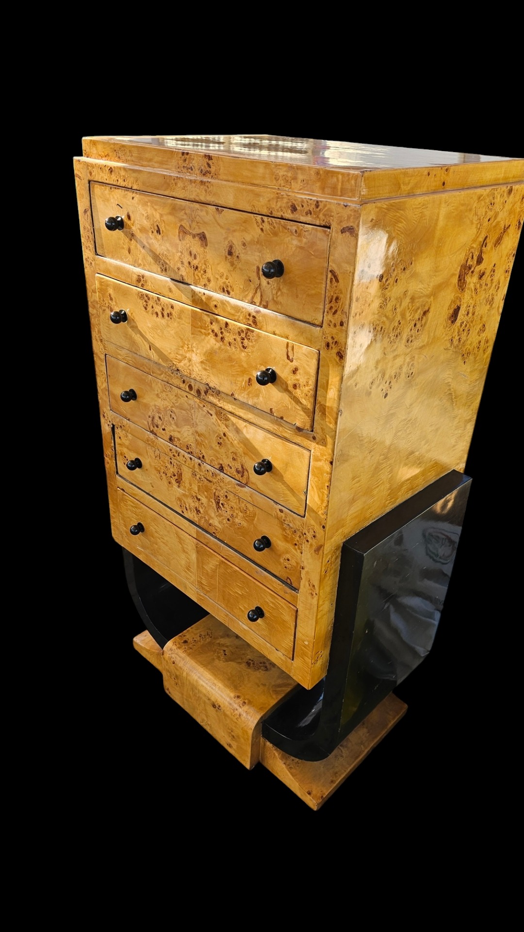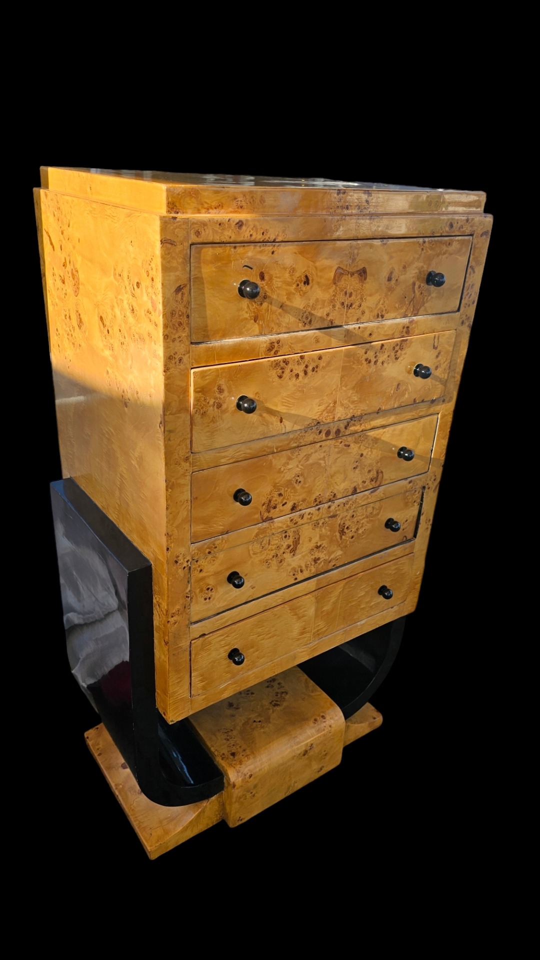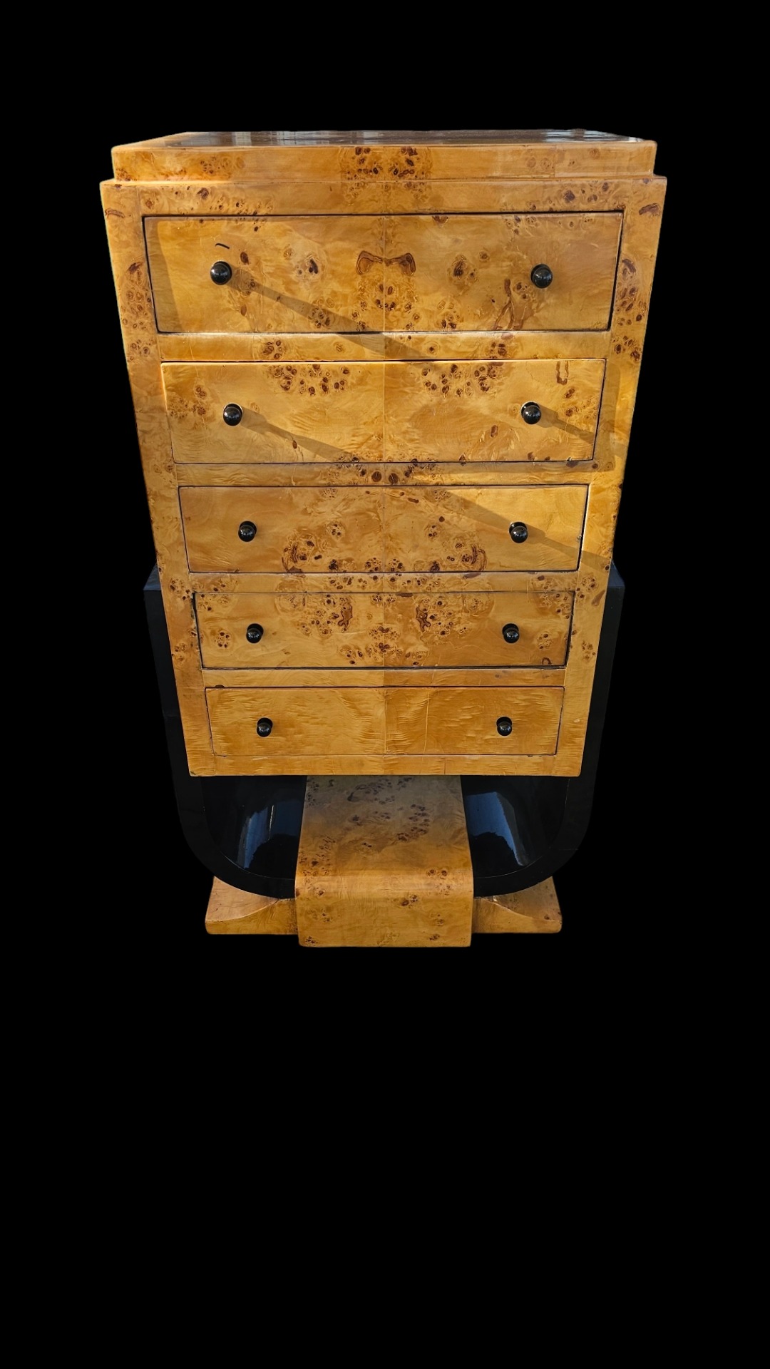 Go to the Art Deco Enrica di Betoole chest of drawers with a curved and veneered base. It measures sixty-three wide, forty-three deep, and one hundred and twenty-five high. It's from the 1940s. French polish.