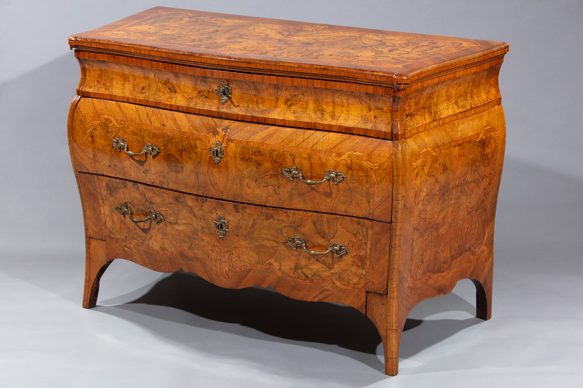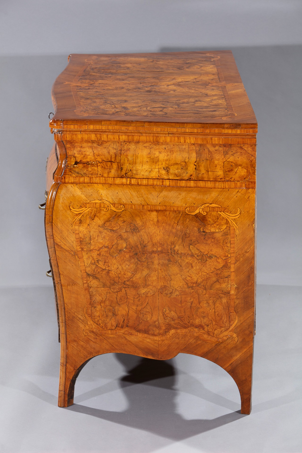 Chest of drawers veneered in walnut and walnut burl, Lombardy, mid-18th century.Shaped body with a double curved form, the front punctuated by two drawers decorated with a single frame adorned at the corners and in the center of the sides with small leafy elements. Under the top, a smaller drawer conceals a chest of drawers inside. The top and sides are decorated similarly to the front. Shaped apron and saber legs, cm 90x131x64