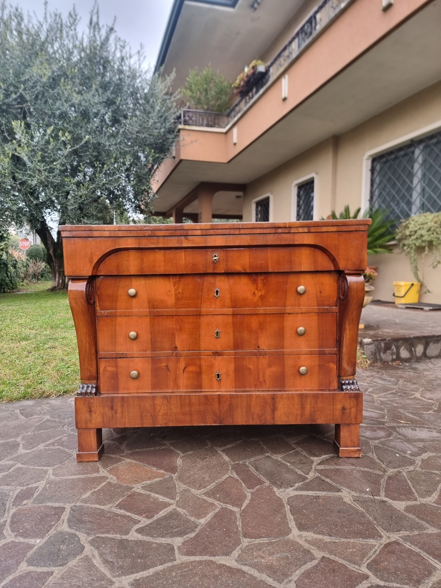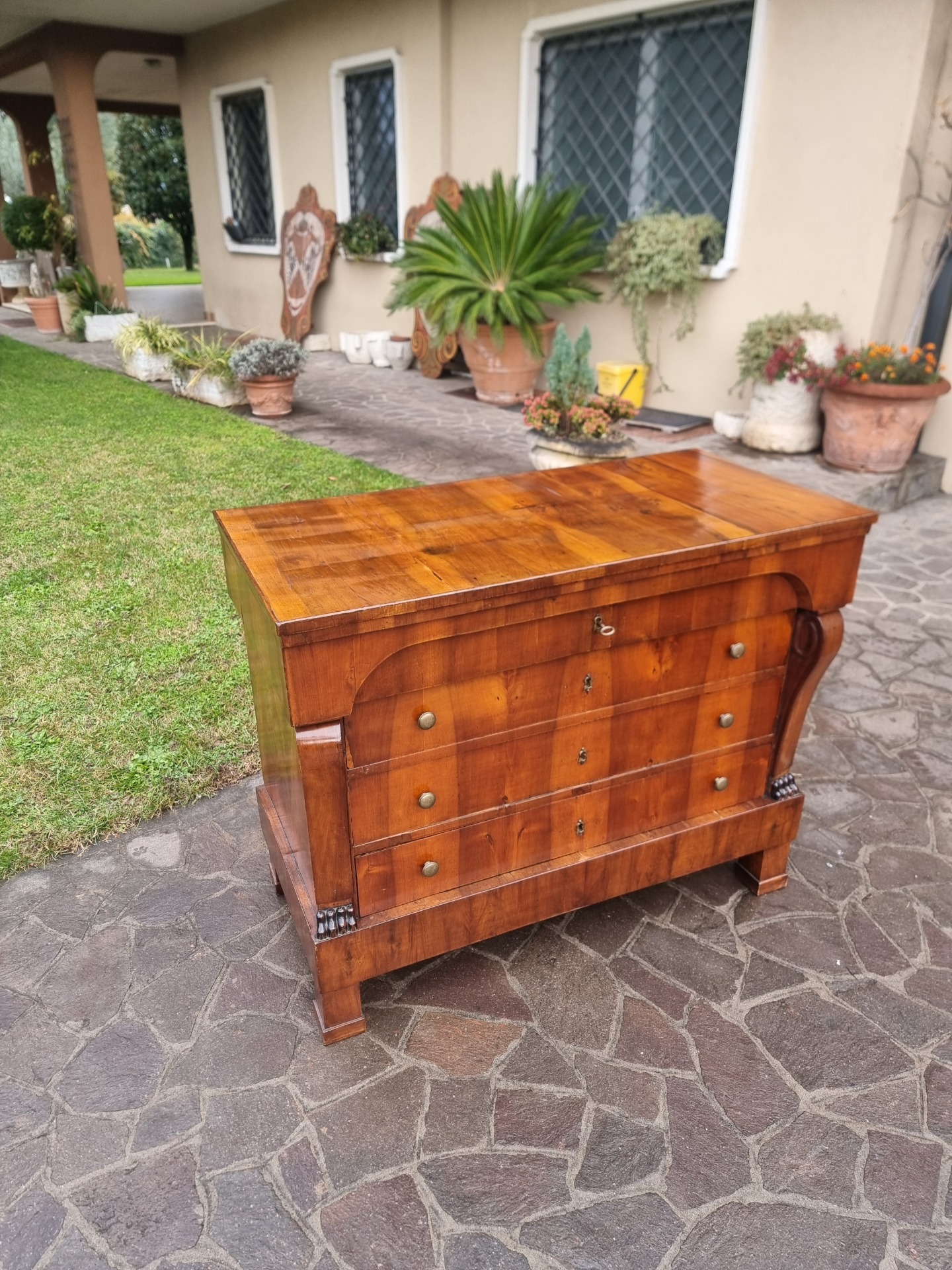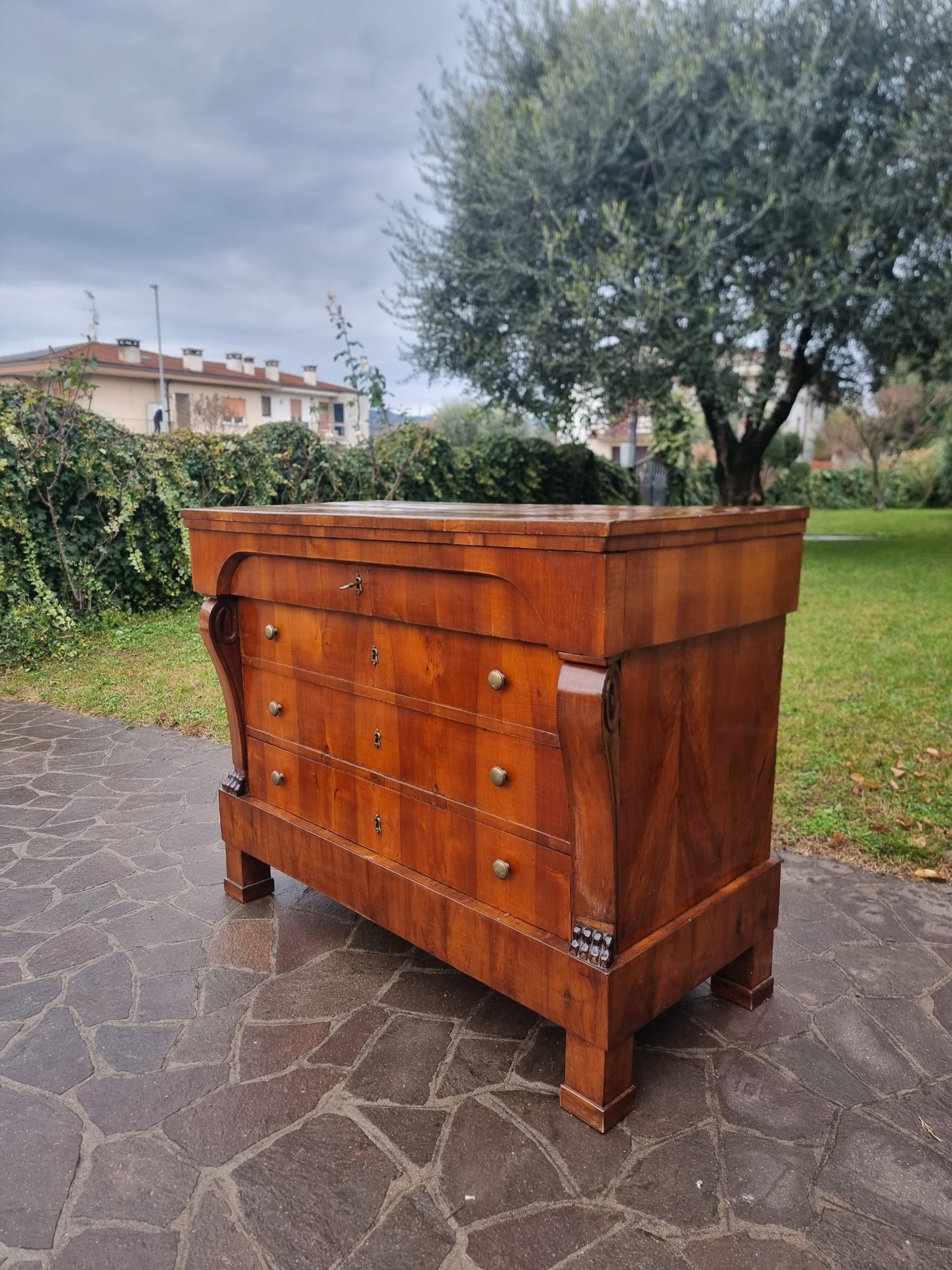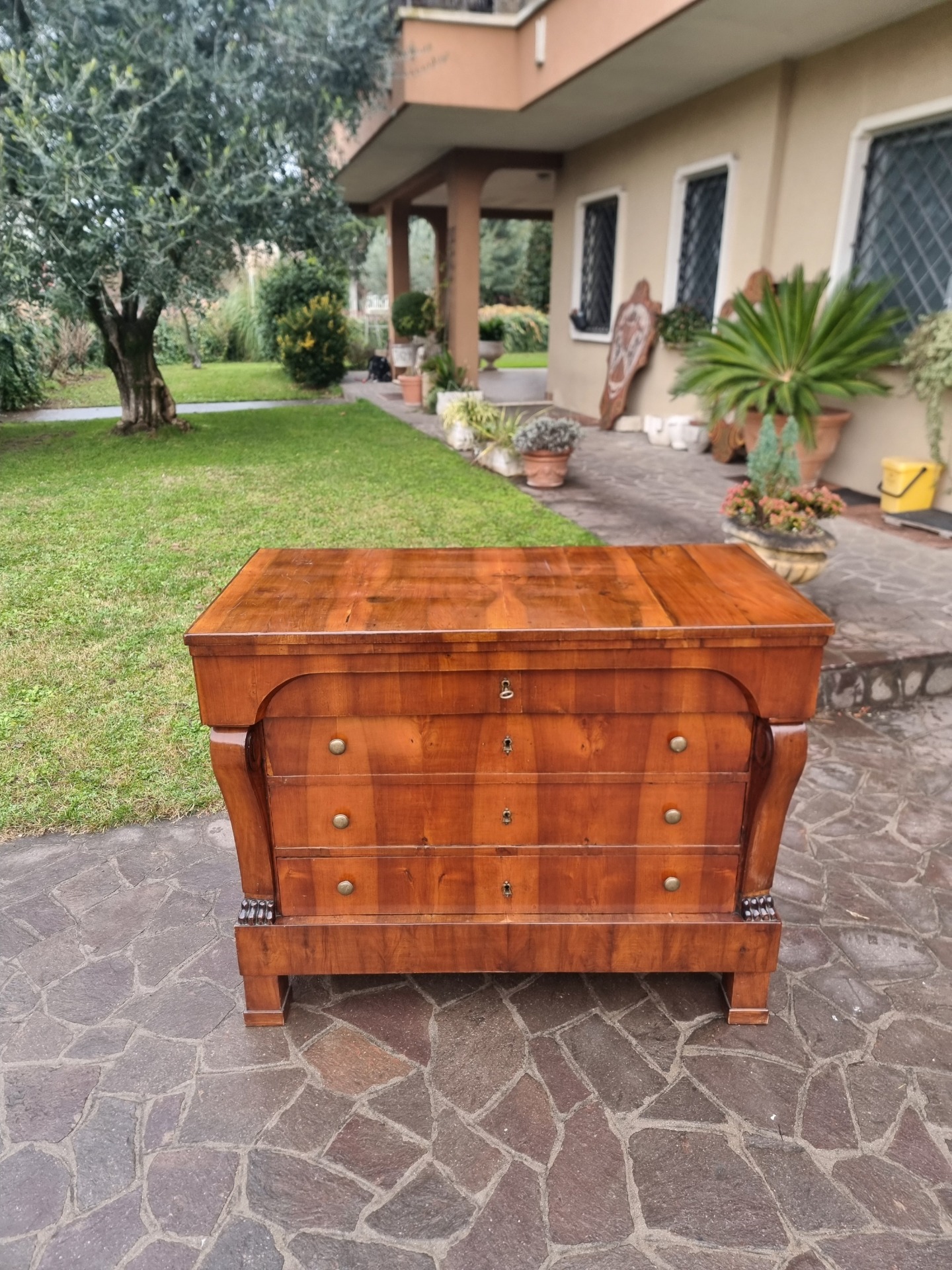 Comò Impero 1830 in noce impiallacciato Eleganza storica e fascino senza tempo Il Comò Impero 1830 in noce impiallacciato rappresenta una straordinaria testimonianza dell’arte ebanistica italiana dell’Ottocento. Grazie alla sua linea armoniosa, alla struttura solida e alla splendida patina originale, questo mobile incarna un equilibrio raro tra estetica, funzionalità e valore storico. In buone condizioni generali e con una superficie che esprime tutta la sua autenticità, il comò misura 128×64×H103 cm, proporzioni perfette per integrarsi con eleganza sia in ambienti classici sia in spazi contemporanei. Qualità dei materiali e valore artigianale Realizzato in noce impiallacciato, il mobile presenta venature ricche e calde che, unite alla patina eccezionale, raccontano quasi due secoli di storia. Inoltre, la scelta di materiali pregiati, insieme alla tecnica costruttiva tipica del periodo Impero, conferisce al pezzo un valore che cresce costantemente nel tempo. Nonostante la sua età, il comò mostra una struttura robusta e raffinata che dimostra la perizia degli artigiani dell’epoca. Perché scegliere un autentico mobile Impero Acquistare un mobile antico non significa solo arredare una stanza, ma anche portare nella propria casa un elemento che aggiunge carattere, profondità e storia. Questo comò, infatti, è ideale per chi desidera dare un tocco di autenticità senza rinunciare alla funzionalità. Inoltre, grazie alla sua eleganza sobria e alla linearità tipica dello stile Impero, il pezzo si abbina facilmente ad arredi moderni creando un dialogo armonioso tra passato e presente. Inoltre, la presenza della patina originale, combinata con le ottime condizioni generali, rende questo comò un’opportunità particolarmente interessante per collezionisti, interior designer, appassionati di antiquariato e per chi cerca un complemento d’arredo che sappia davvero distinguersi. Spedizioni affidabili e servizi professionali Spediamo in tutto il mondo tramite FedEx – UPS – DHL, garantendo imballaggio professionale e assicurazione completa. La spedizione in tutta Europa è da convenire. Pagamento tramite bonifico bancario, Visa e Mastercard.