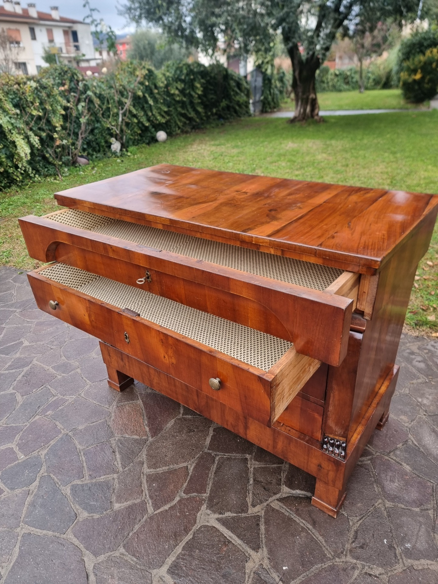 Comò Impero 1830 in noce impiallacciato Eleganza storica e fascino senza tempo Il Comò Impero 1830 in noce impiallacciato rappresenta una straordinaria testimonianza dell’arte ebanistica italiana dell’Ottocento. Grazie alla sua linea armoniosa, alla struttura solida...