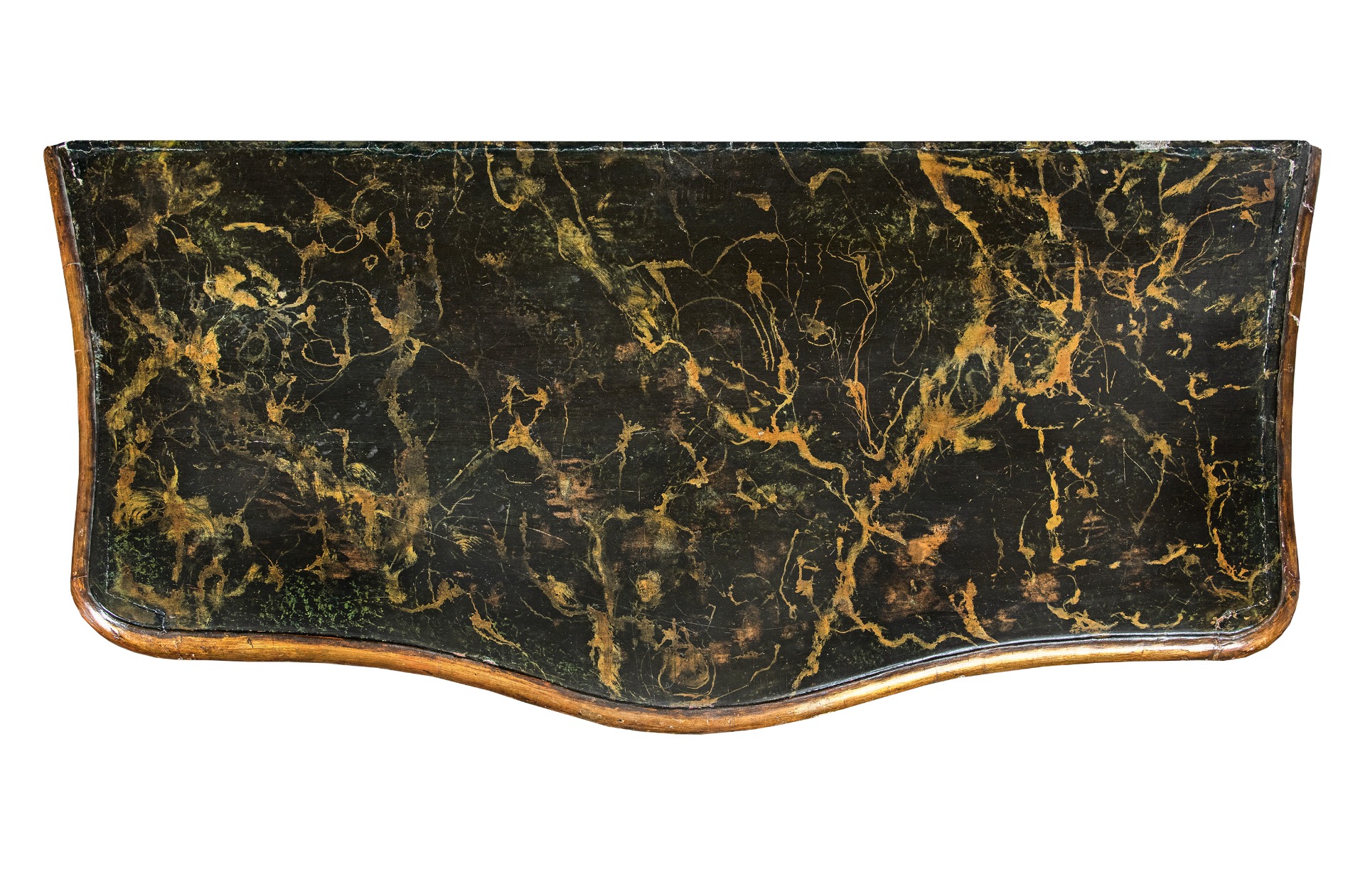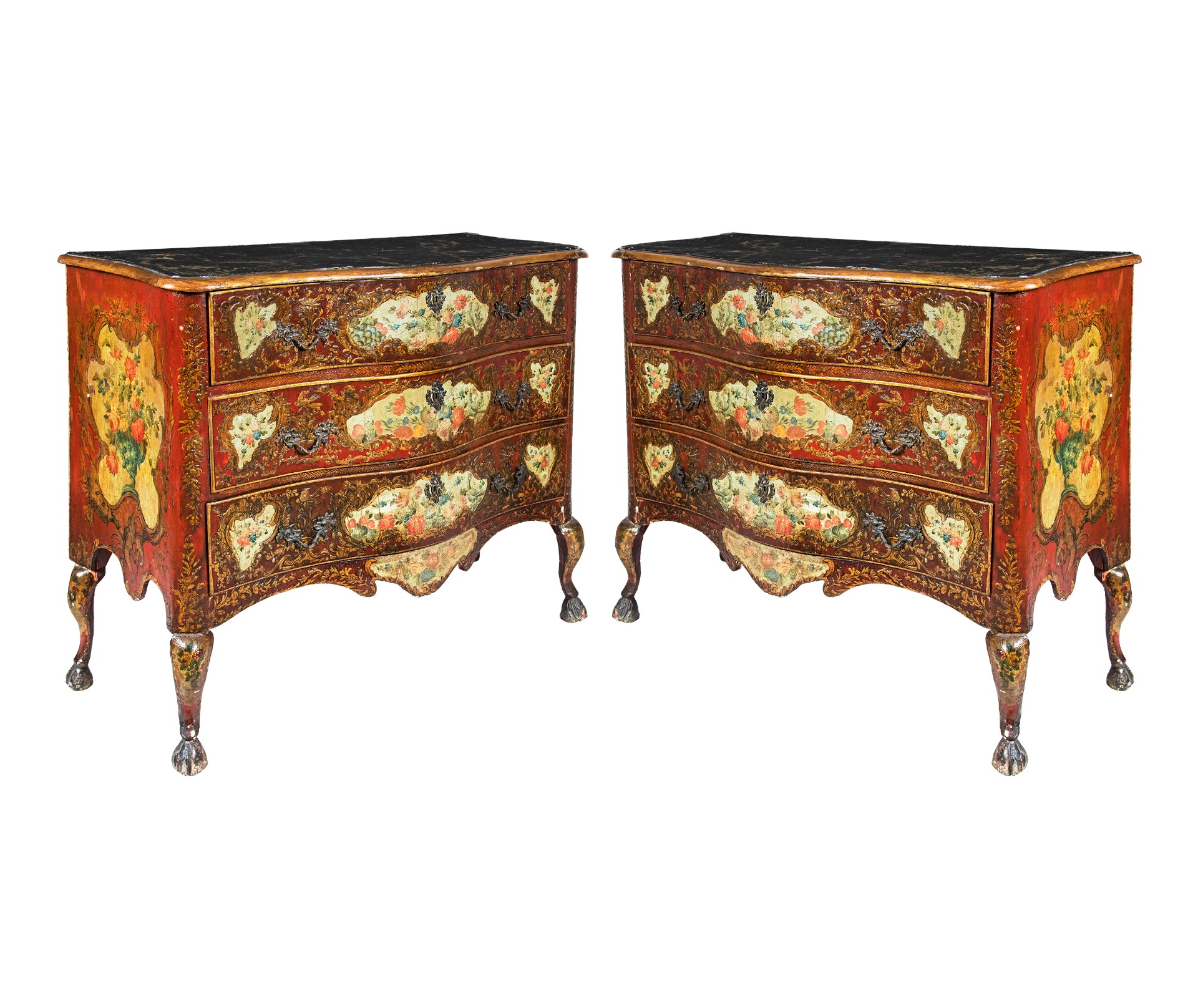 Decorazioni in pastiglia dorata a rilievo su fondo color rosso vermiglio, che fanno da cornice a cartigli irregolari decorati con composizioni floreali policrome. Piano dipinto a finto marmo venato. Fronte mosso a tre cassetti, poggiante su eleganti gambe cabriole terminate con piedi a zoccolo di cervo.