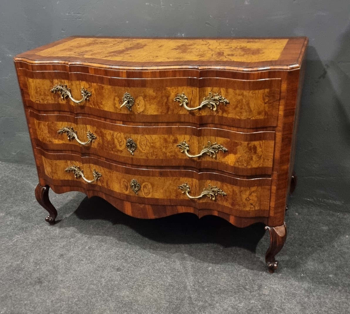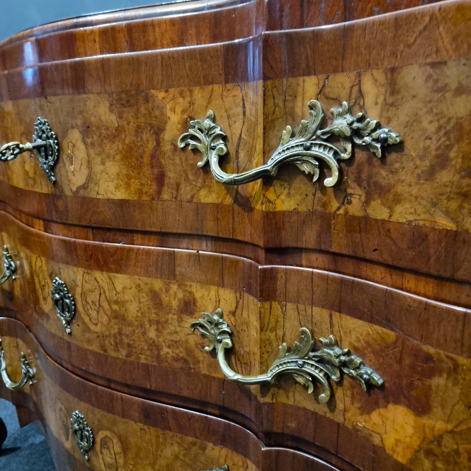 The chest of drawers measures 126 cm in width, 62 cm in depth and 95 cm in height, dimensions that make it ideal for fitting into different living spaces. In good general condition, it retains an original patina that gives it an authentic charm and the typical "wrinkles of time" that enhance its historical value. The grains of the walnut and olive wood stand out with great beauty, creating a play of natural and warm colors.