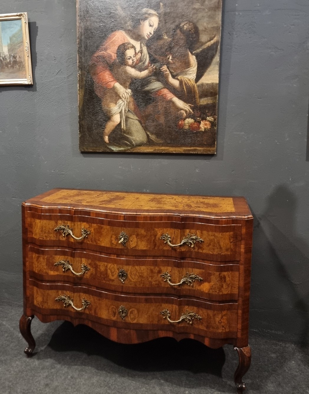 This splendid Emilian chest of drawers dates back to the 18th century and is made of walnut and olive wood, two precious materials that give the furniture timeless elegance. Its solid structure and the quality of the materials used are testimony to the craftsmanship of the time. Ideal for those looking for a piece of furniture that tells a story, this chest of drawers is perfect for enhancing a classic environment or creating a refined contrast in a modern context.
