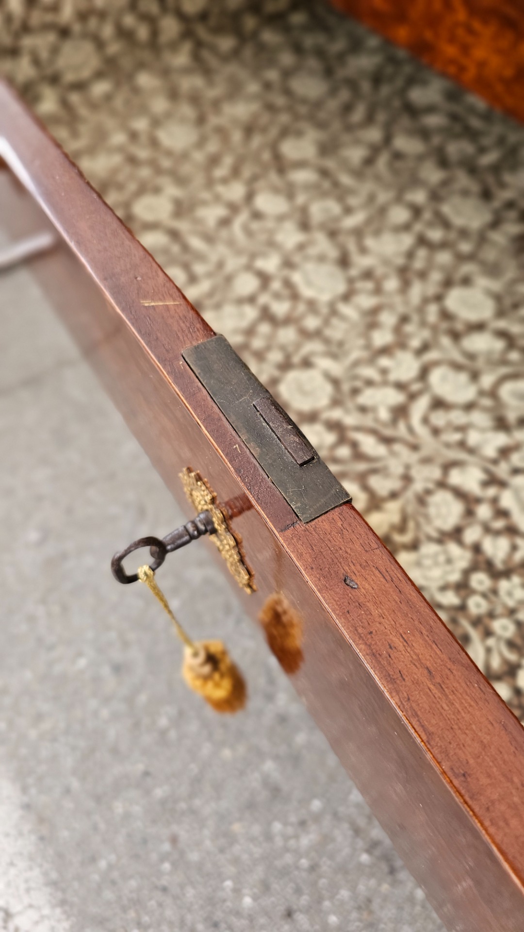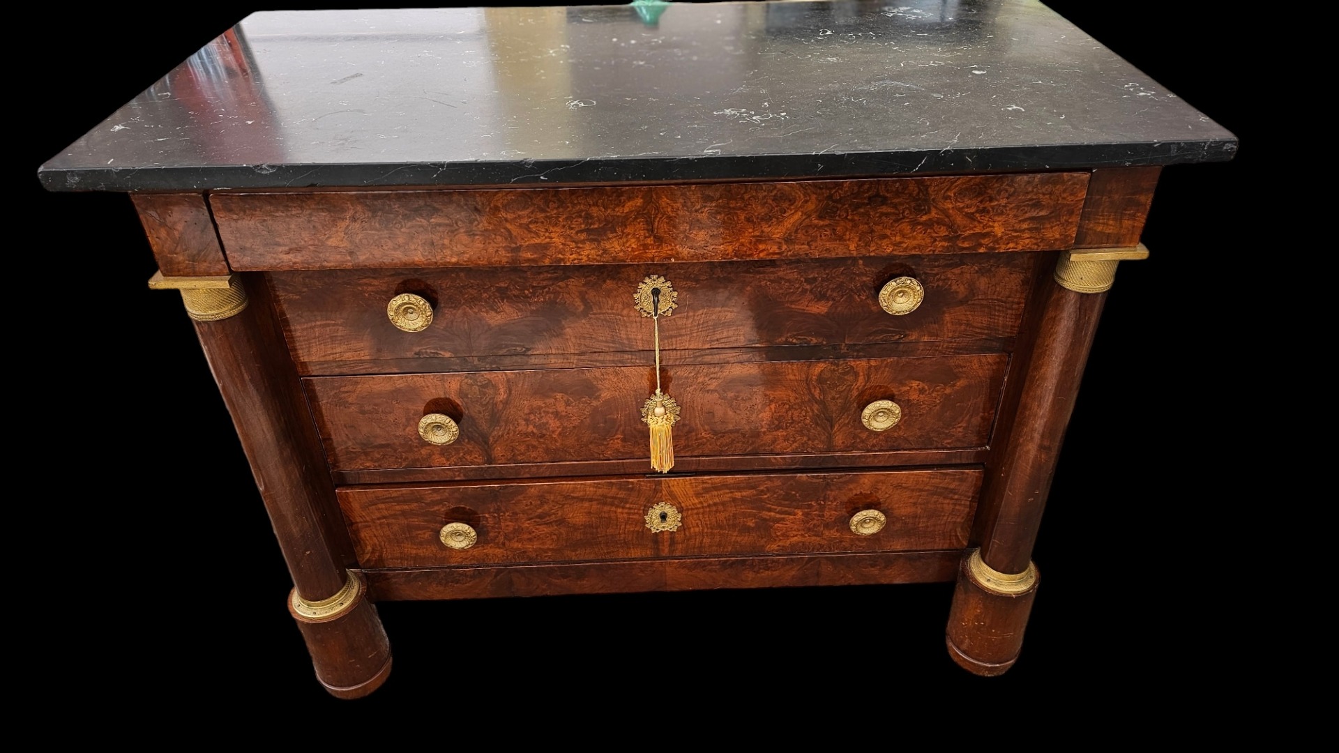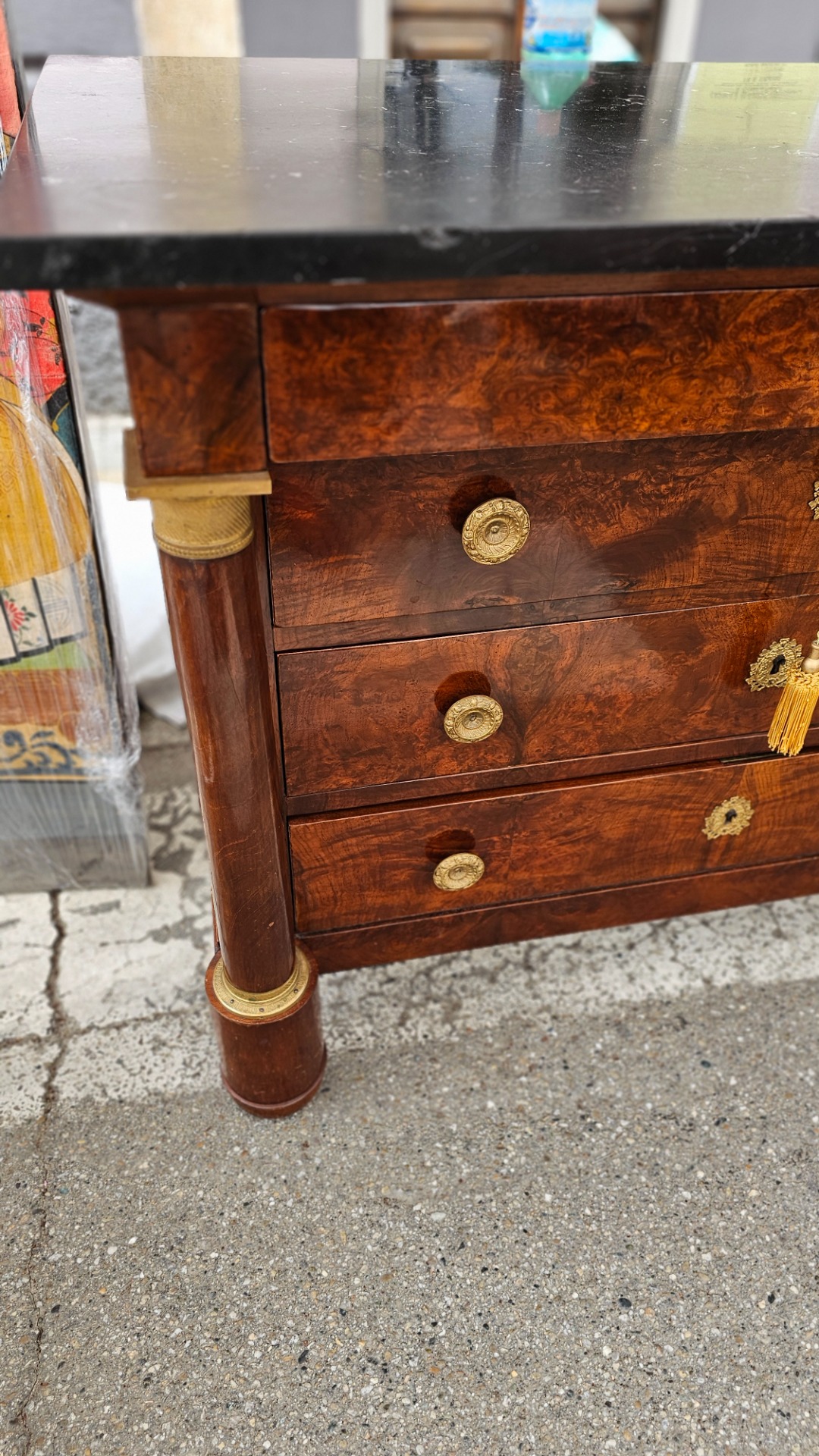 Beautiful Empire chest of drawers, walnut burl veneer with mercury-gilded bronzes. Black Belgian marble top. Round column. First-rate, perfect example. Measures one hundred and twenty by sixty, height eighty-five.