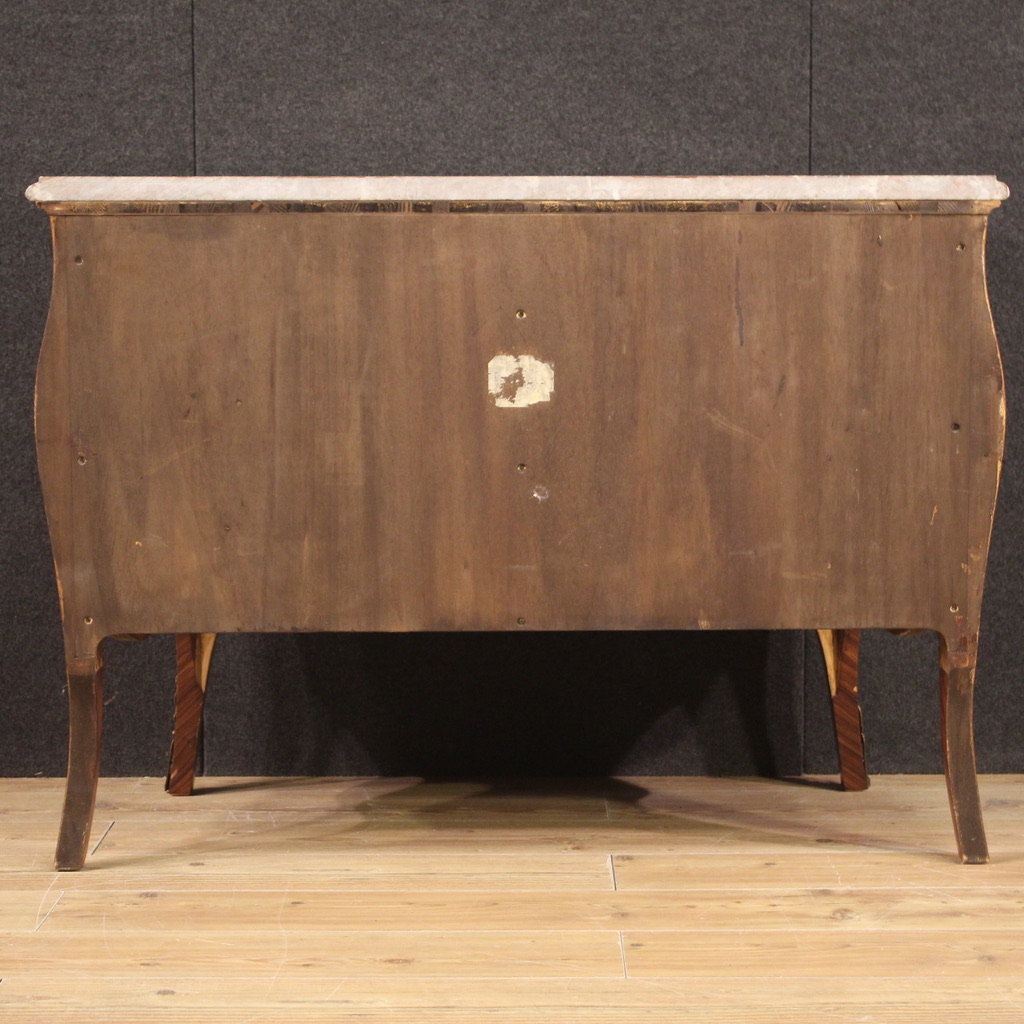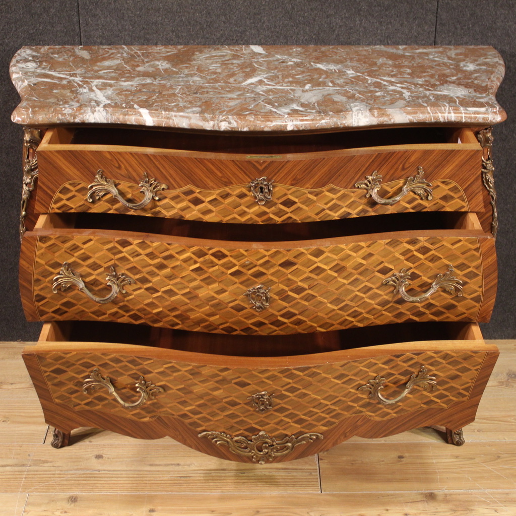 cod. 10898French chest of drawers from the second half of the 20th century. Furniture pleasantly inlaid with geometric decoration in walnut, maple, ebonized wood and fruitwood in Louis XV style. Dresser equipped with three drawers of good capacity, first drawer (upper) complete with working key. Original marble top of excellent quality. Wavy and rounded chest of drawers, with beautiful lines and pleasant furnishings, ideal for a bedroom or living room. Furniture part of a complete set of bedside tables (see photo and request the bulk price if available). Chest of drawers in good condition.