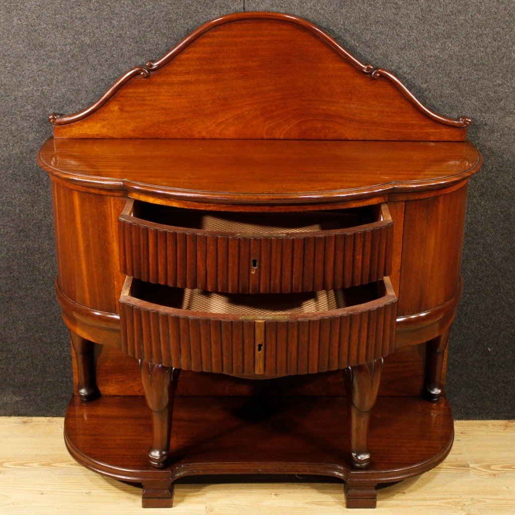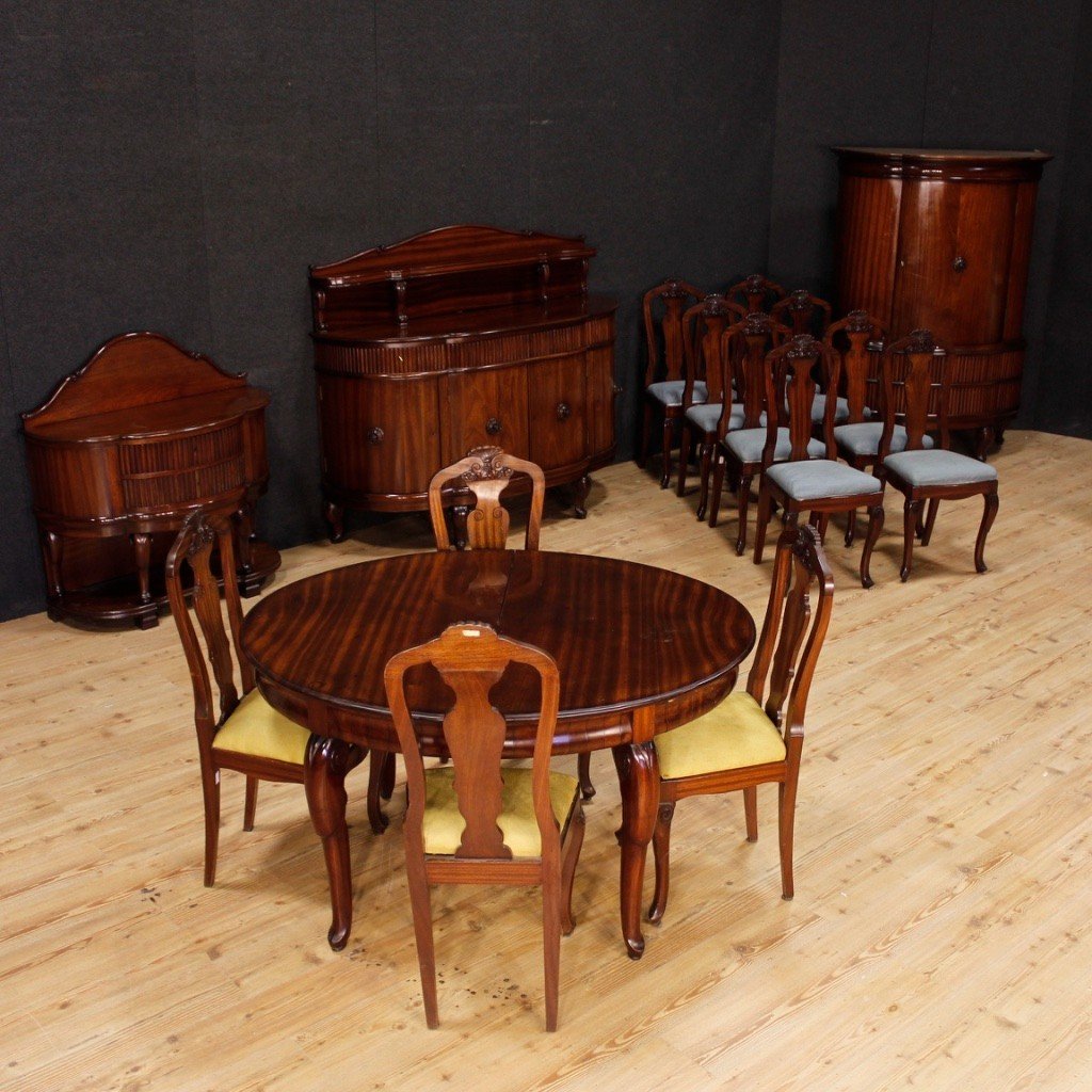 French dresser from the first half of the 20th century. Chest of drawers in mahogany wood of great quality. Furniture with two drawers of excellent capacity and service, equipped with a working key. It presents some signs of wear, overall in good state of conservation. Dresser that is part of a dining room set complete with an extendable dining table, 12 chairs, a wardrobe and a sideboard (see photo and ask for the bulk price, if available).