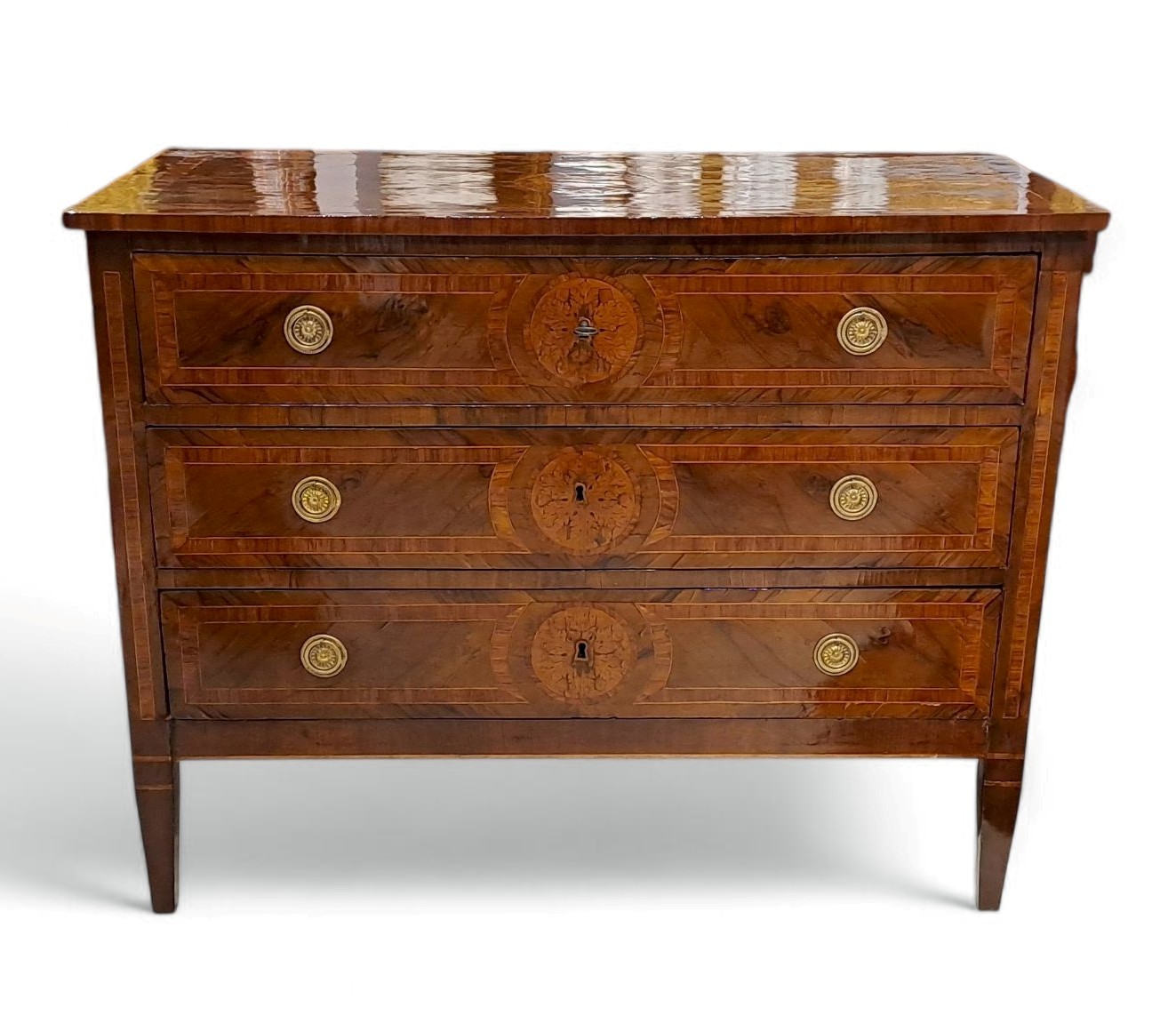 Lombard Louis XVI Chest of Drawers Type: Chest of Drawers Period: Louis XVI, second half of the 18th century. Origin: Lombardy. Detailed description: This antique chest of drawers, an expression of high Lombard and Milanese cabinetmaking, features a solid structure and a linear, squared shape, resting on four elegant truncated pyramid feet. The rigidity of the structural lines is a distinctive feature of the Louis XVI style. The piece of furniture is entirely veneered and inlaid with precious woods, including walnut burl, maple, and bois de rose. The rosette decoration with leaves extends across the front, sides, and top. The front is divided into three drawers of equal size. The handles are made of chased bronze. The dimensions are: 109 x 51, height 86 cm. A regular certificate of authenticity with photo is issued. We guarantee a response to your emails within 24 hours REGISTERED IN THE REGISTER OF EXPERTS AND CTU AT THE COURT OF LA SPEZIA