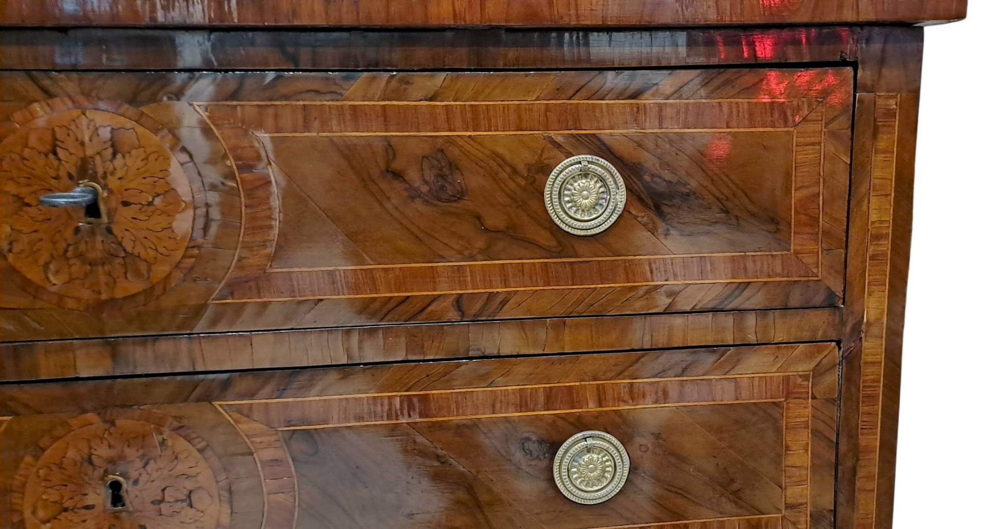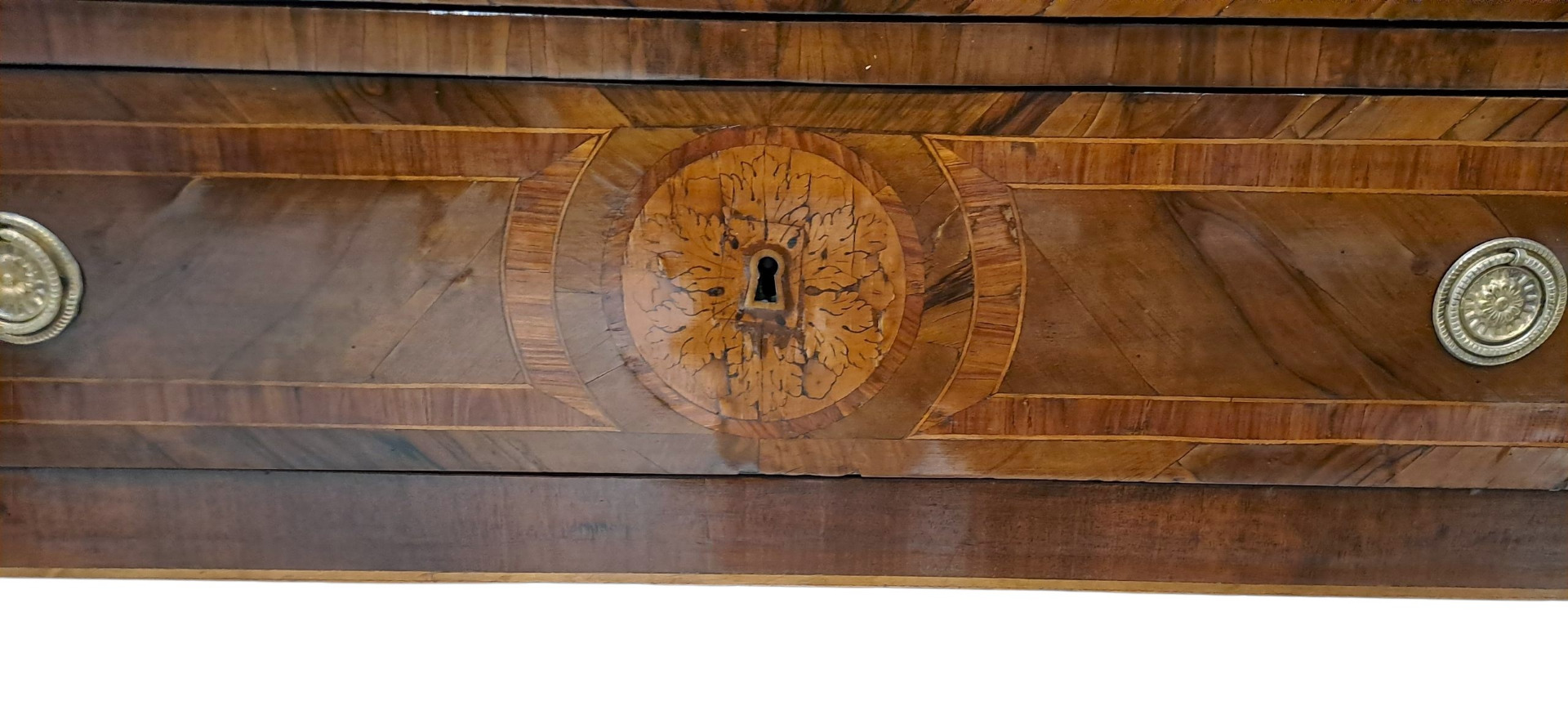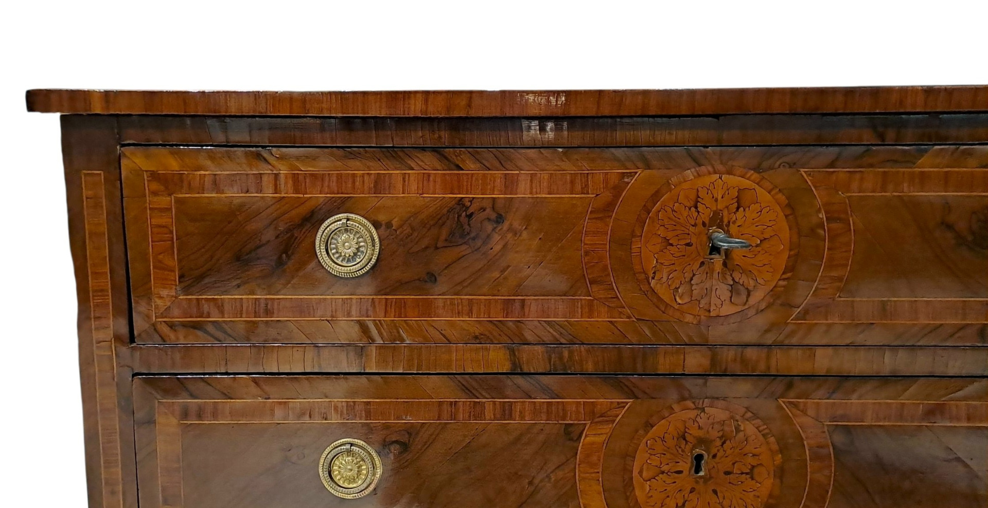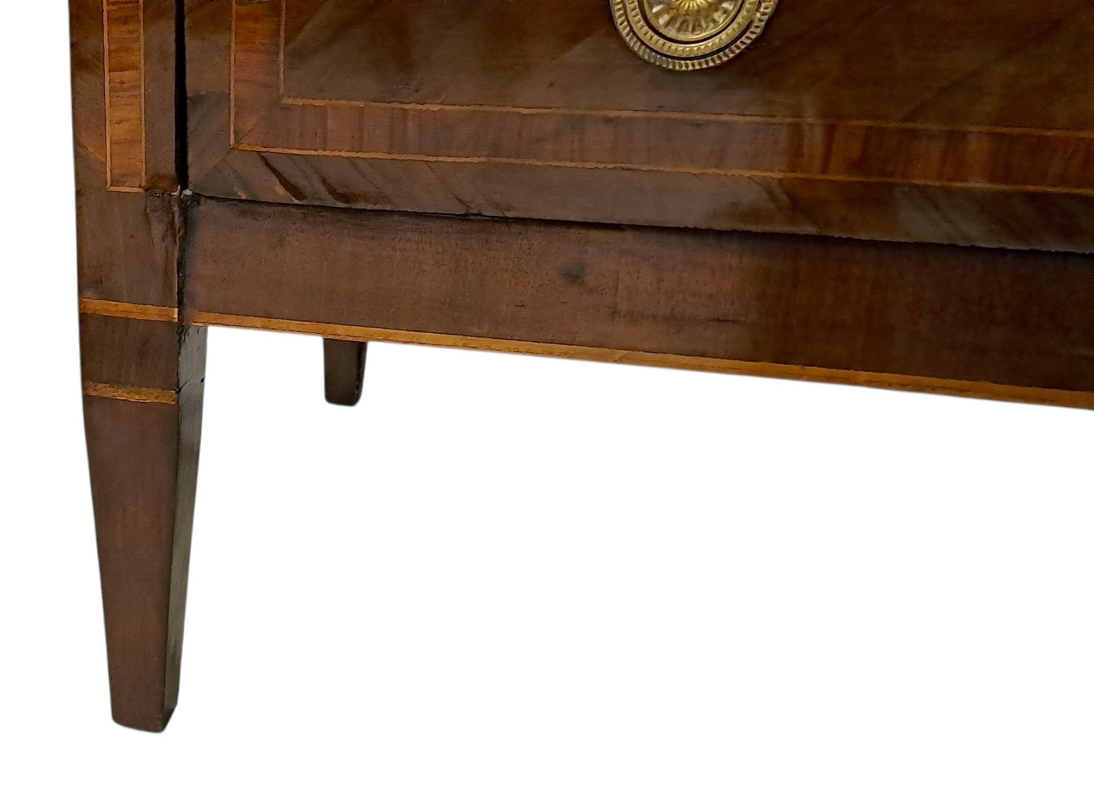 This antique chest of drawers, an expression of high Lombard and Milanese cabinetmaking, features a solid structure and a linear, squared shape, resting on four elegant truncated pyramid feet.