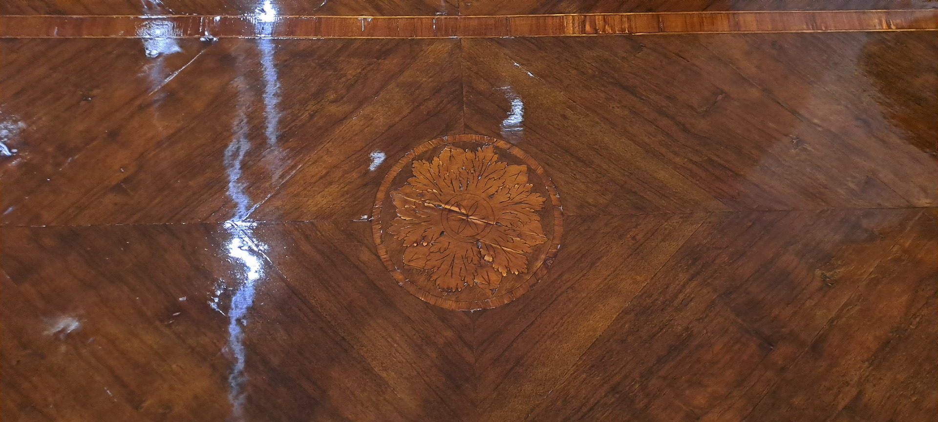 The piece of furniture is entirely veneered and inlaid with precious woods, including walnut burl, maple, and bois de rose.