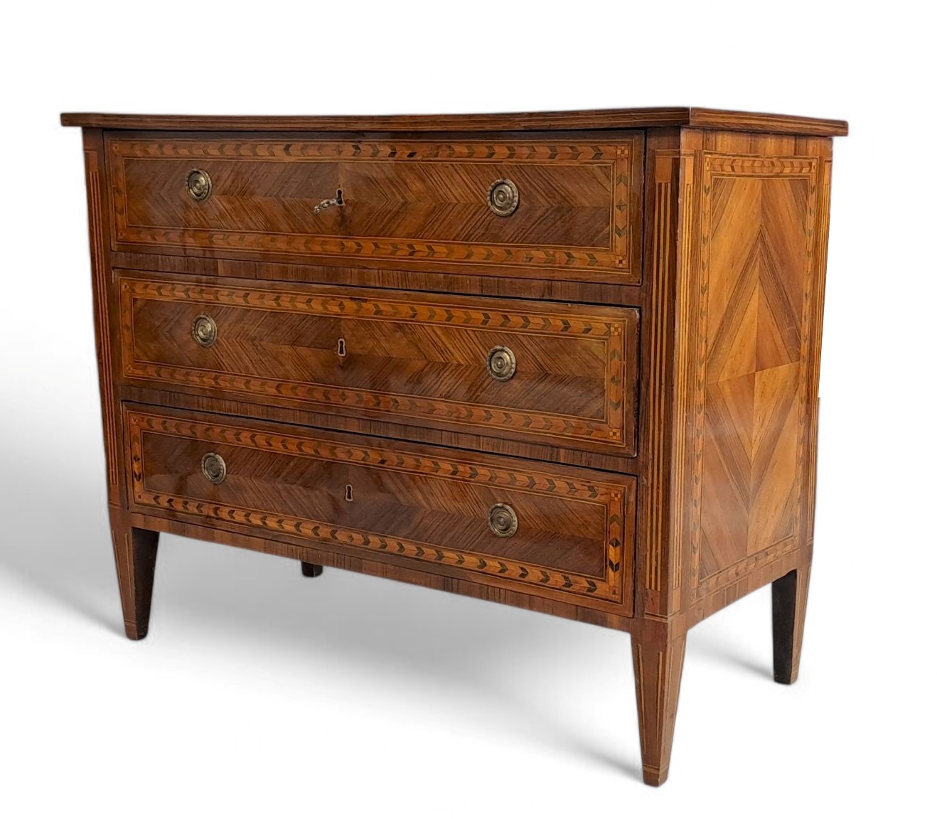 An elegant and refined Piedmontese three-drawer chest of drawers, a valuable example of cabinet-making from the second half of the 18th century (circa 1770-1790), in full Louis XVI style.