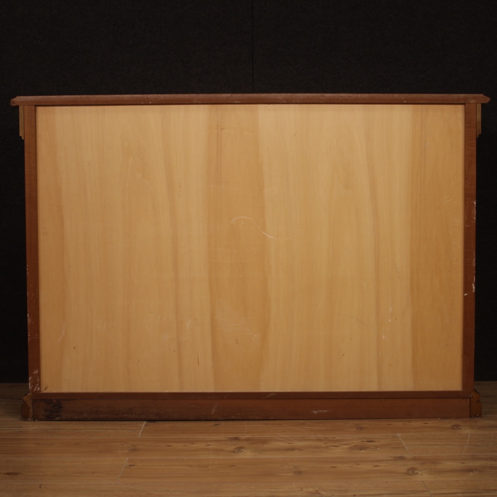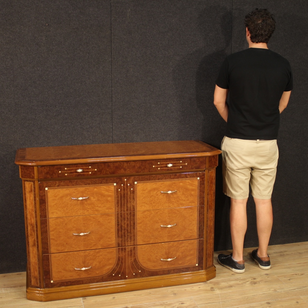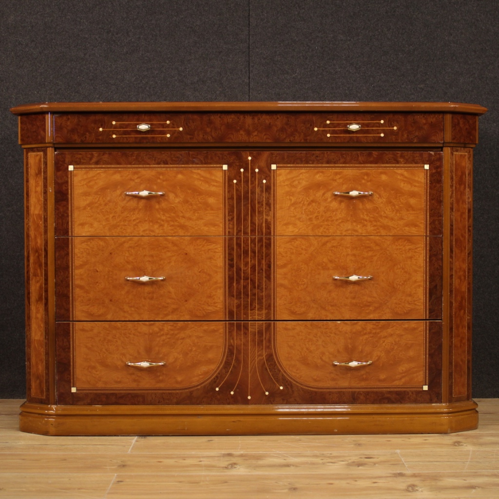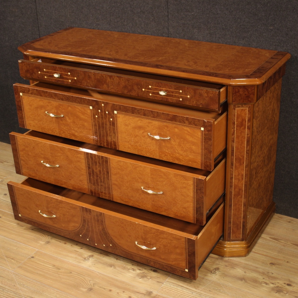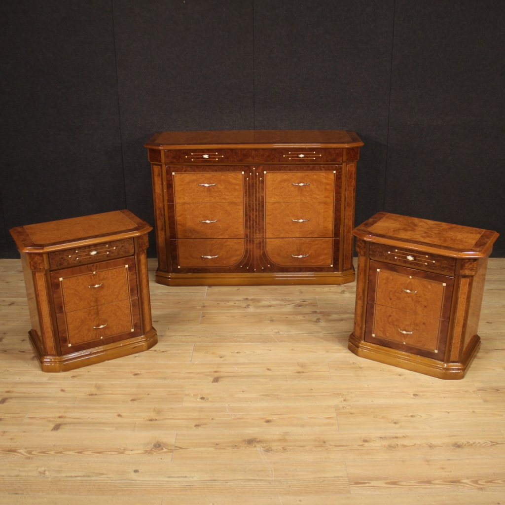 Chest of drawers of Italian production of the late twentieth century. Furniture veneered in walnut, burl, rosewood, faux mother of pearl, ebonized wood, beech and fruitwood. Dresser for bedroom or living room of beautiful size and pleasant decor. Furniture equipped with 4 drawers of excellent capacity and service. Wooden top in character. Chest of drawers that is part of a complete set with bedside tables (see photo and ask for the bulk price if available). It shows some signs of wear overall in good state of conservation.