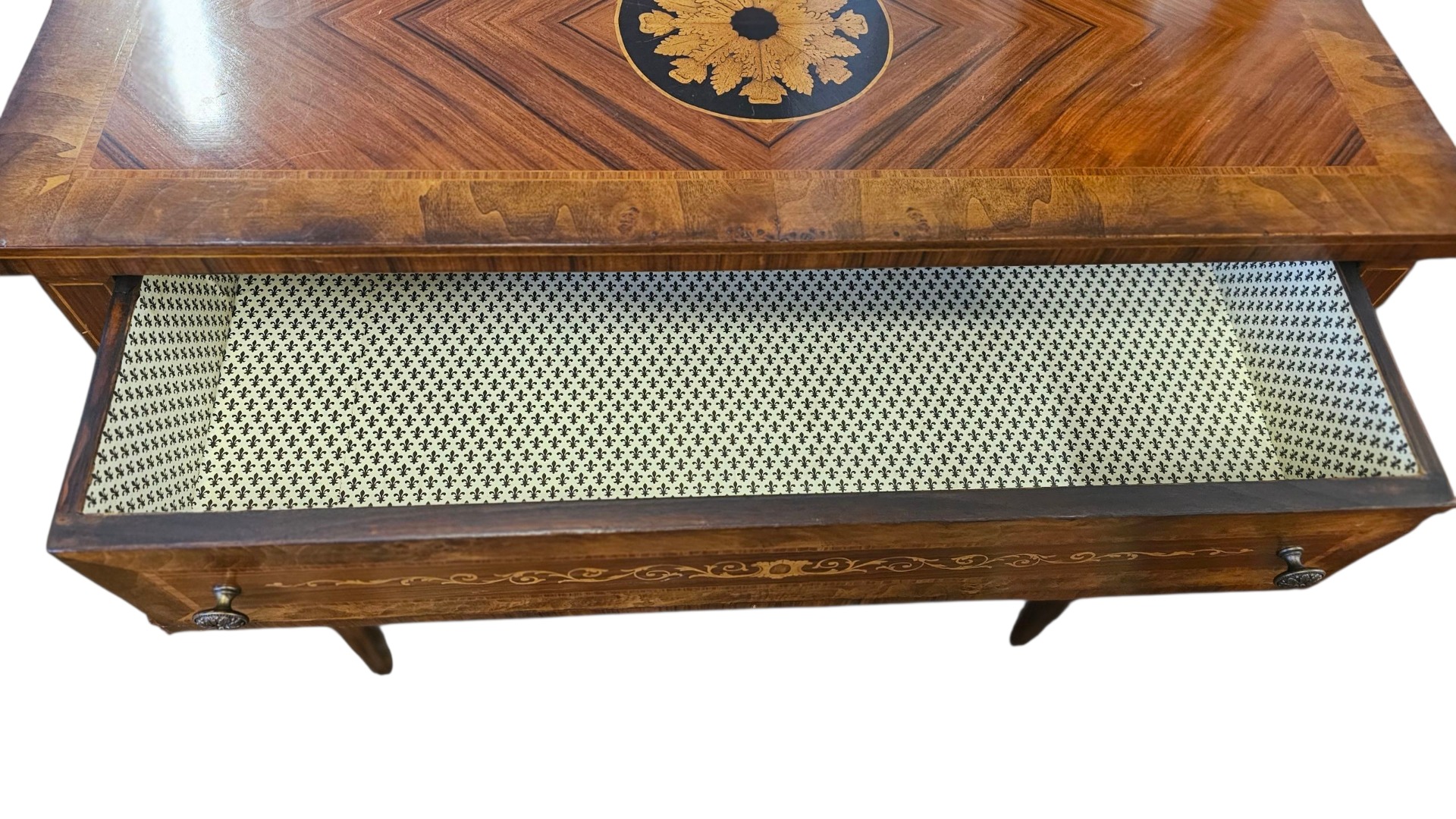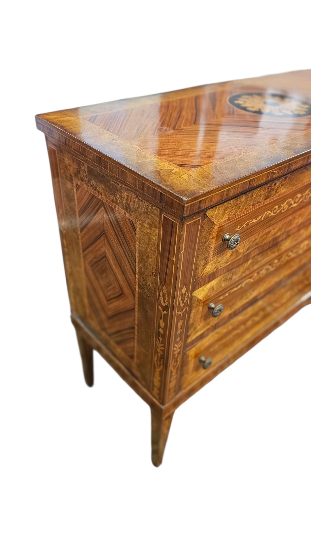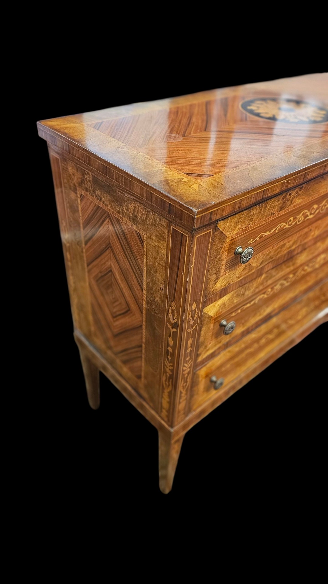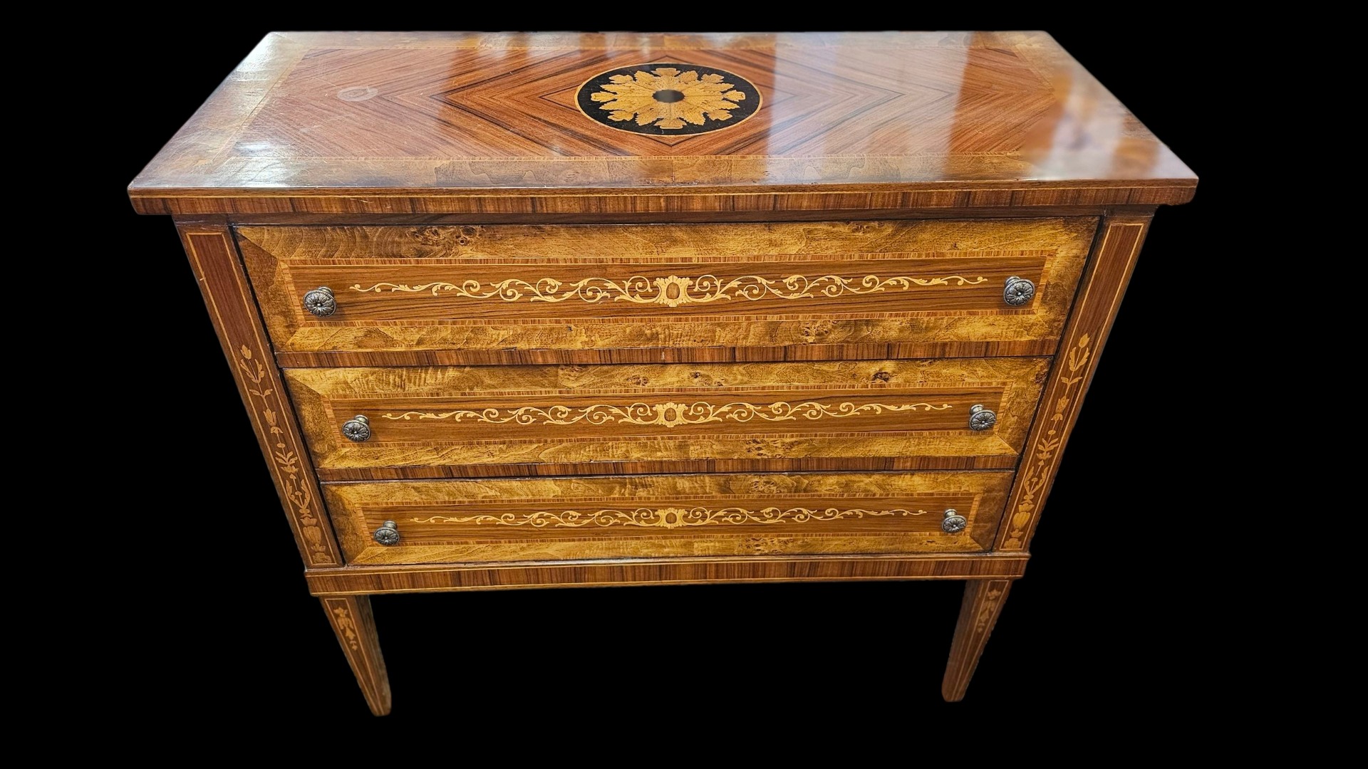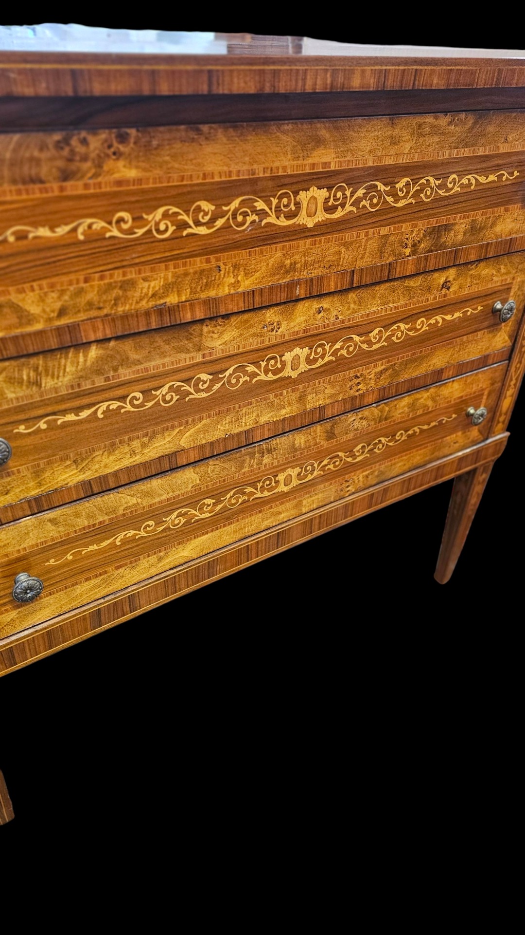 Lombard chest of drawers made of walnut root with inlaid decorations. Inverted pyramid feet. Dimensions: width one meter, depth forty centimeters, height eighty-five centimeters. Early twentieth century.