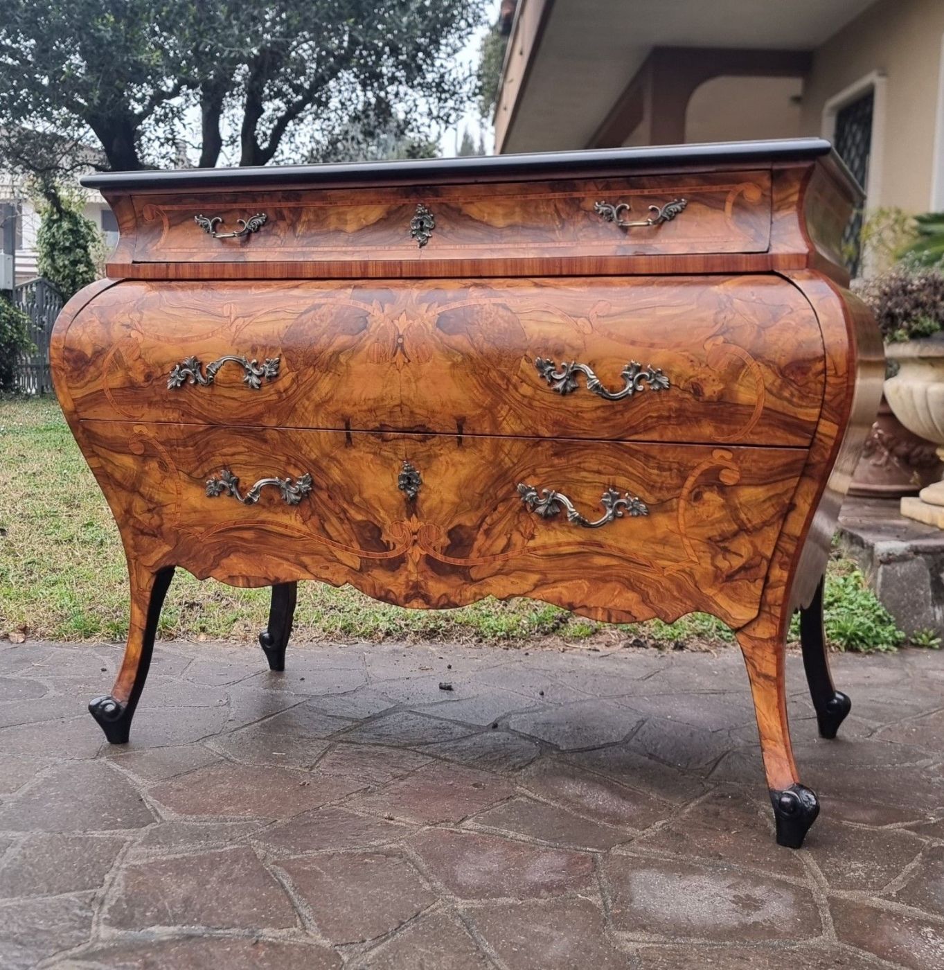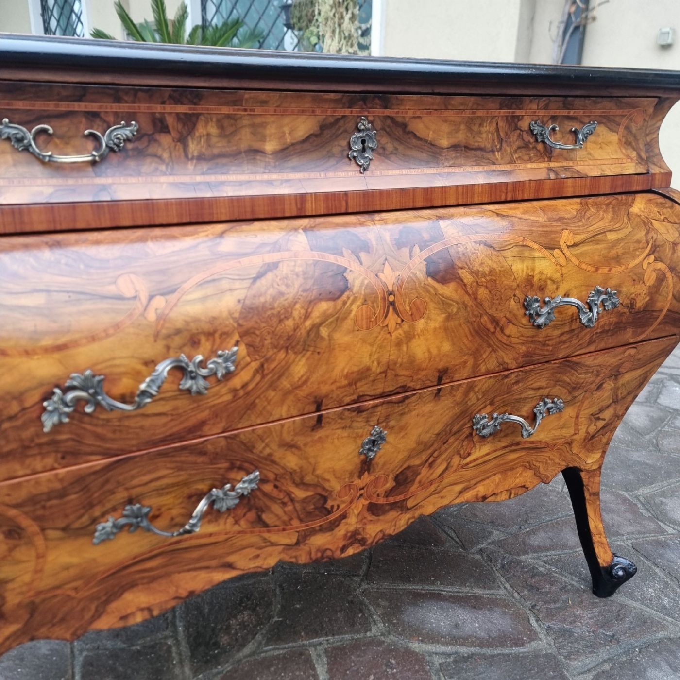 This Louis XV style chest of drawers is not just a piece of furniture, but a piece of history that conveys the refined taste of 19th-century Lombard homes. The fine inlays and bombé finishes demonstrate the care and attention to detail typical of the era. It is the ideal furnishing complement for those who appreciate the charm of the past and wish to bring home a piece of art that has spanned the centuries.