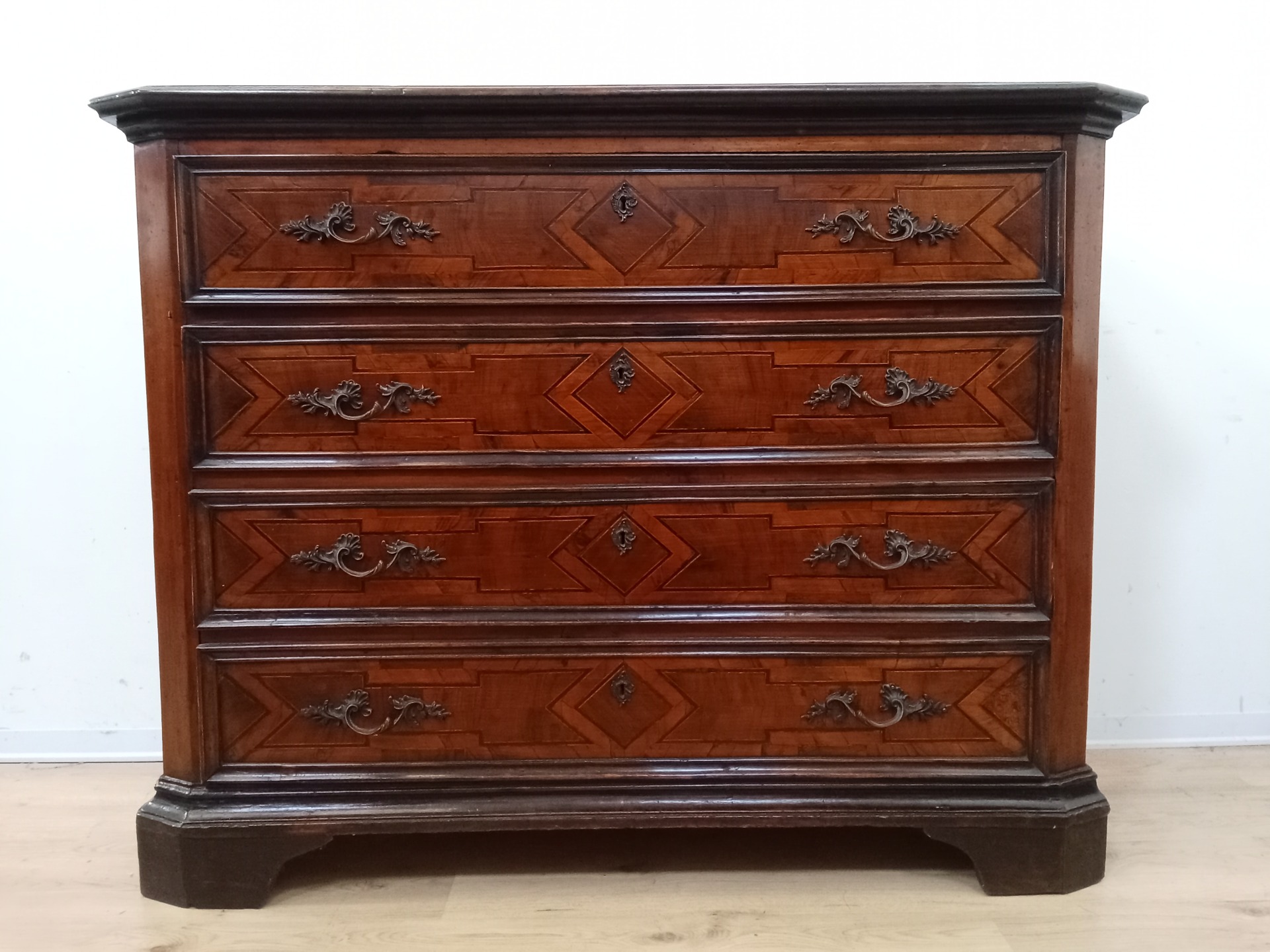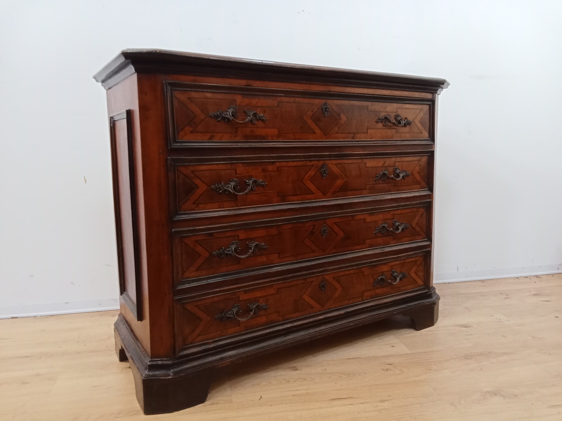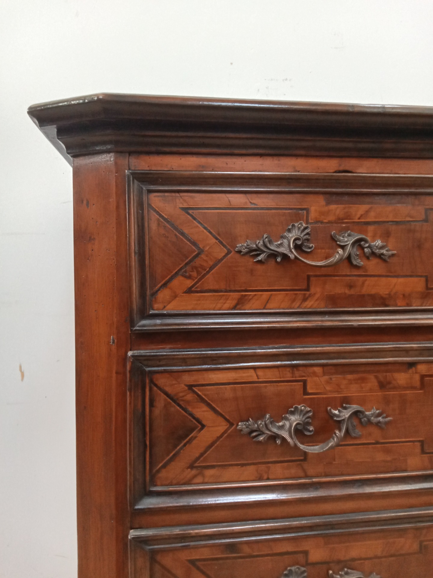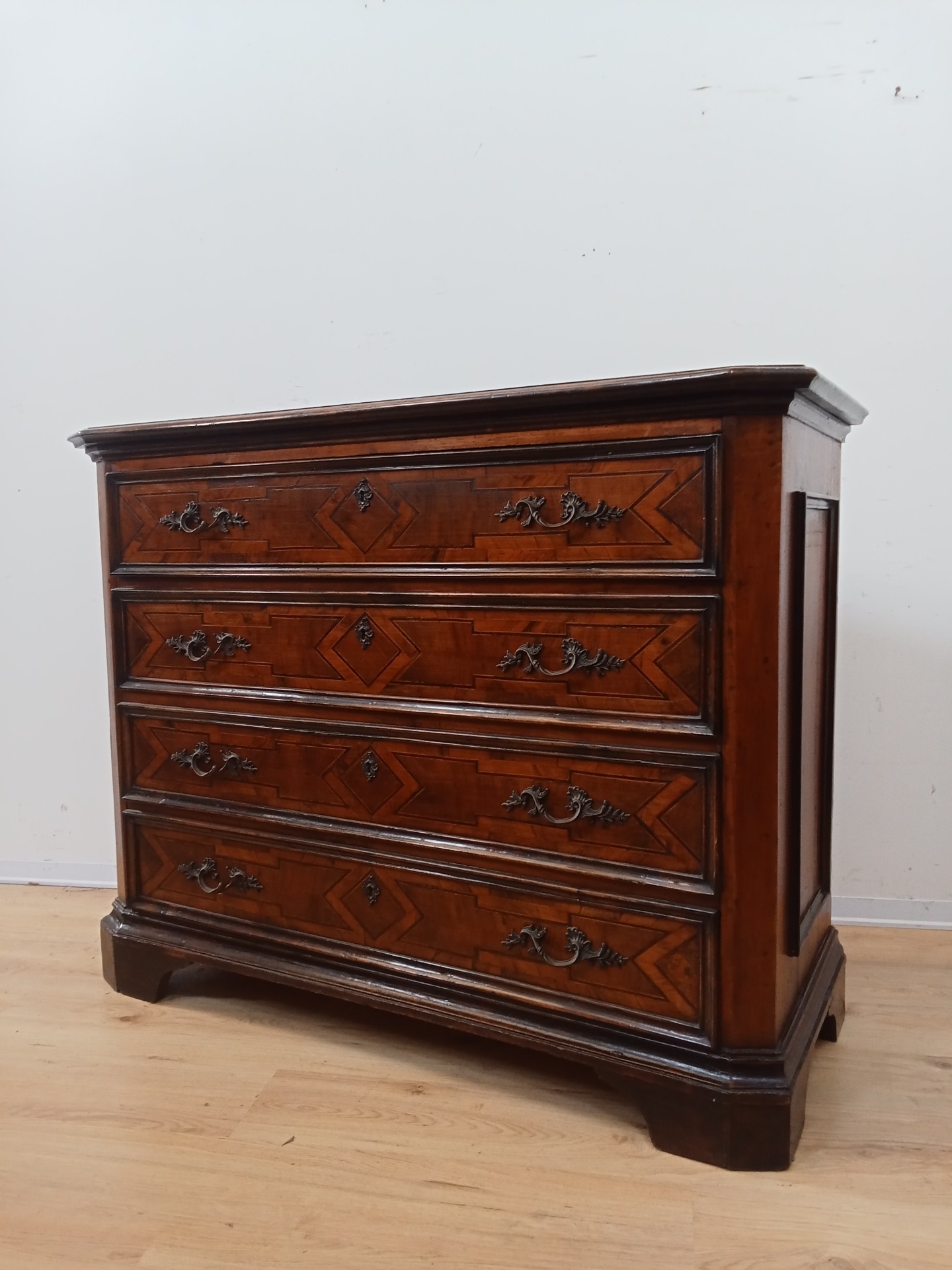 Lombard canterano chest of drawers in solid walnut with four drawers with threaded and inlaid fronts, sides also enriched with inlay, shaped bracket feet, canted uprights.