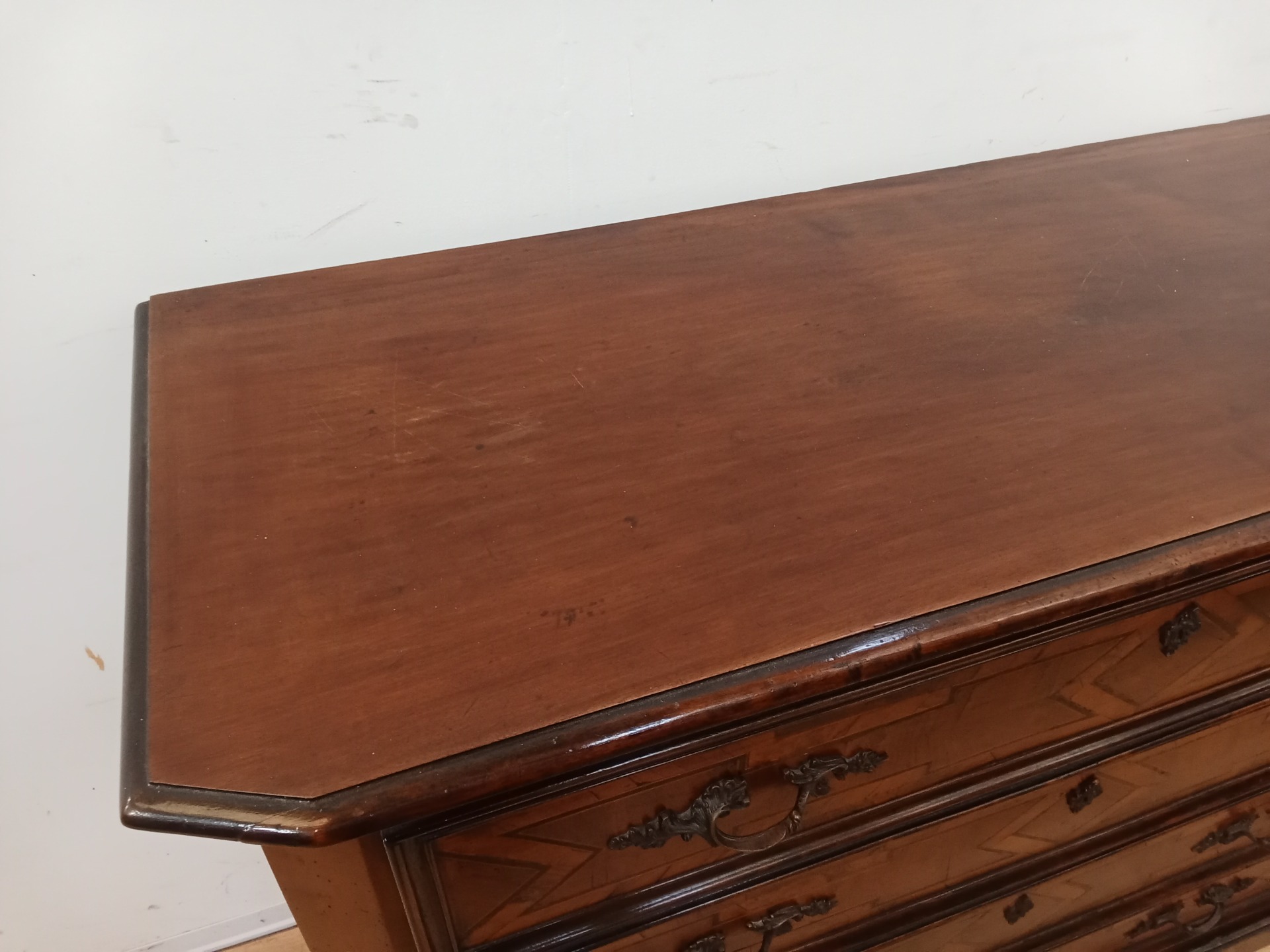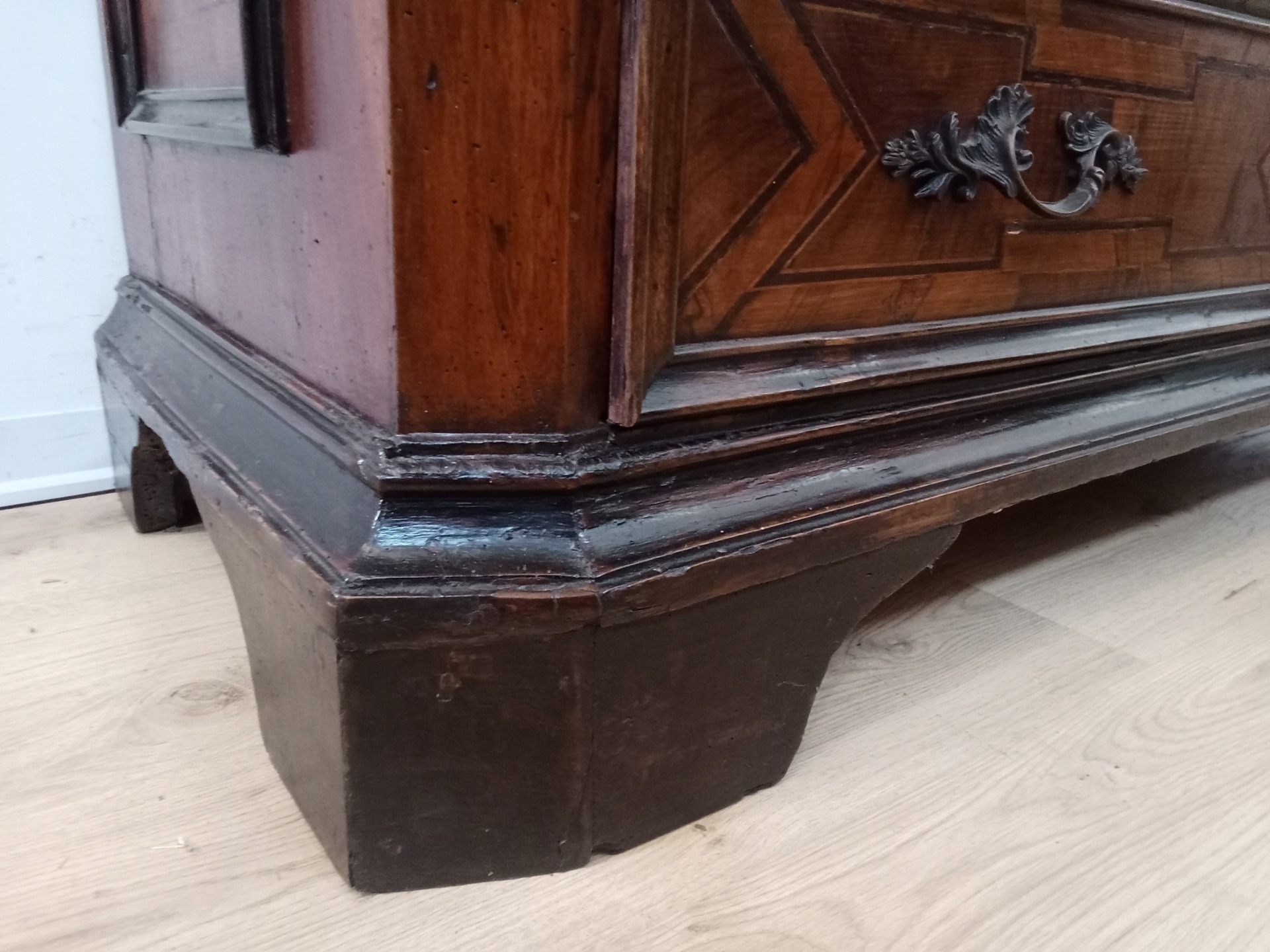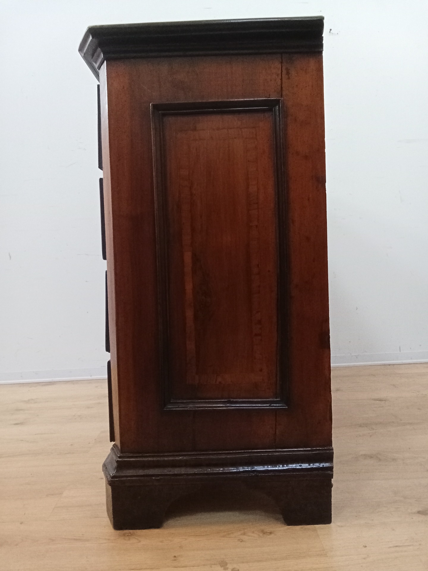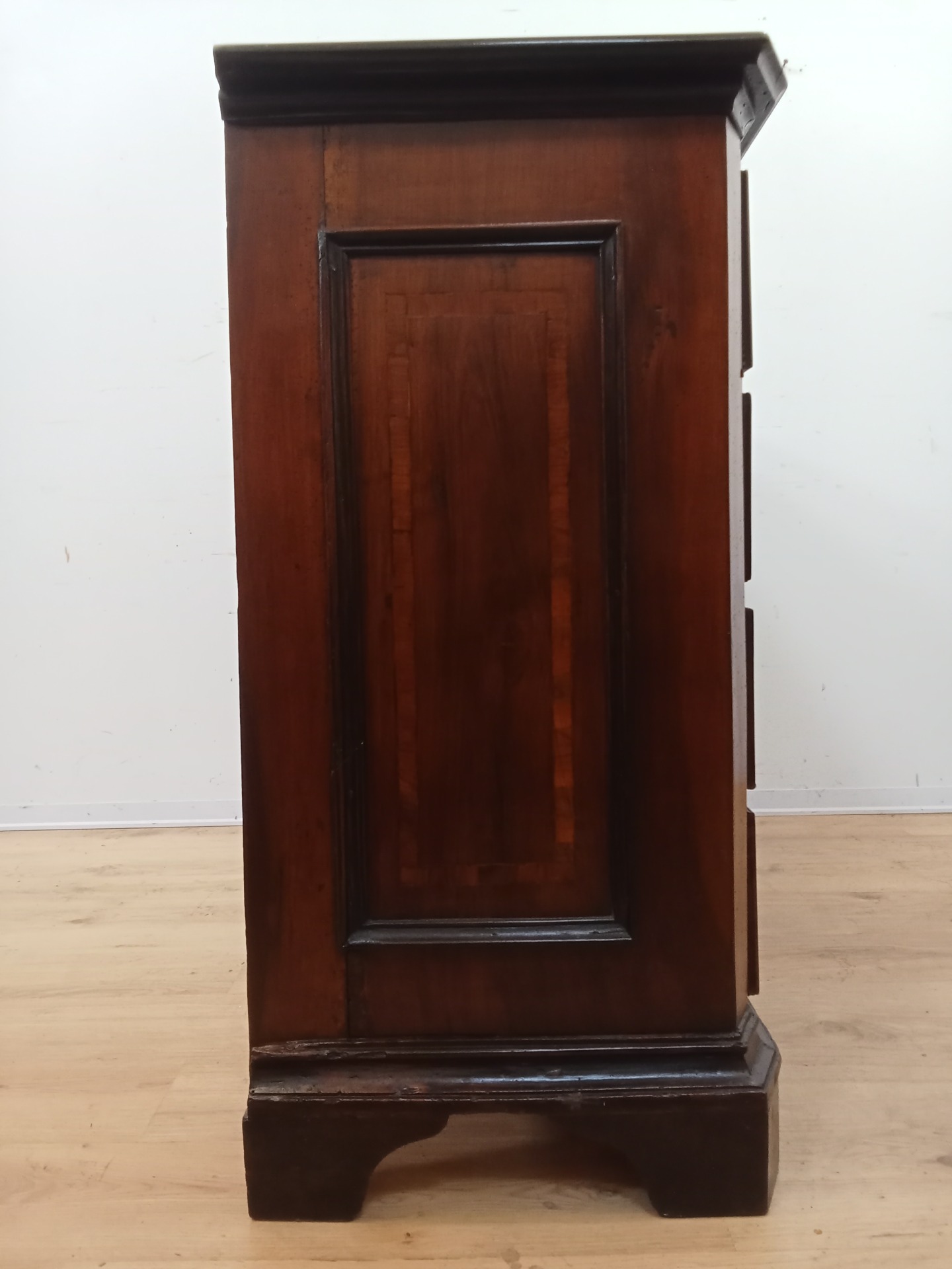 Lombard canterano chest of drawers in solid walnut with four drawers with threaded and inlaid fronts, sides also enriched with inlay, shaped bracket feet, canted uprights.